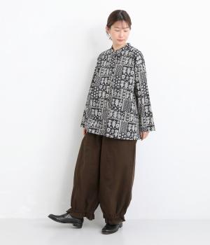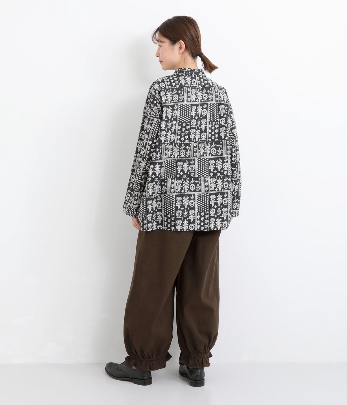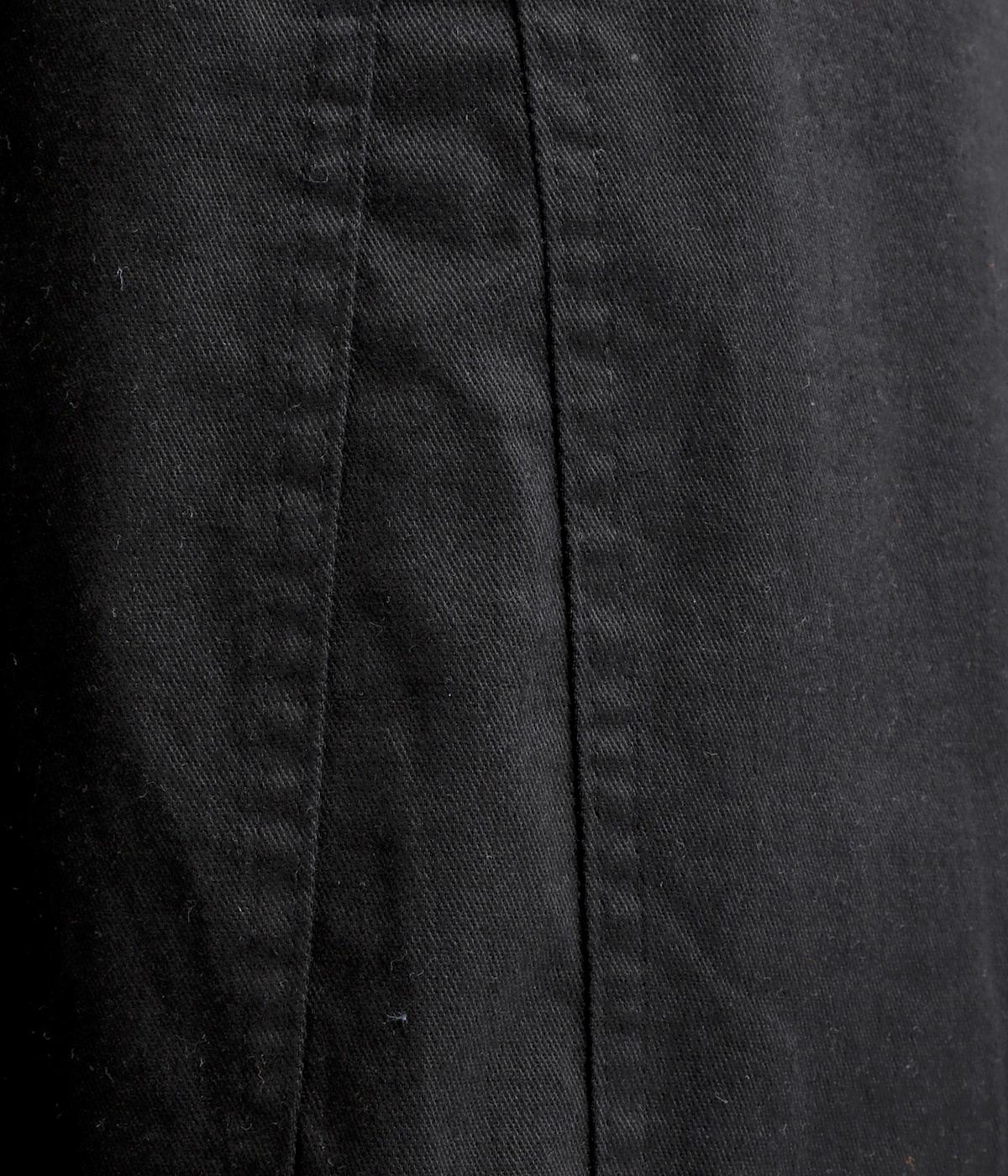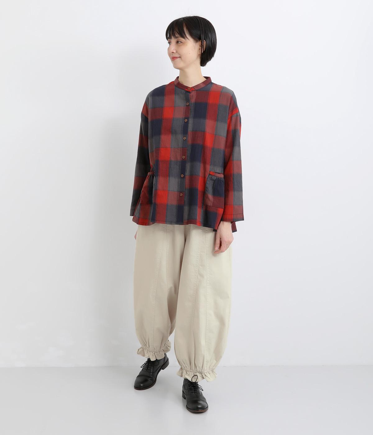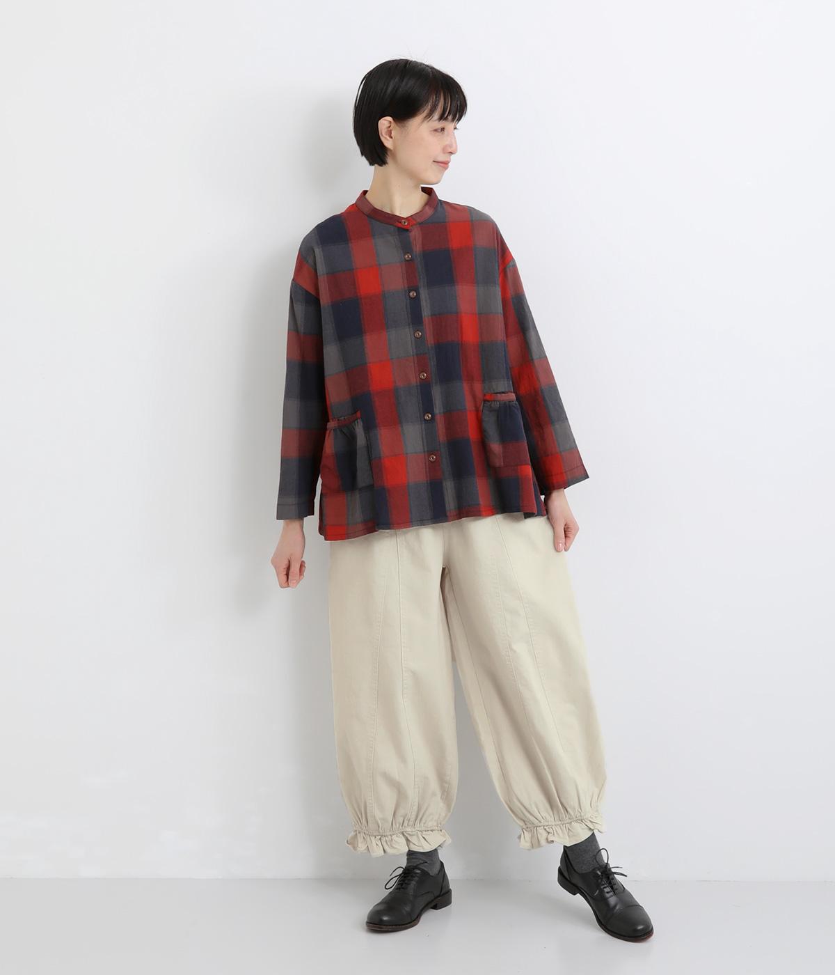 ほどよい厚みのコットンツイル生地を使用しました。しなやかな肌ざわりとナチュラルな風合いが魅力です。やわらかなハリがシルエットをきれいに保ちます。