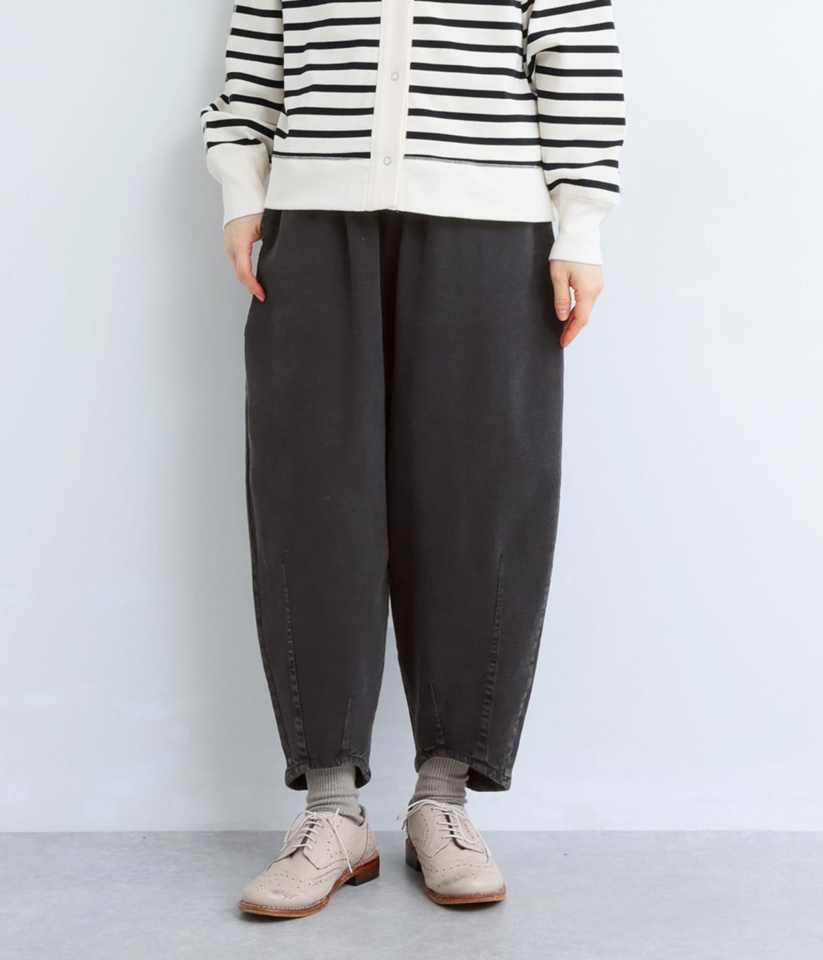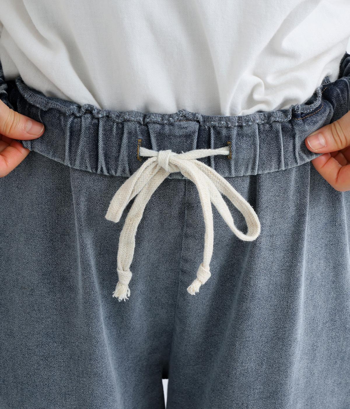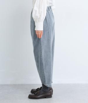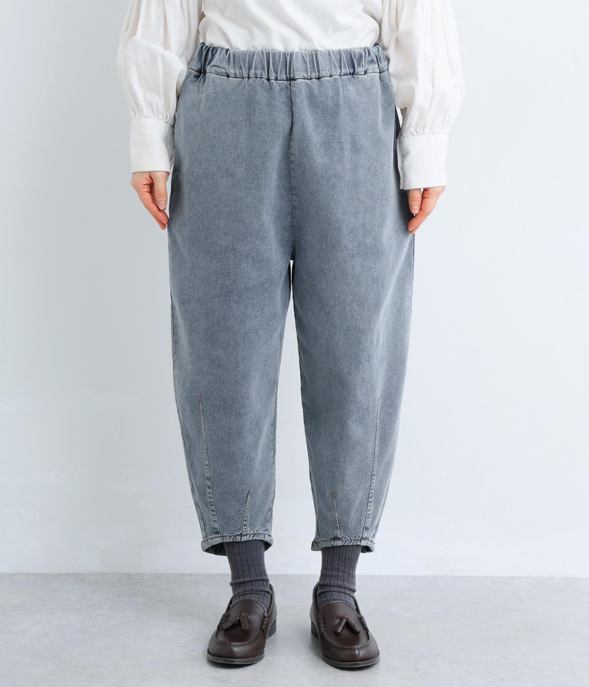 ヴィンテージライクなほどよい色落ち感が特徴的なパンツです。裾にダーツを入れて、足元をすっきりと仕上げた好バランスなシルエット。ウエストはお腹にほどよくフィットする総ゴム仕様で、内紐で調節もできます。
