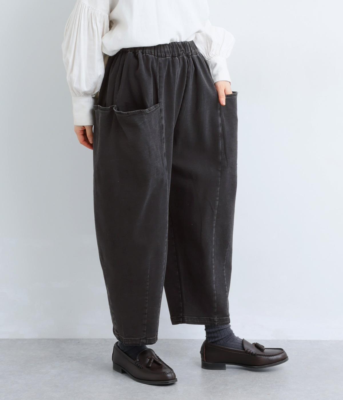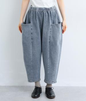 ヴィンテージライクな、色落ち感が特徴的なパンツです。両サイドにポケットをあしらい、実用性と目を惹くポイントに。ウエストは着脱が楽なオールゴム仕立てで、内側の紐で調節も可能です。