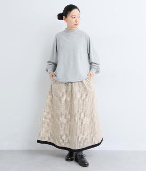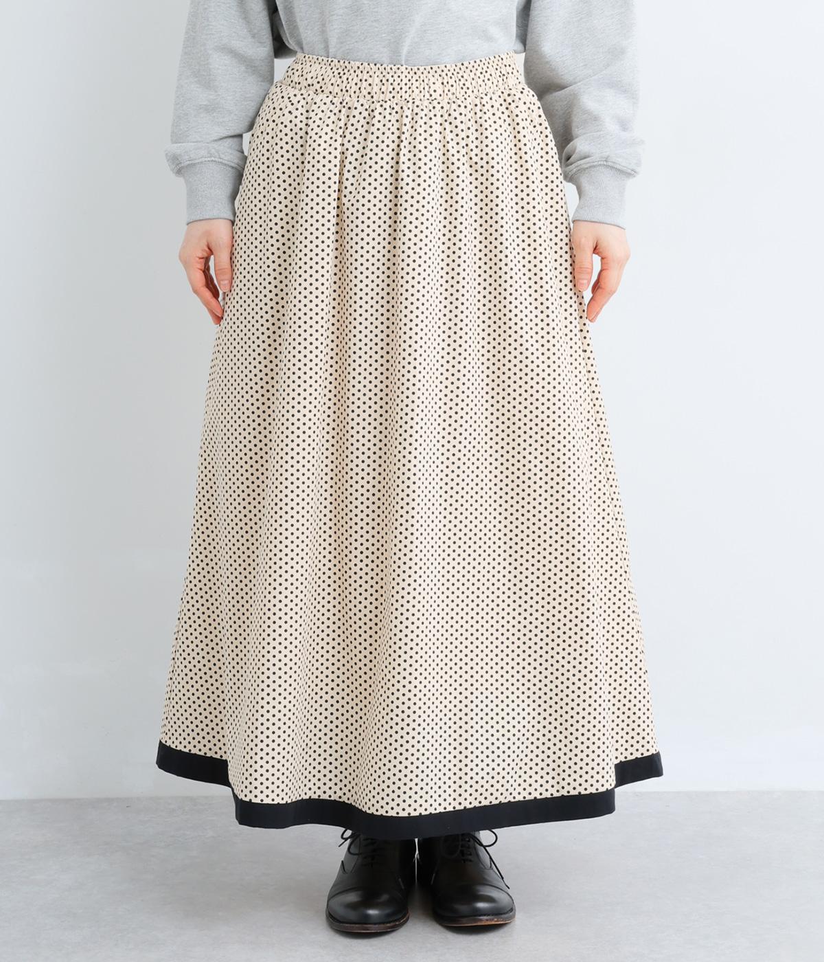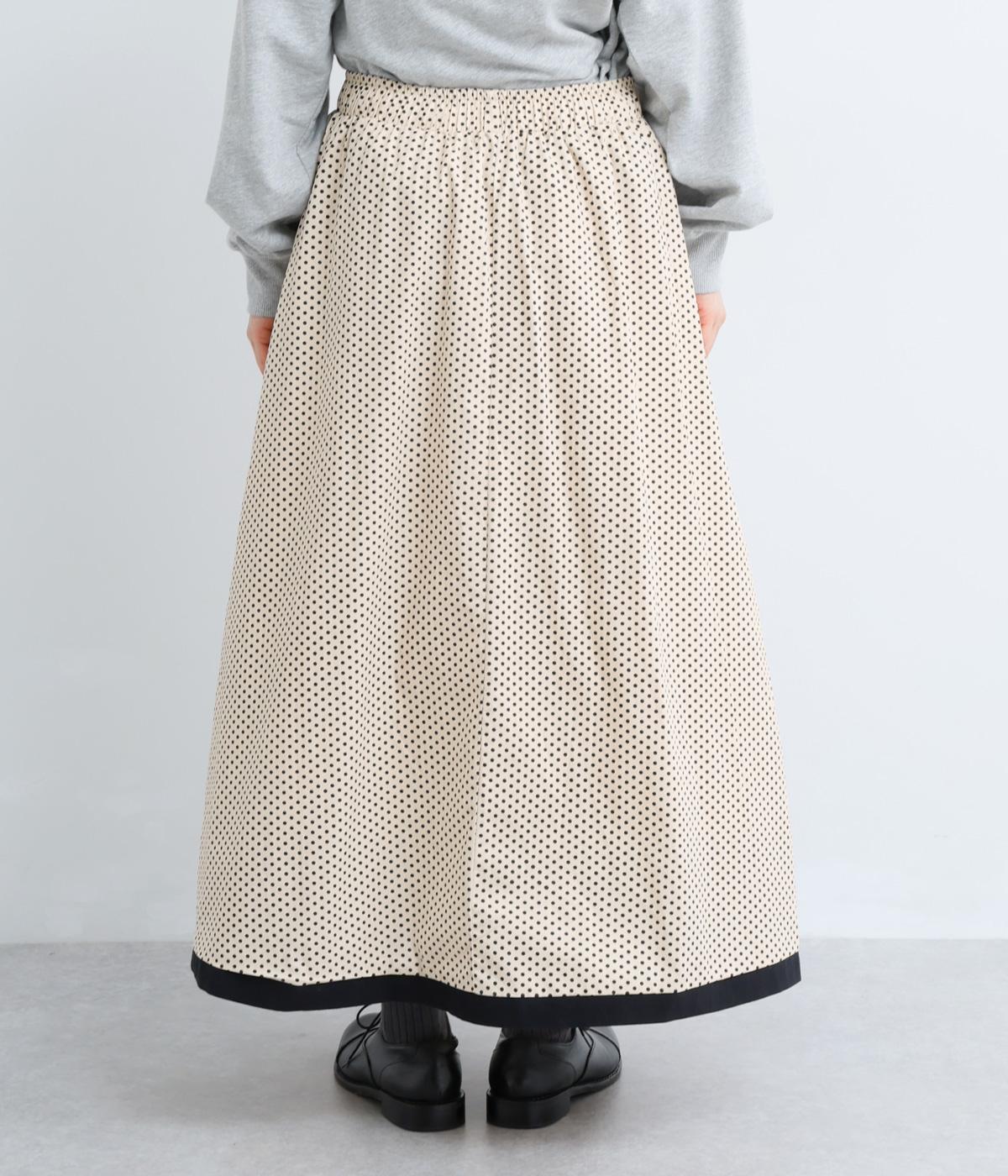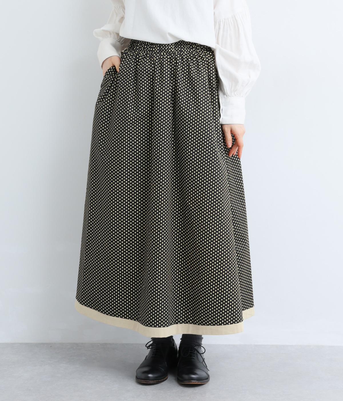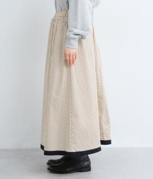 裾を別地で切り替えてアクセントを加えた、ロング丈のフレアスカートです。ウエストギャザーが映える立体的なシルエット。楽に着脱ができるウエストゴム仕立てで、内側の紐で調節をすることもできます。