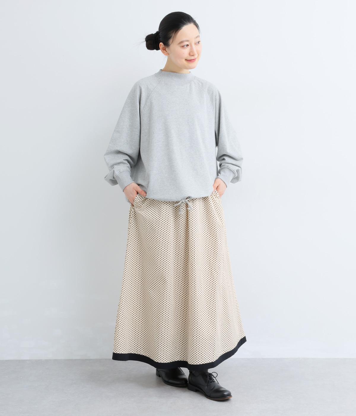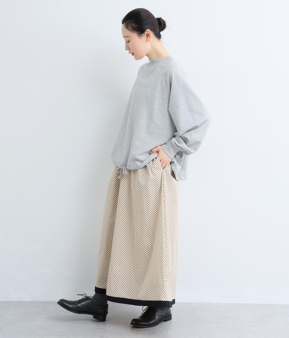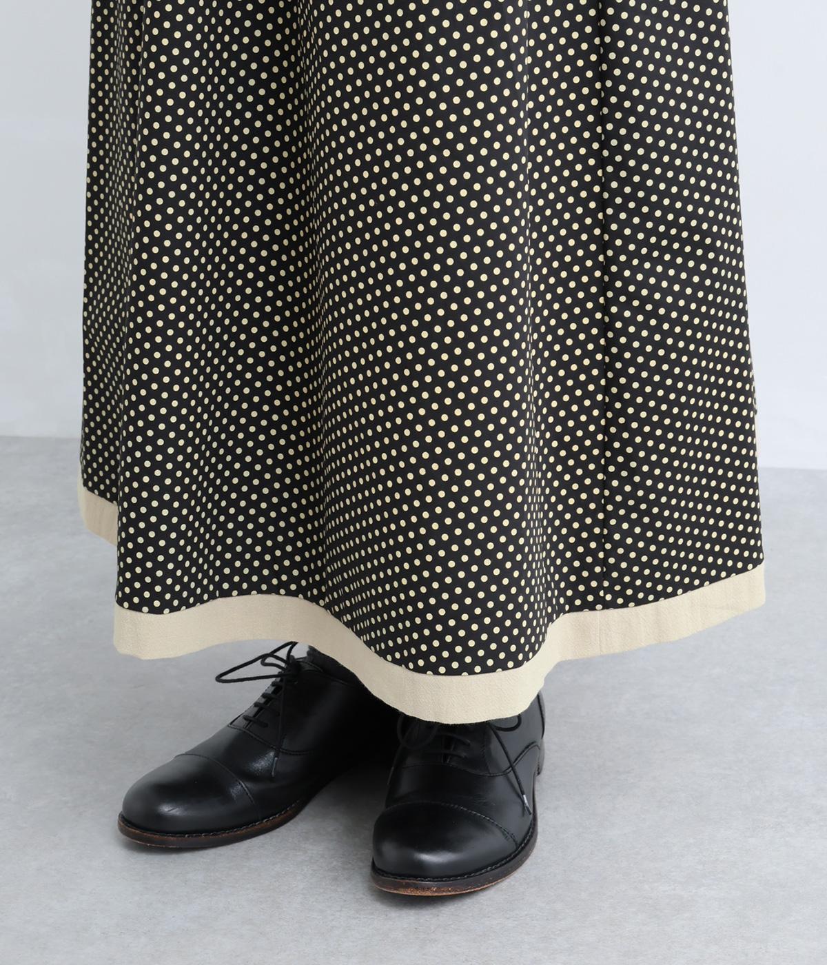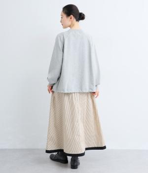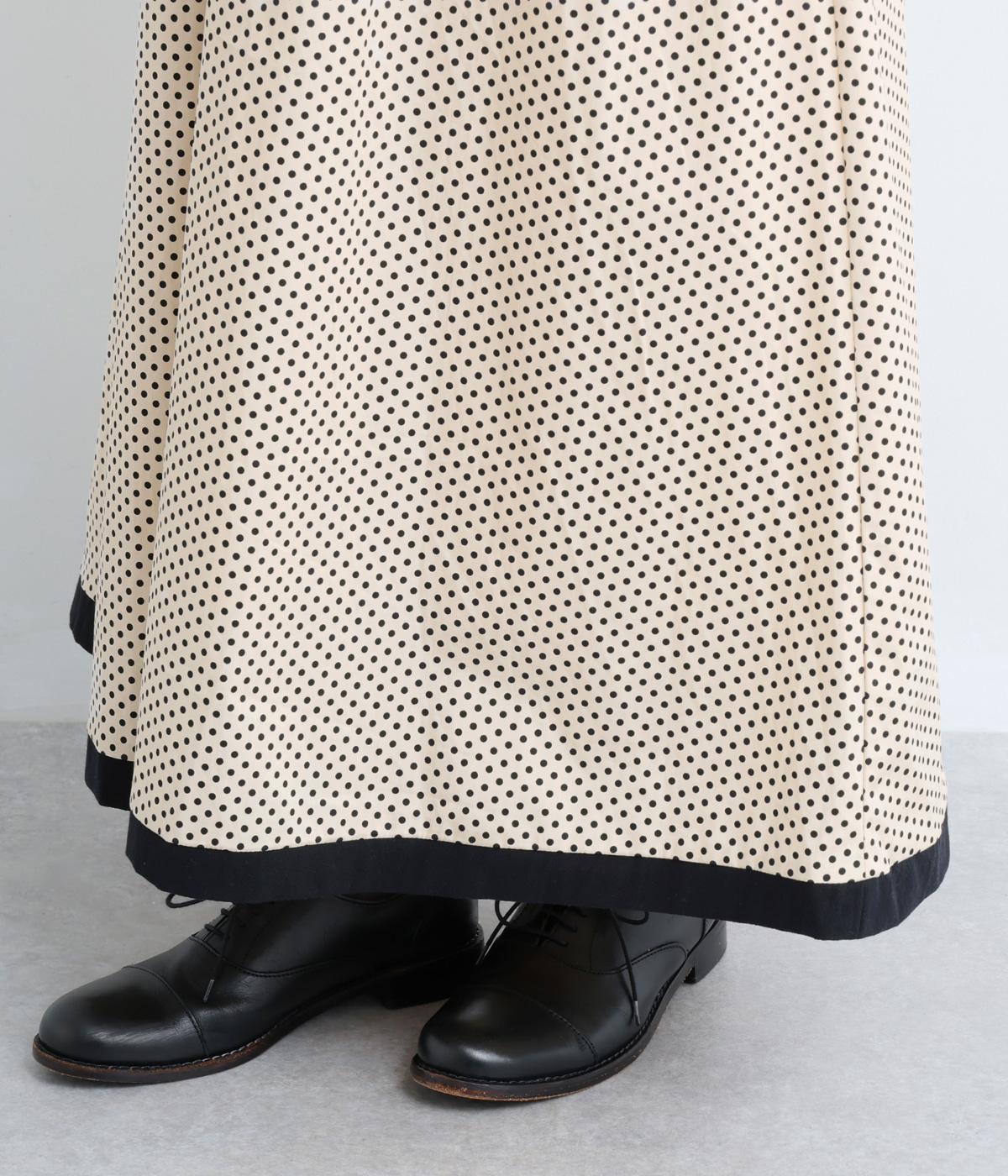 裾を別地で切り替えてアクセントを加えた、ロング丈のフレアスカートです。ウエストギャザーが映える立体的なシルエット。楽に着脱ができるウエストゴム仕立てで、内側の紐で調節をすることもできます。
