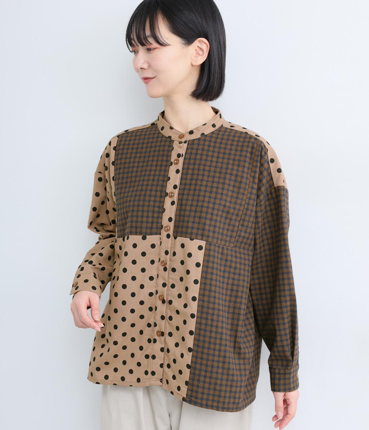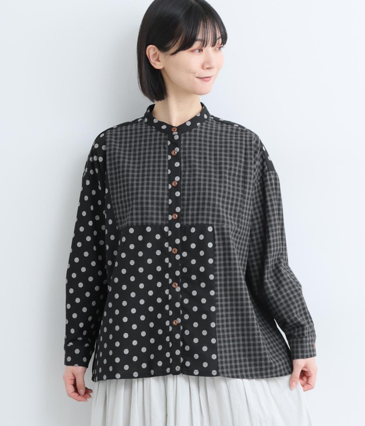 印象の異なる2種類の柄を使って切り替えた、アシンメトリーなシャツです。バンドカラーが全体をすっきりと見せてくれるので、甘くなりすぎないのがポイントに。身幅にゆとりをもたせたリラクシーな着心地で、羽織りものとして合わせるのもおすすめです。