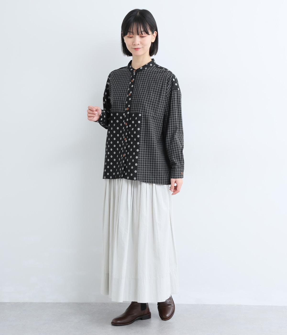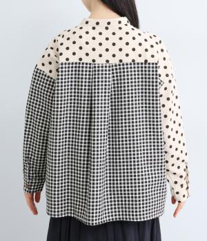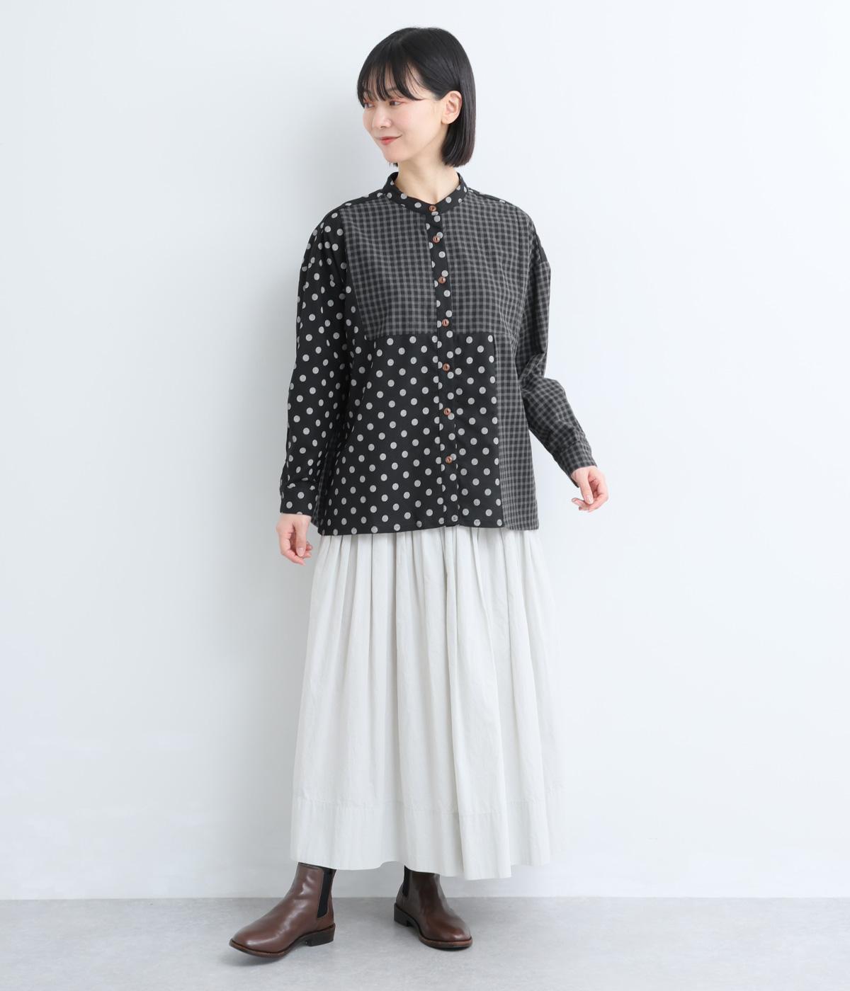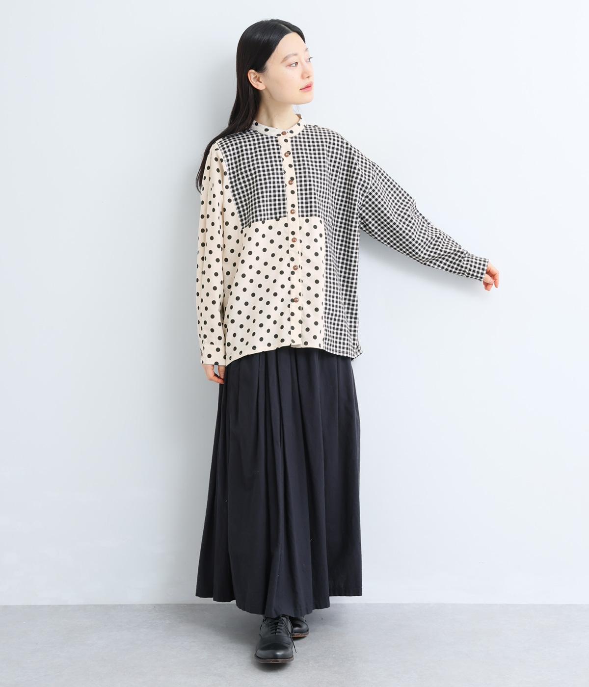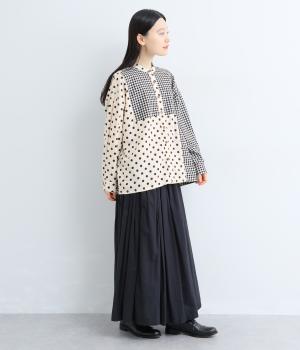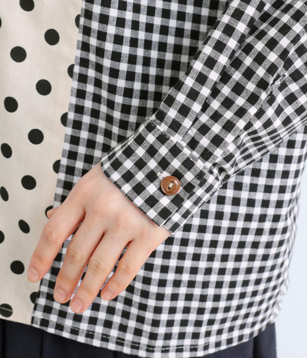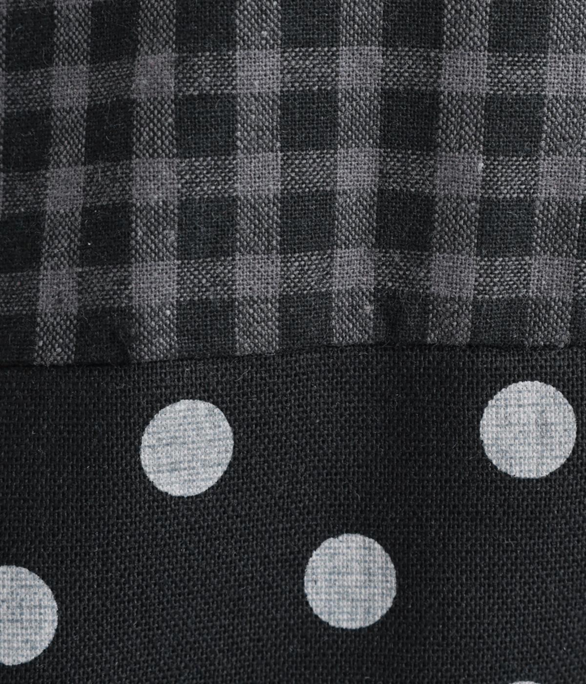 ドット柄はややハリをもたせたレーヨン混紡の綿麻素材を、チェック柄はナチュラル感のあるやわらかな質感の綿素材を使ったドッキング仕立てです。