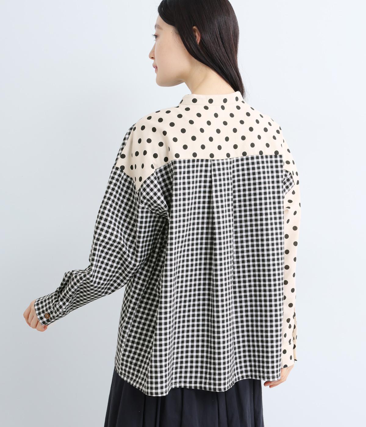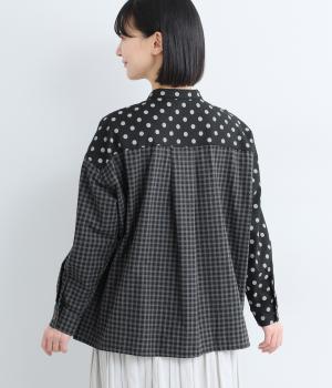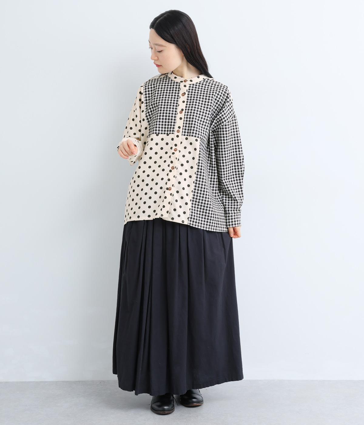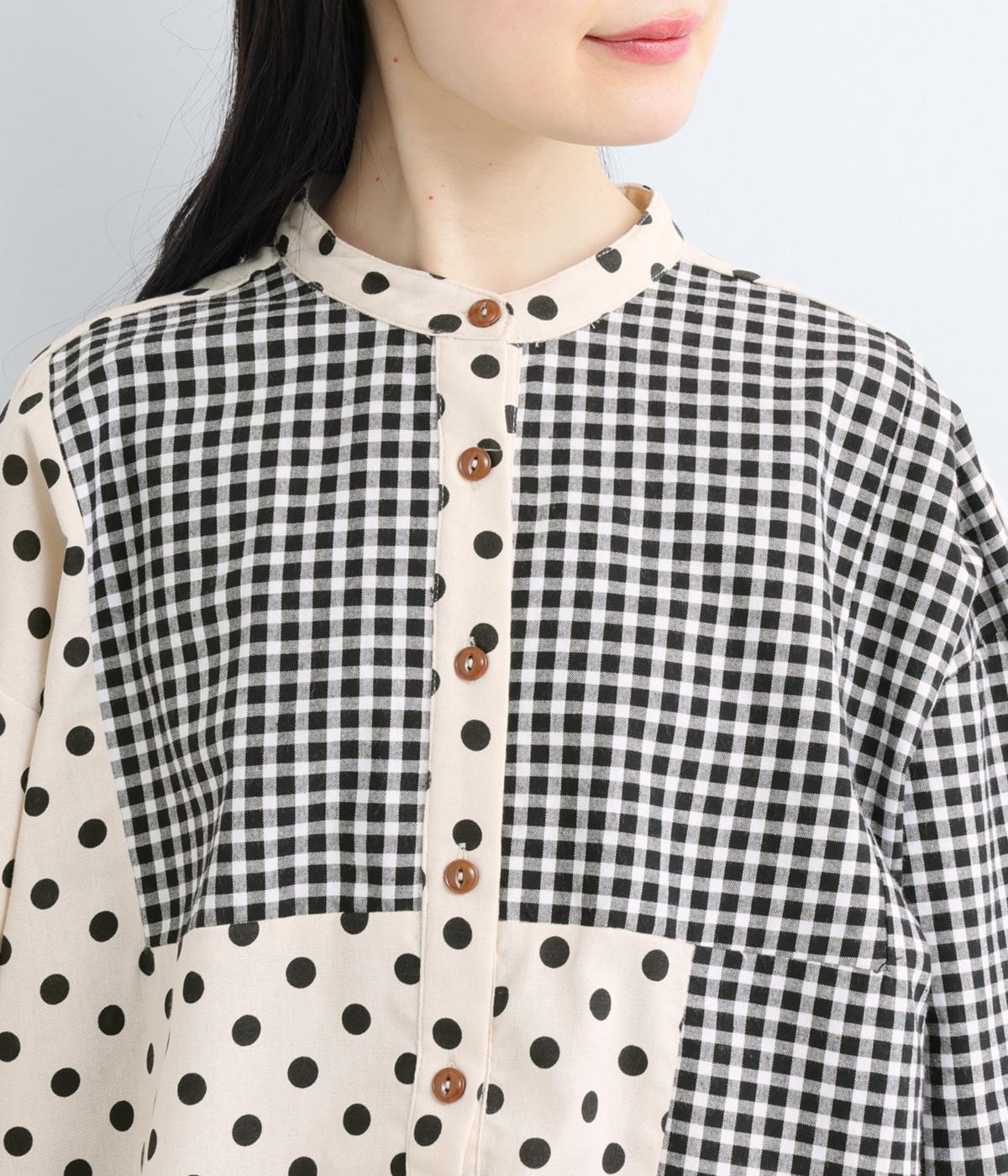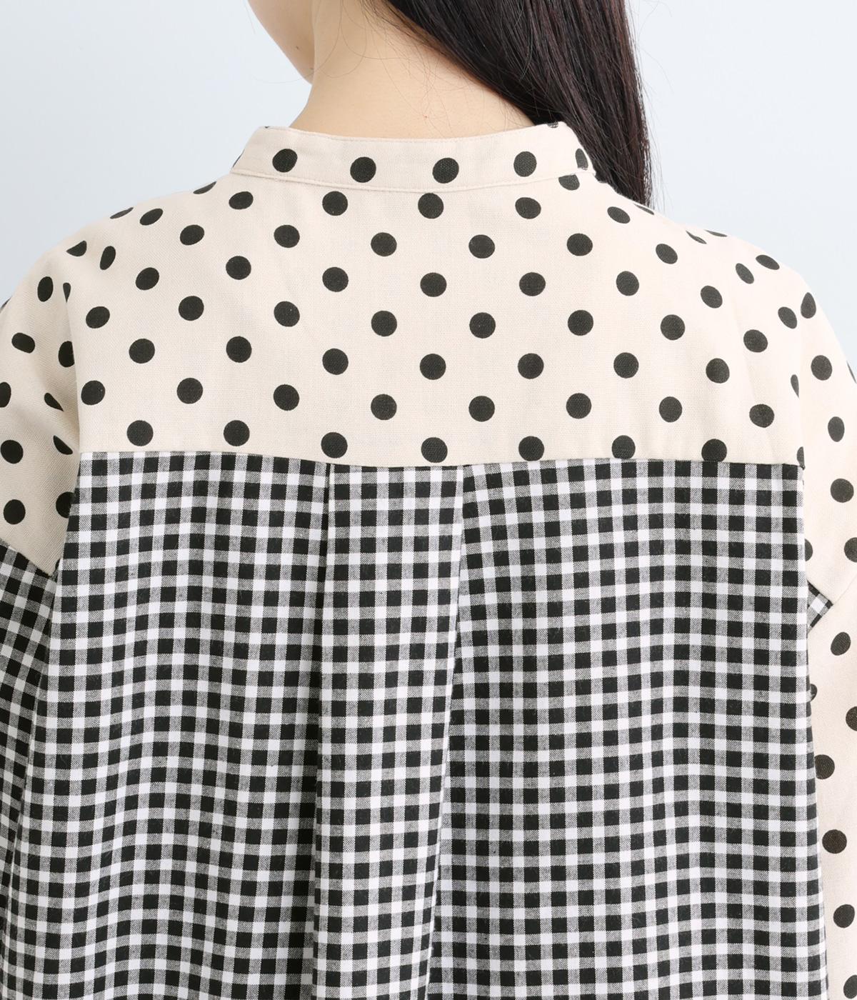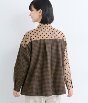 ドット柄はややハリをもたせたレーヨン混紡の綿麻素材を、チェック柄はナチュラル感のあるやわらかな質感の綿素材を使ったドッキング仕立てです。