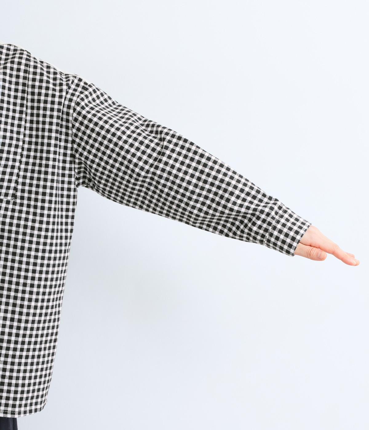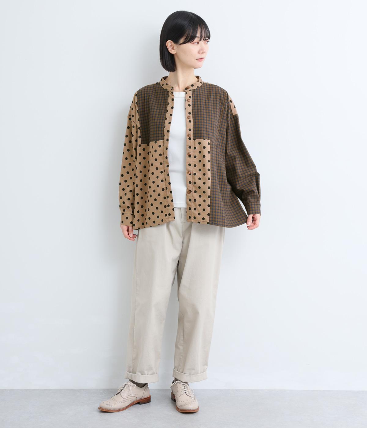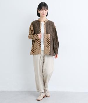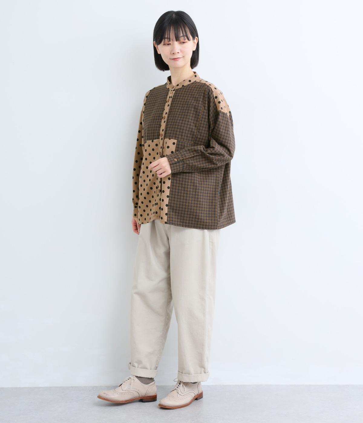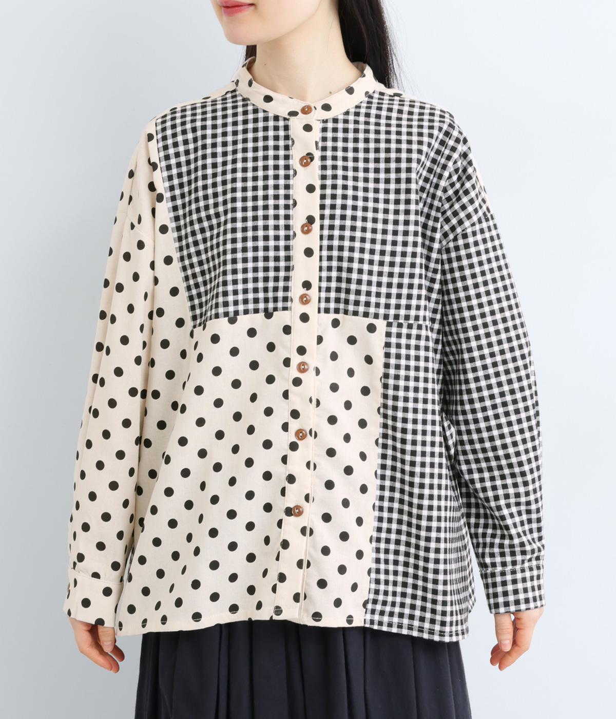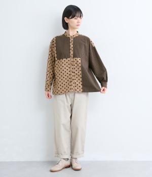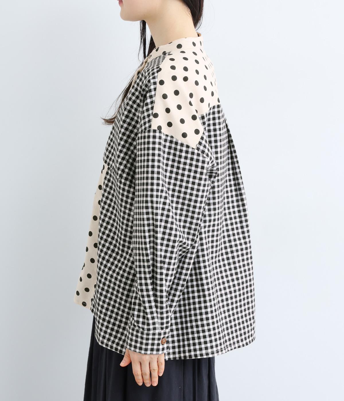 ドット柄はややハリをもたせたレーヨン混紡の綿麻素材を、チェック柄はナチュラル感のあるやわらかな質感の綿素材を使ったドッキング仕立てです。
