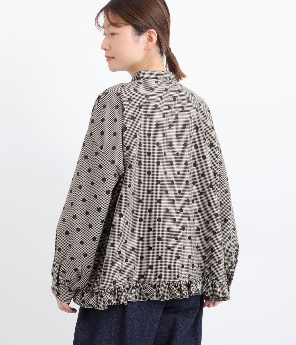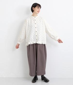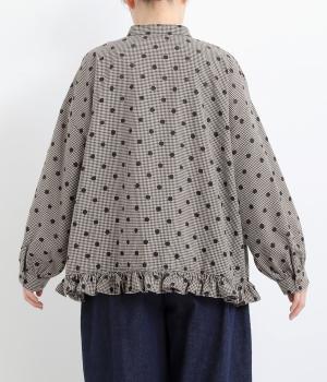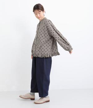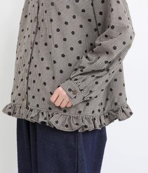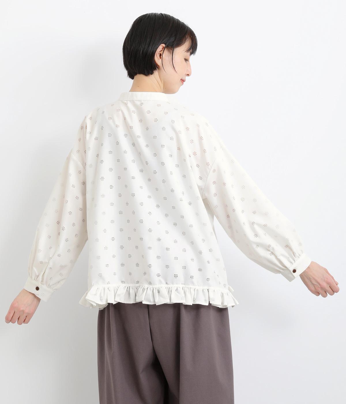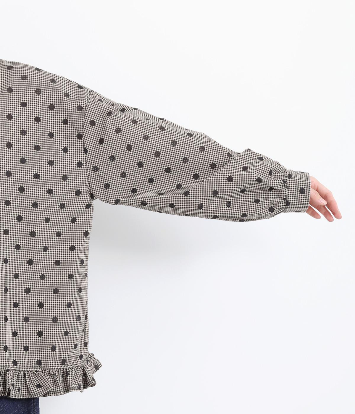透け感のあるドット柄が、ニュアンスのある表情をつくります。ゆったりとしたボックスシルエットの直線に、裾のフリルが華やかな立体感を添えます。ふんわりとやわらかな印象で、カジュアルにもきれいめにもマッチします。