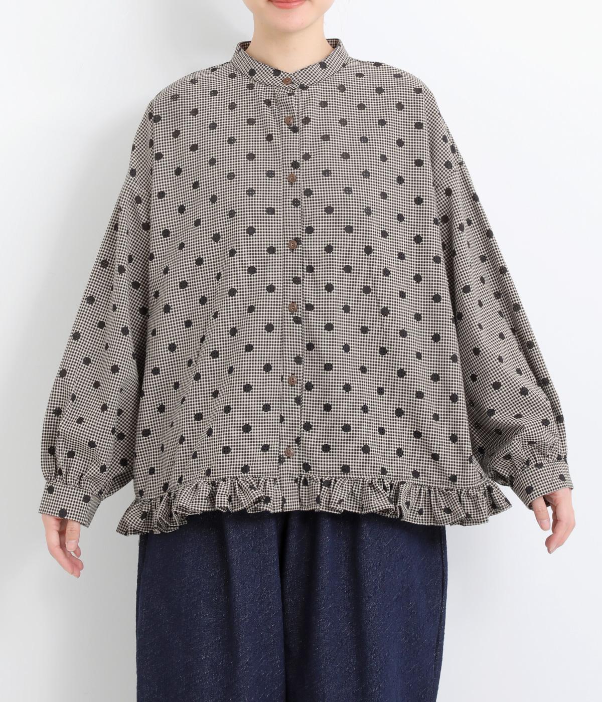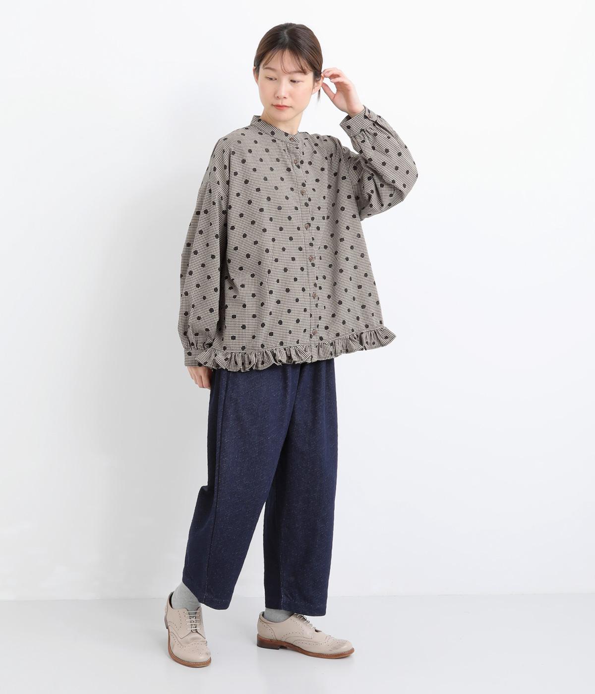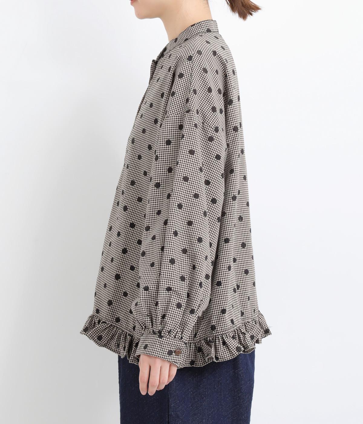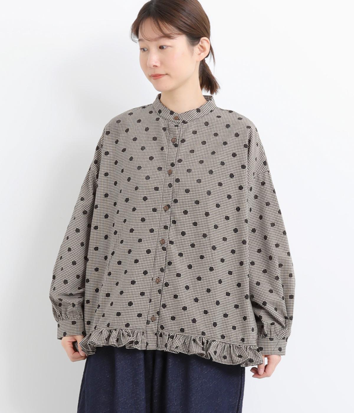 透け感のあるドット柄が、ニュアンスのある表情をつくります。ゆったりとしたボックスシルエットの直線に、裾のフリルが華やかな立体感を添えます。ふんわりとやわらかな印象で、カジュアルにもきれいめにもマッチします。