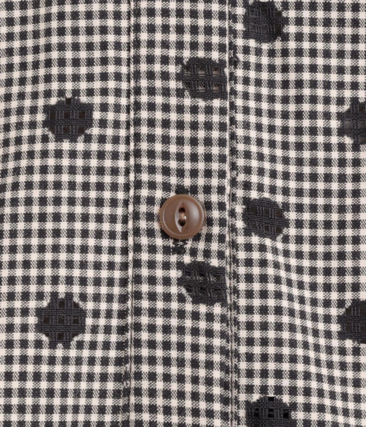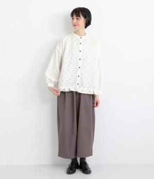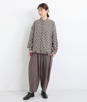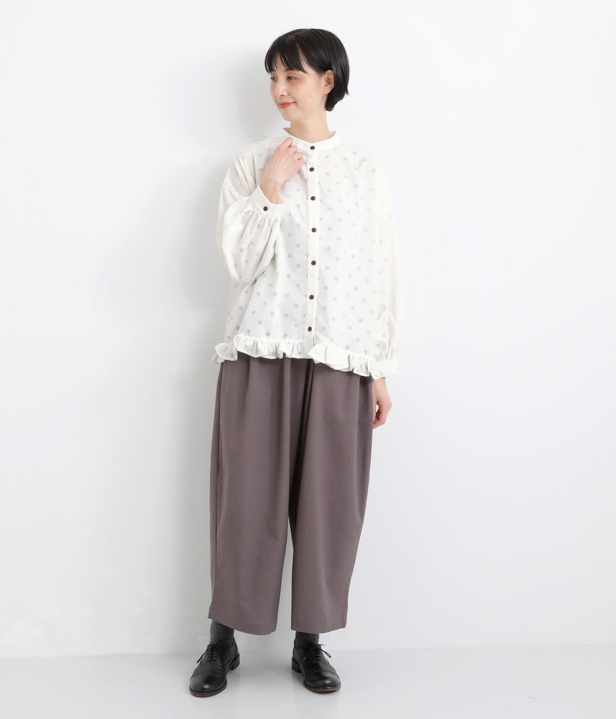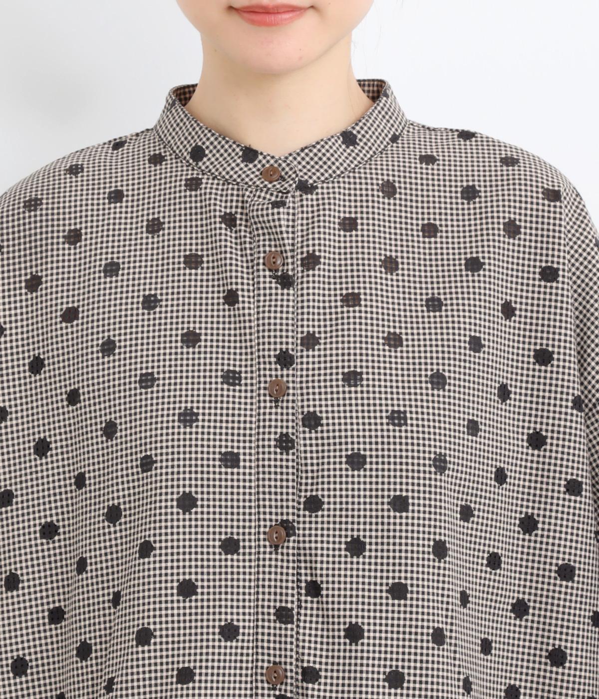 透け感のあるドット柄が、ニュアンスのある表情をつくります。ゆったりとしたボックスシルエットの直線に、裾のフリルが華やかな立体感を添えます。ふんわりとやわらかな印象で、カジュアルにもきれいめにもマッチします。