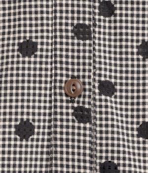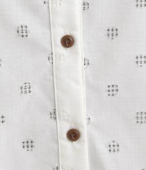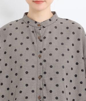 ナチュラルな風合いのコットン生地に、レースでドット柄をあしらいました。さらりとした手ざわりで、ふんわり軽やかな着心地の素材感です。