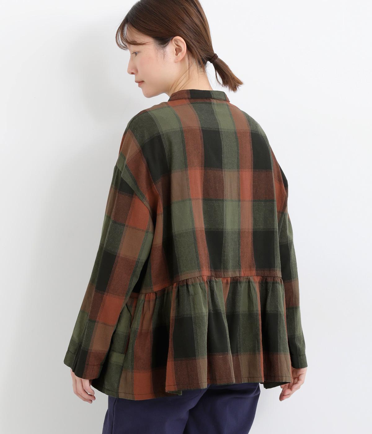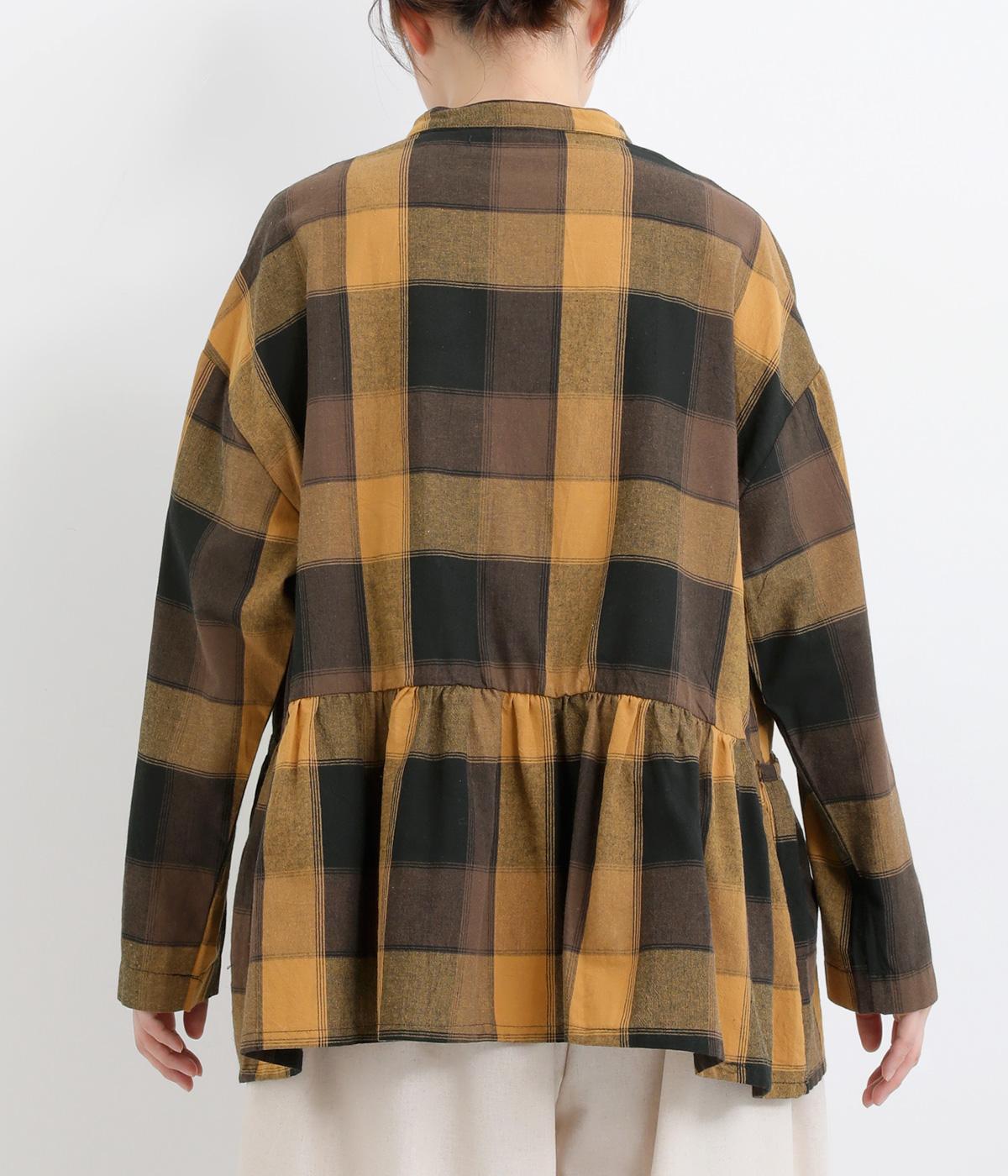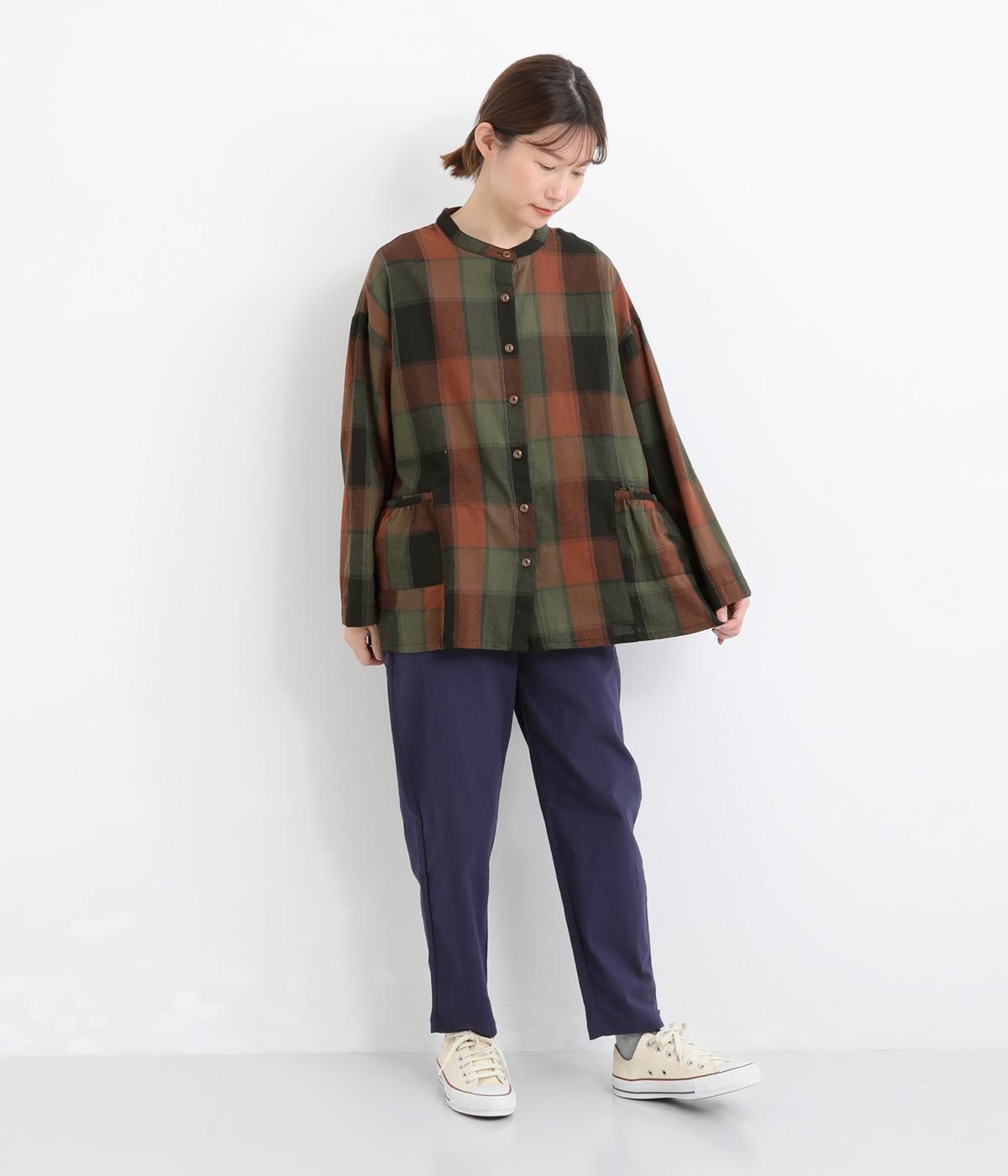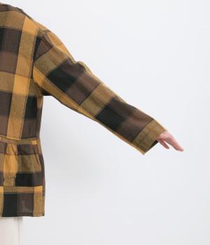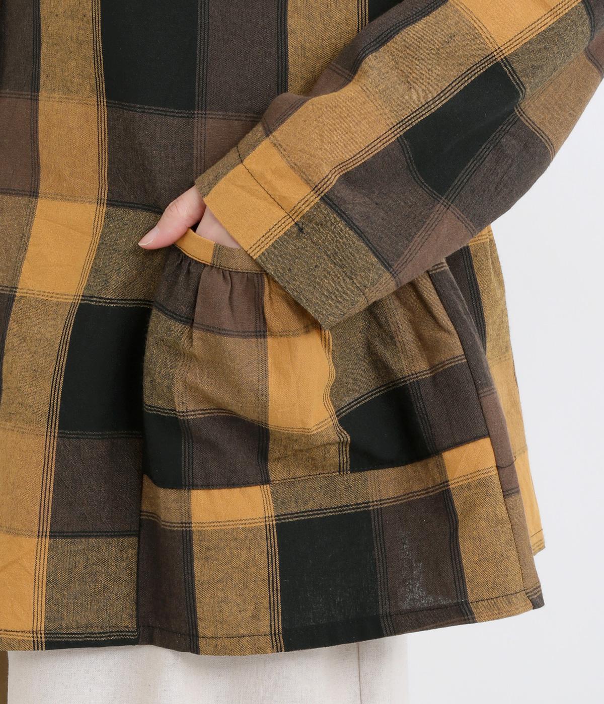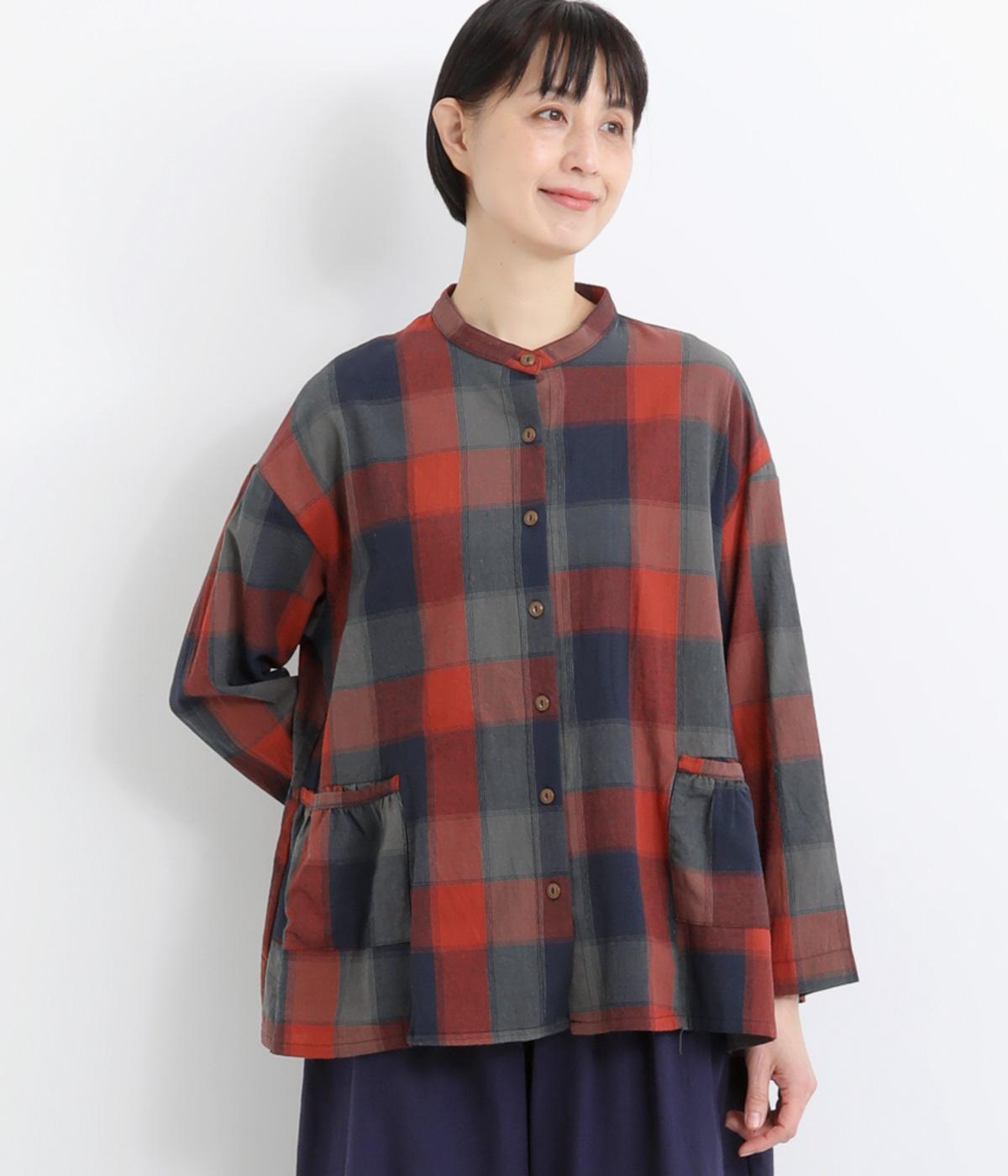 ニュアンスカラーのチェック柄が大人のカジュアルスタイルにぴったりなシャツです。腰まわりにほどこしたギャザーがふんわりと広がり、気になるヒップまわりをカバーします。立体的なポケットも、さりげなくアクセントを添えています。