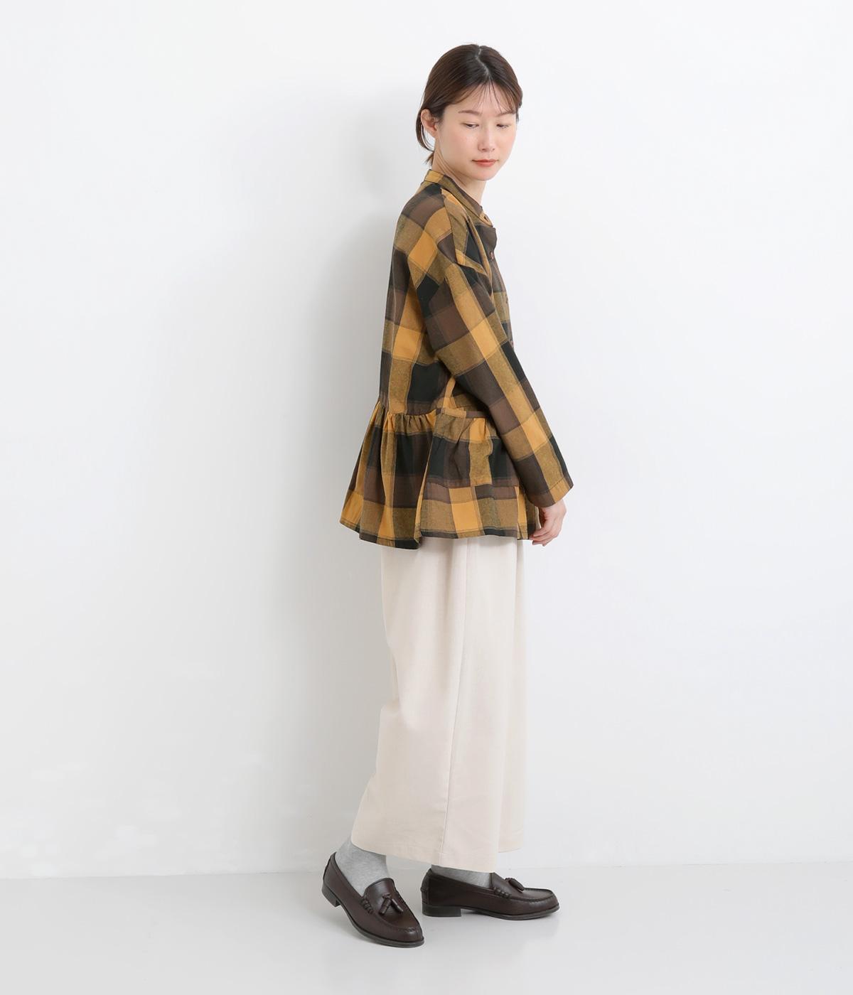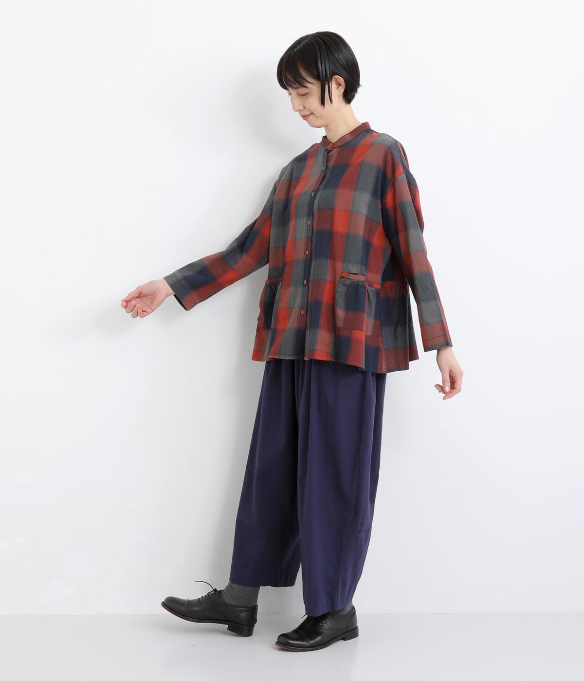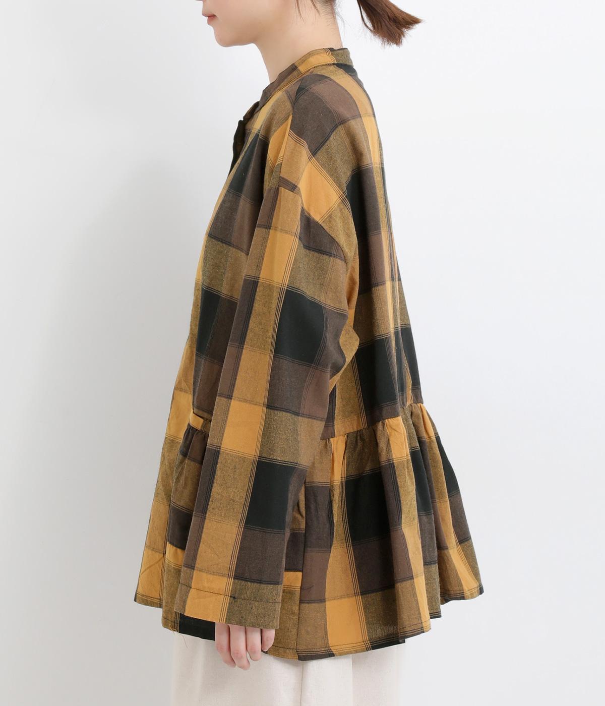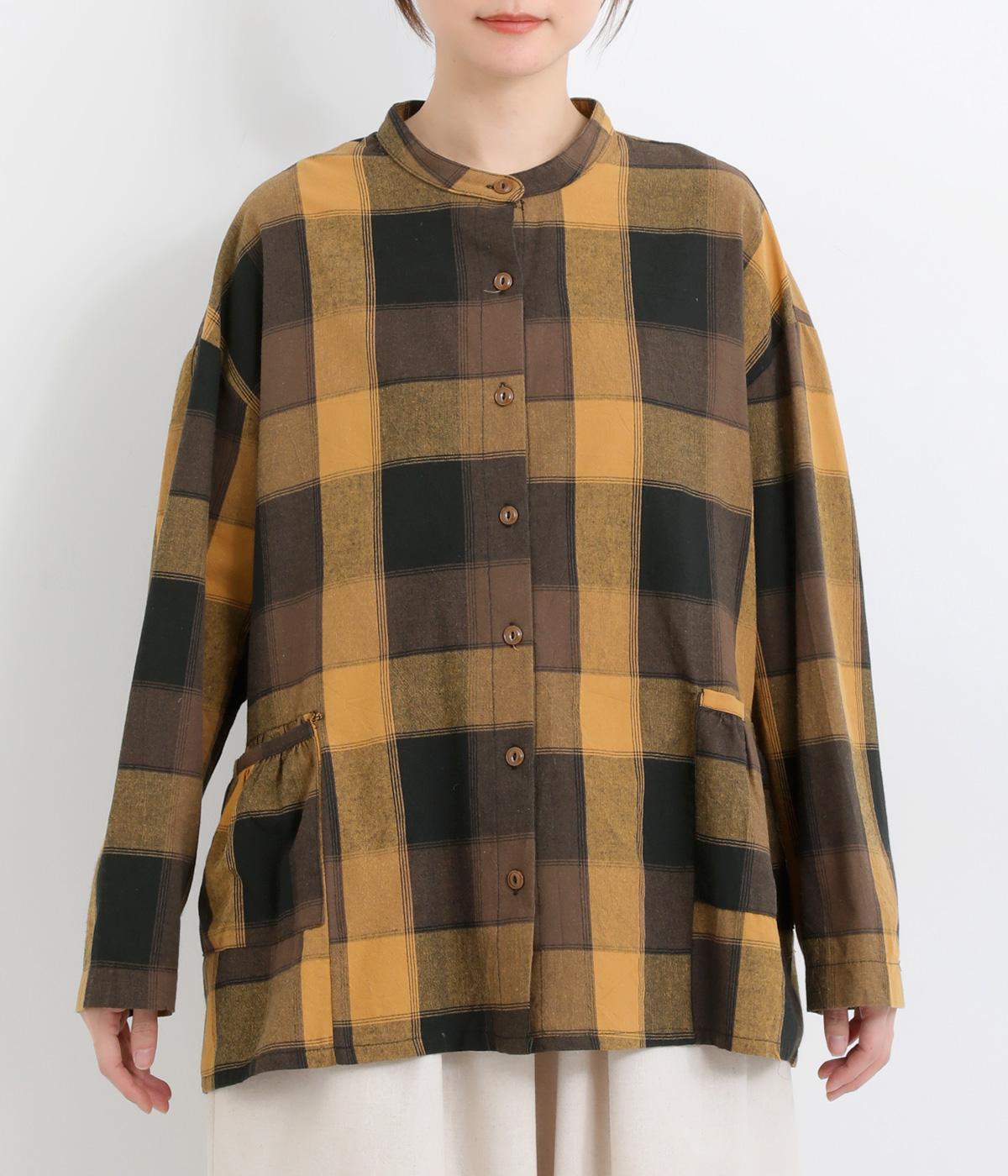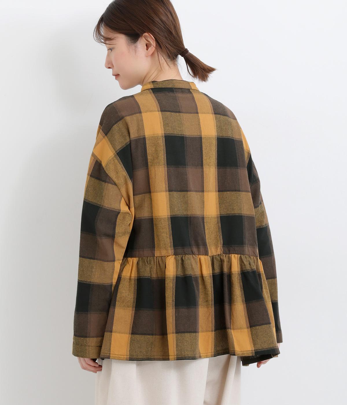 ニュアンスカラーのチェック柄が大人のカジュアルスタイルにぴったりなシャツです。腰まわりにほどこしたギャザーがふんわりと広がり、気になるヒップまわりをカバーします。立体的なポケットも、さりげなくアクセントを添えています。