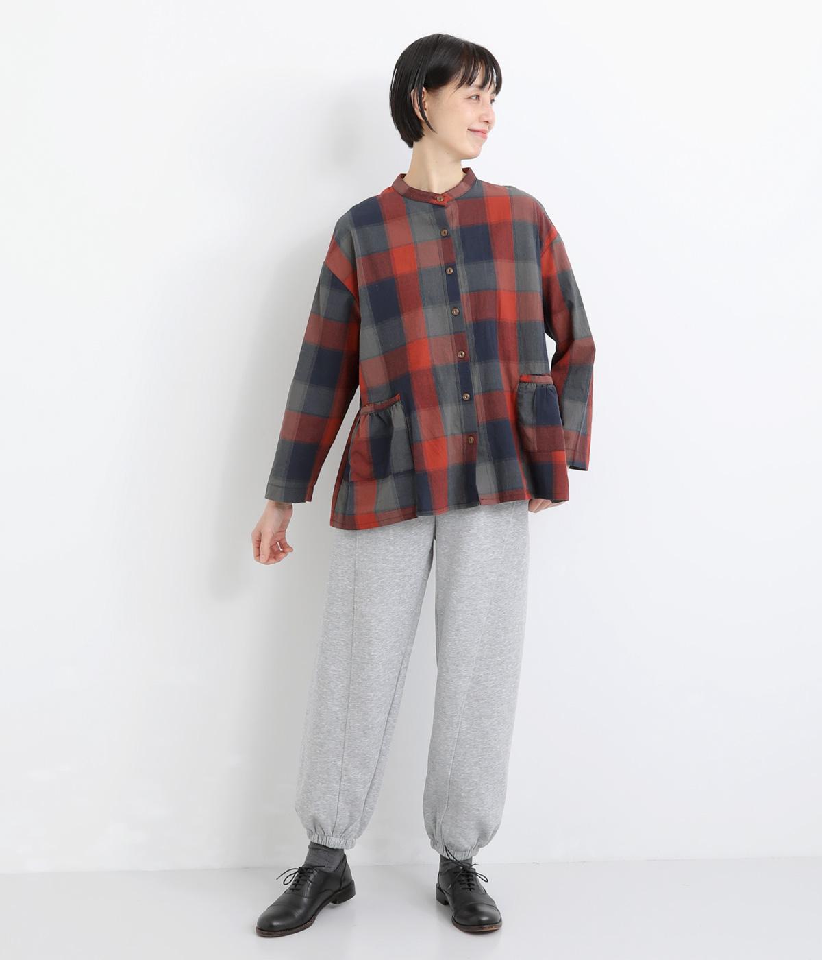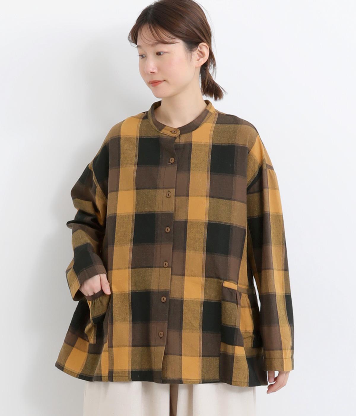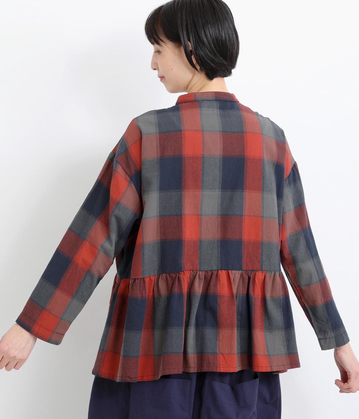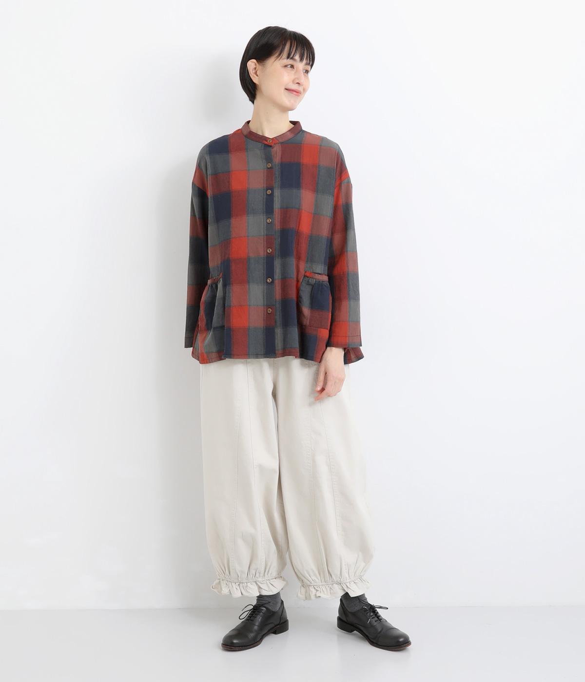 ニュアンスカラーのチェック柄が大人のカジュアルスタイルにぴったりなシャツです。腰まわりにほどこしたギャザーがふんわりと広がり、気になるヒップまわりをカバーします。立体的なポケットも、さりげなくアクセントを添えています。