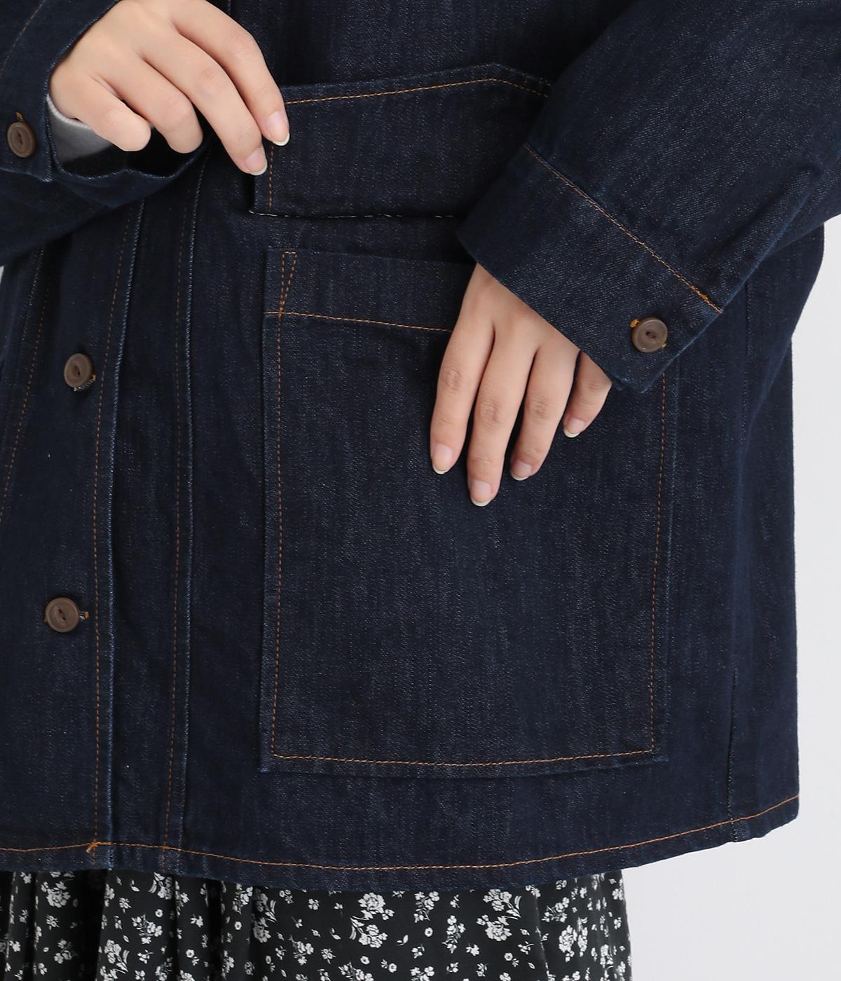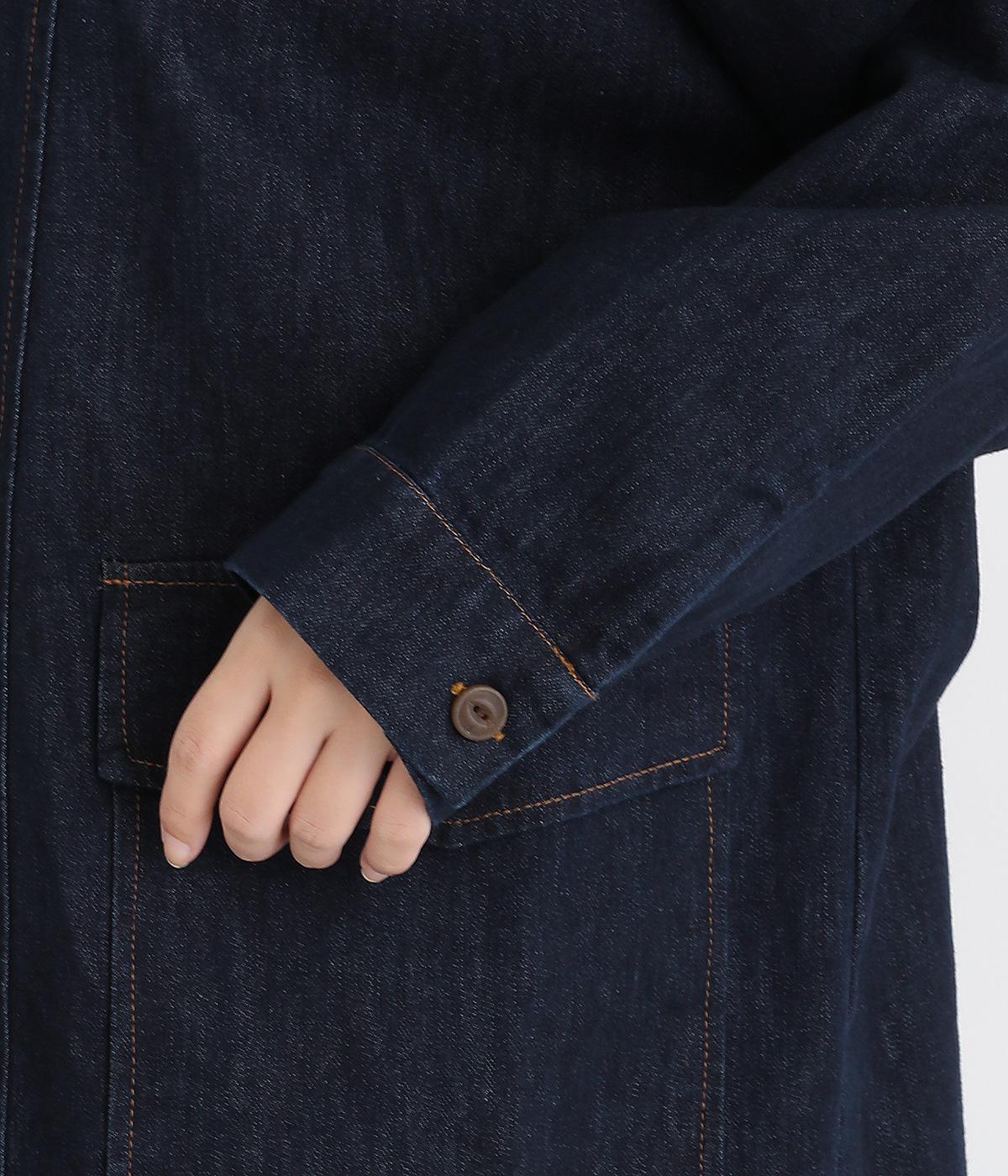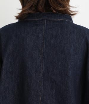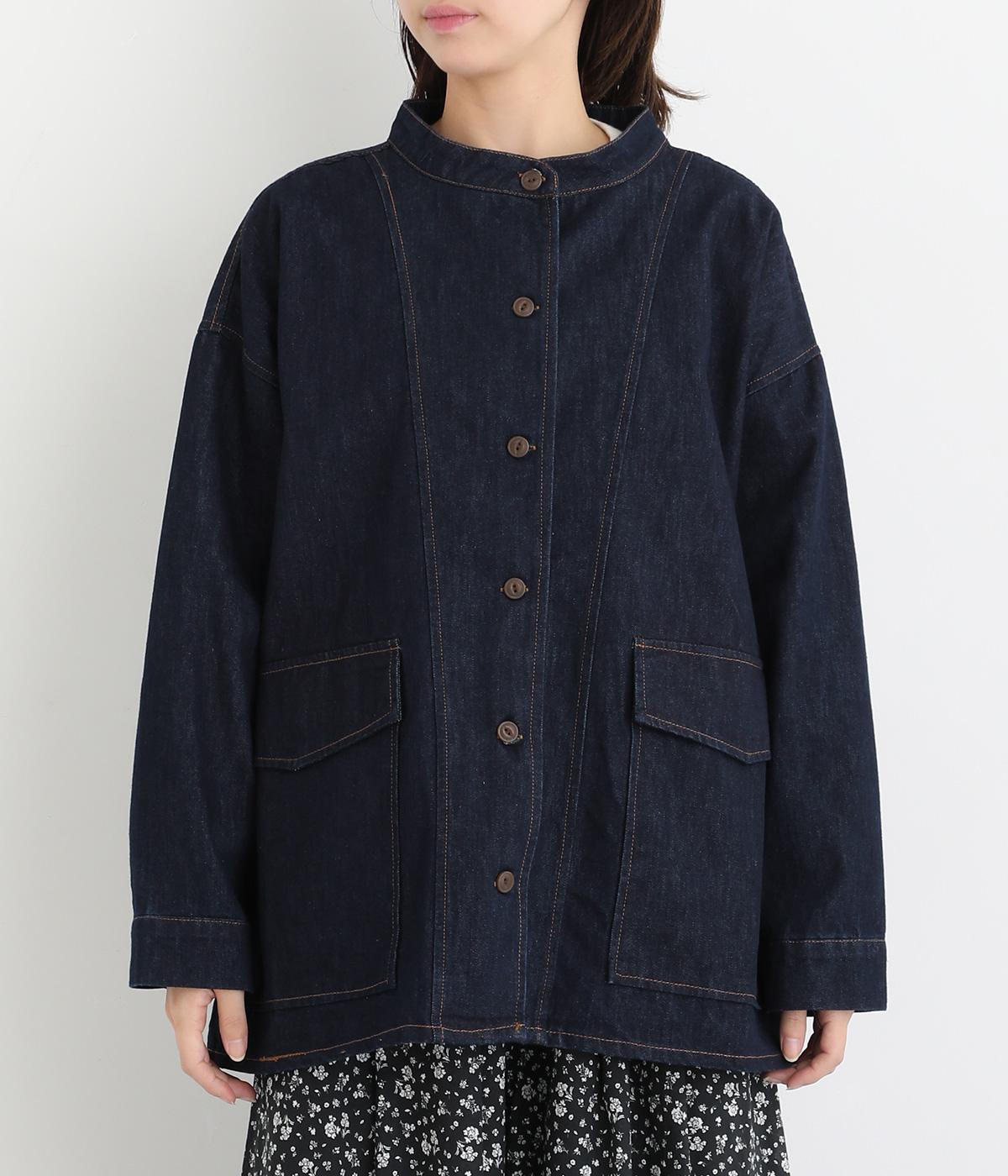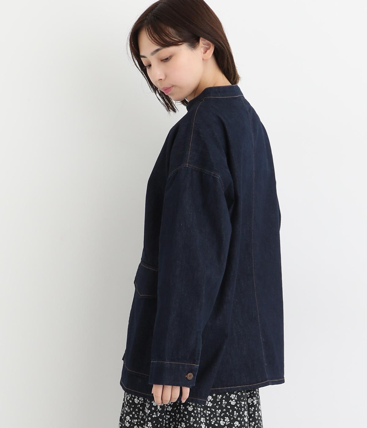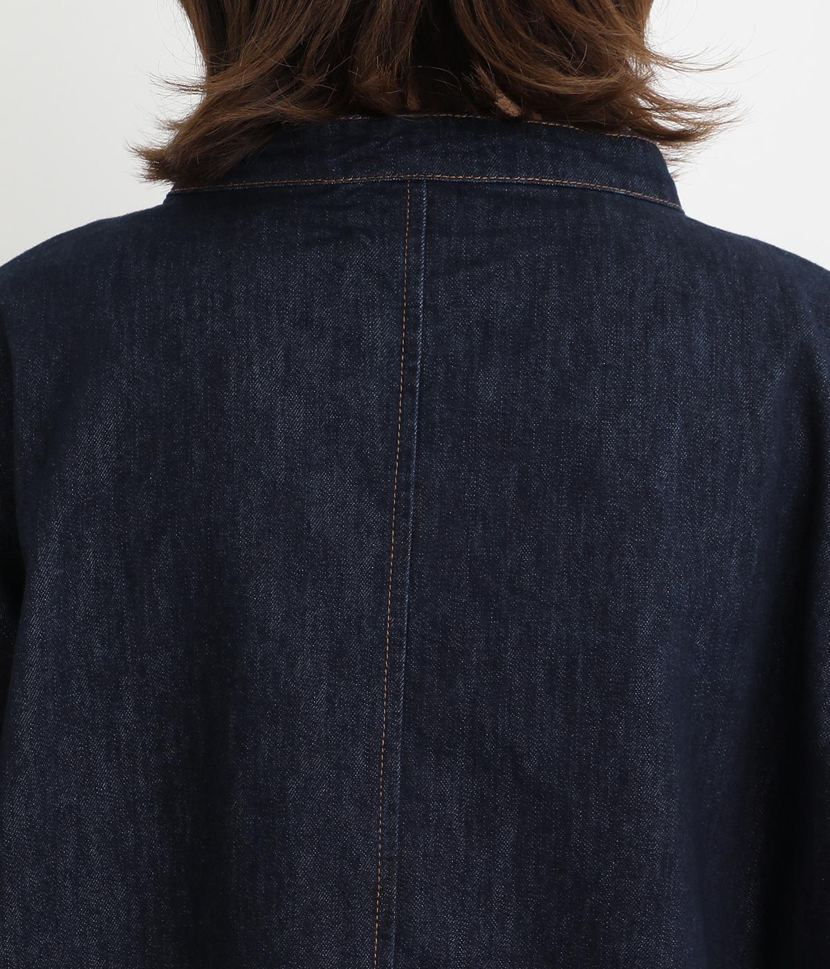きれいなデニム生地にステッチが映える大人らしいジャケット。低めに立ち上がった襟が品の良さを添え、カジュアルに転びすぎないのが魅力です。ゆったりとした身幅とドロップショルダーでラフな羽織り心地に。大きめのフラップポケットもアクセントになっています。