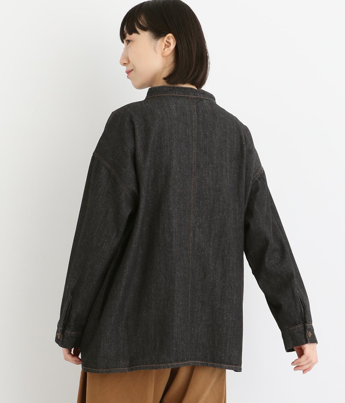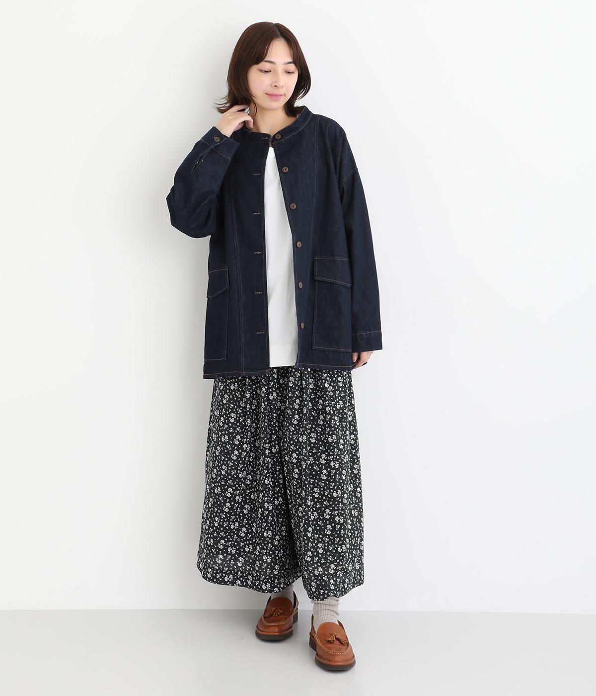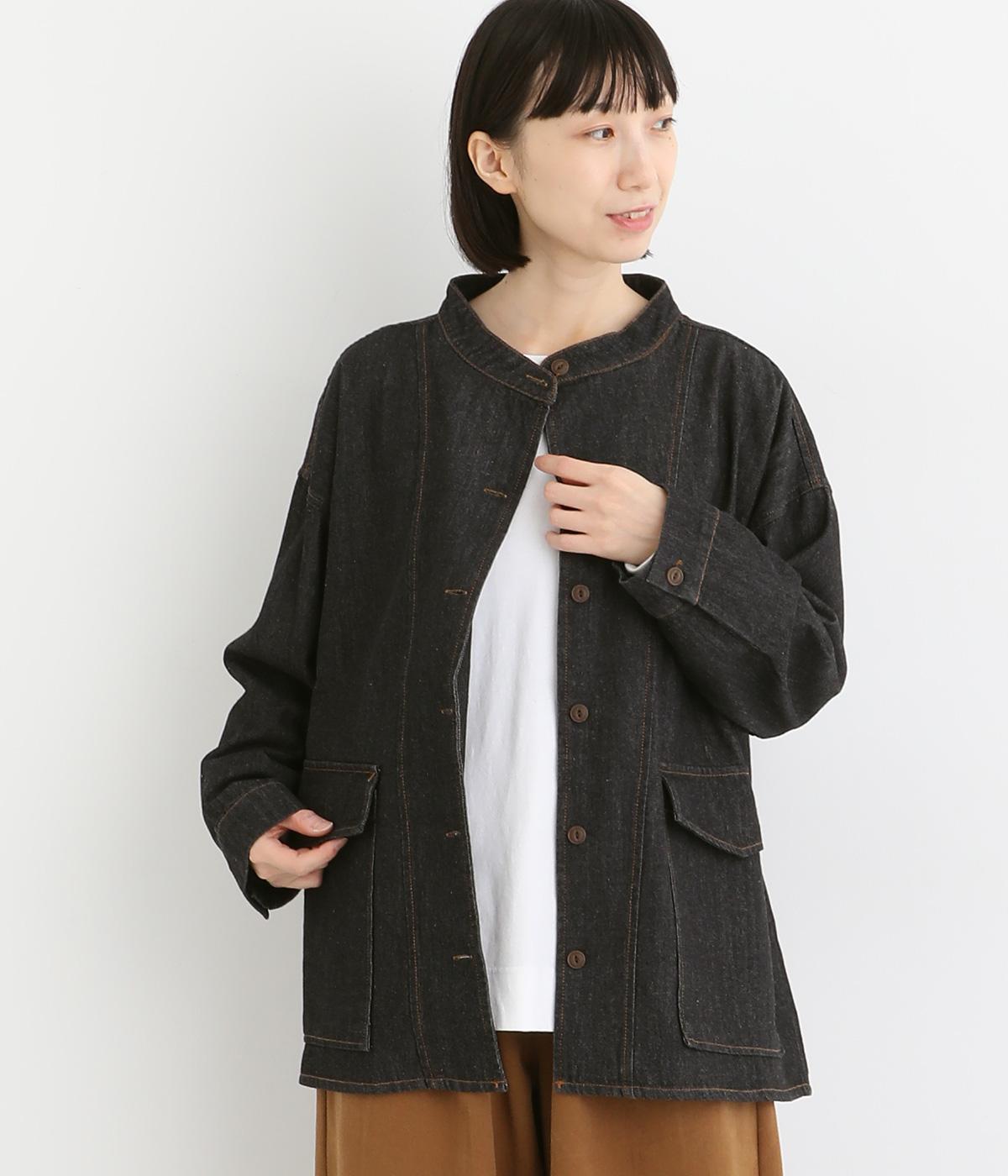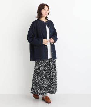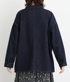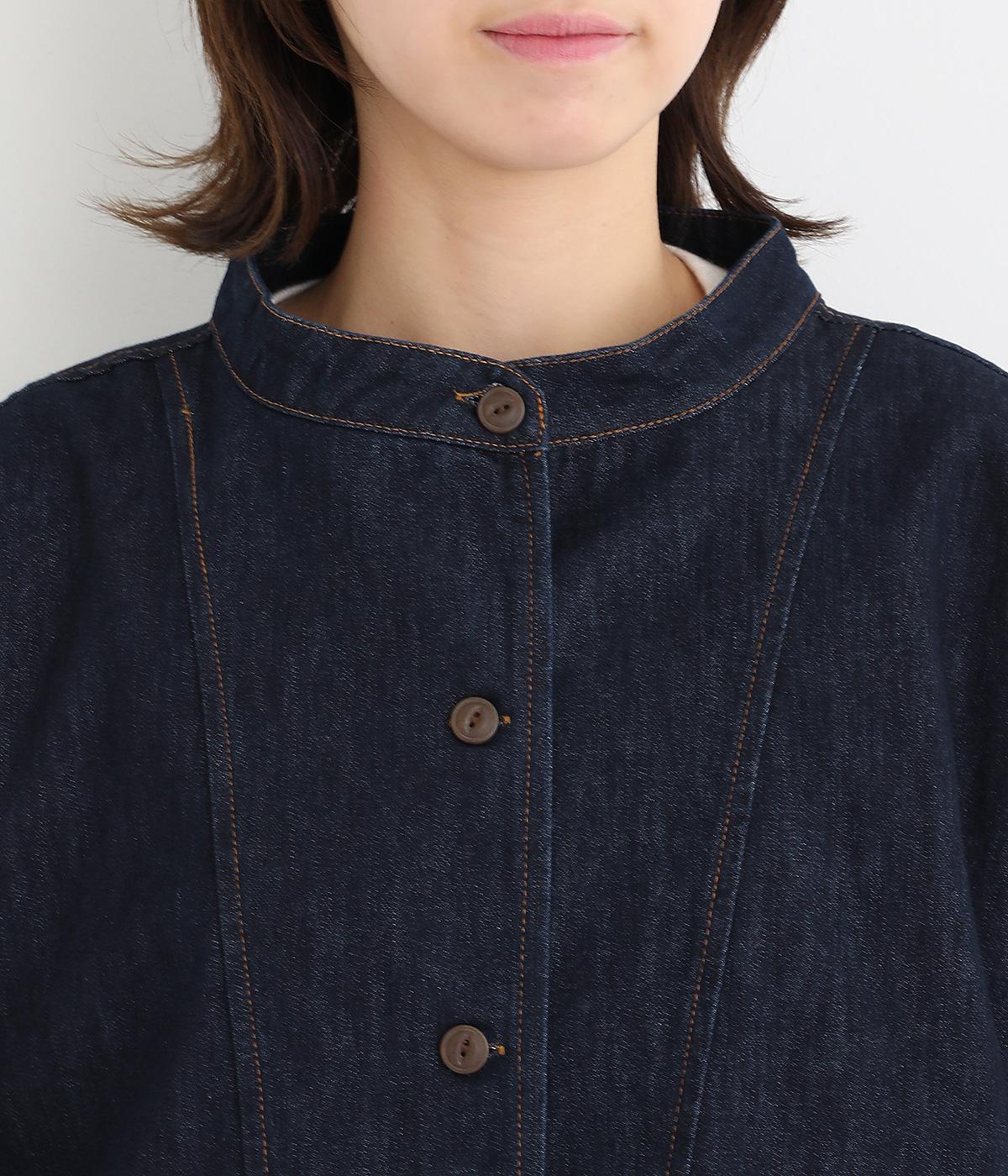 きれいなデニム生地にステッチが映える大人らしいジャケット。低めに立ち上がった襟が品の良さを添え、カジュアルに転びすぎないのが魅力です。ゆったりとした身幅とドロップショルダーでラフな羽織り心地に。大きめのフラップポケットもアクセントになっています。