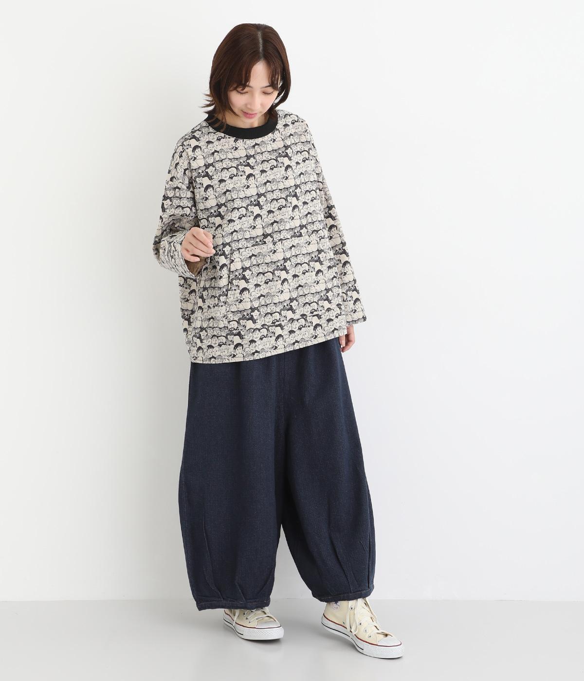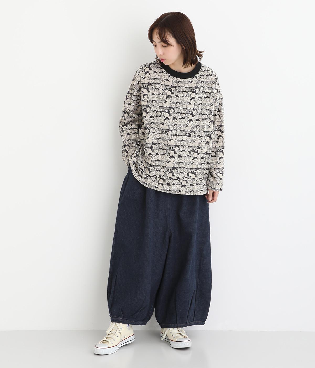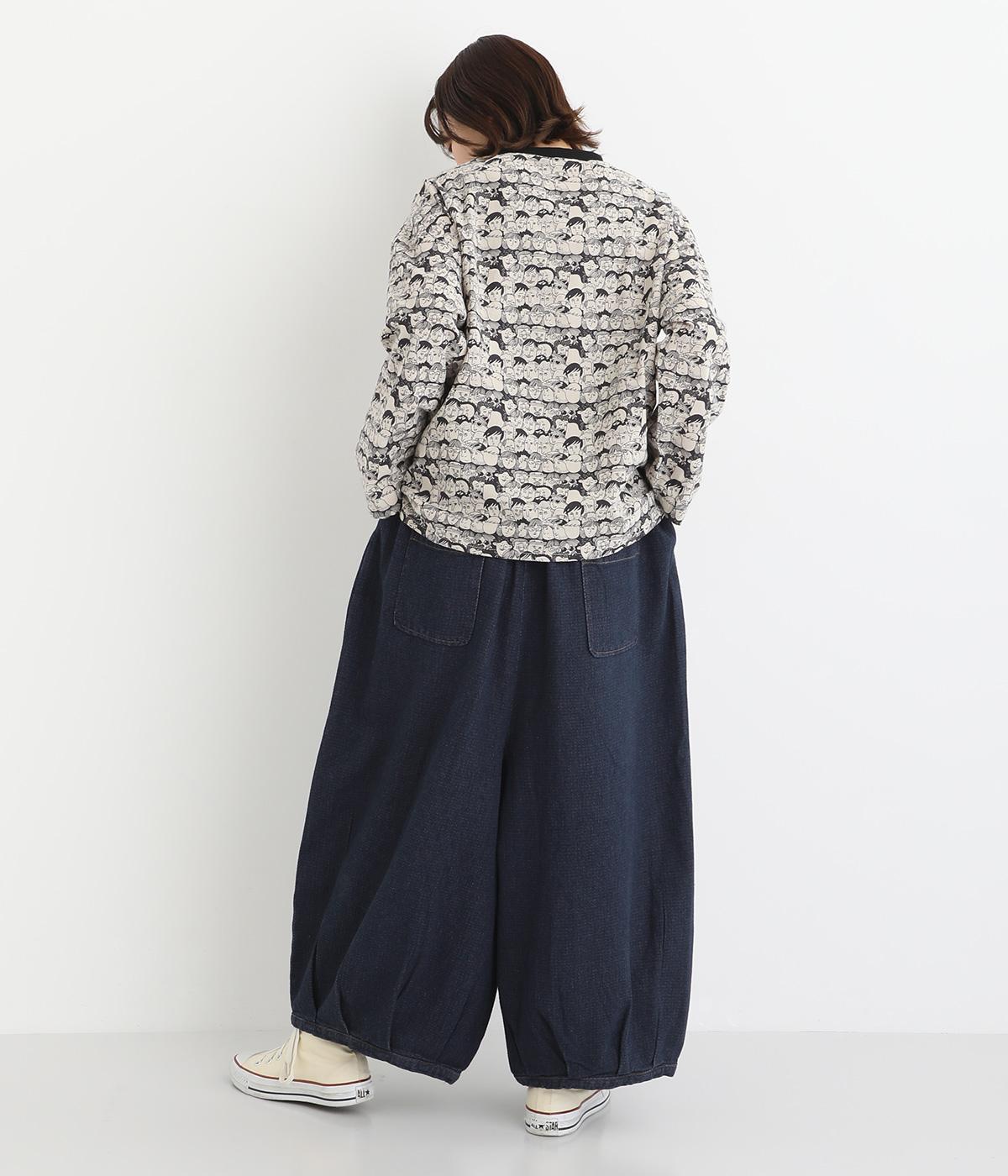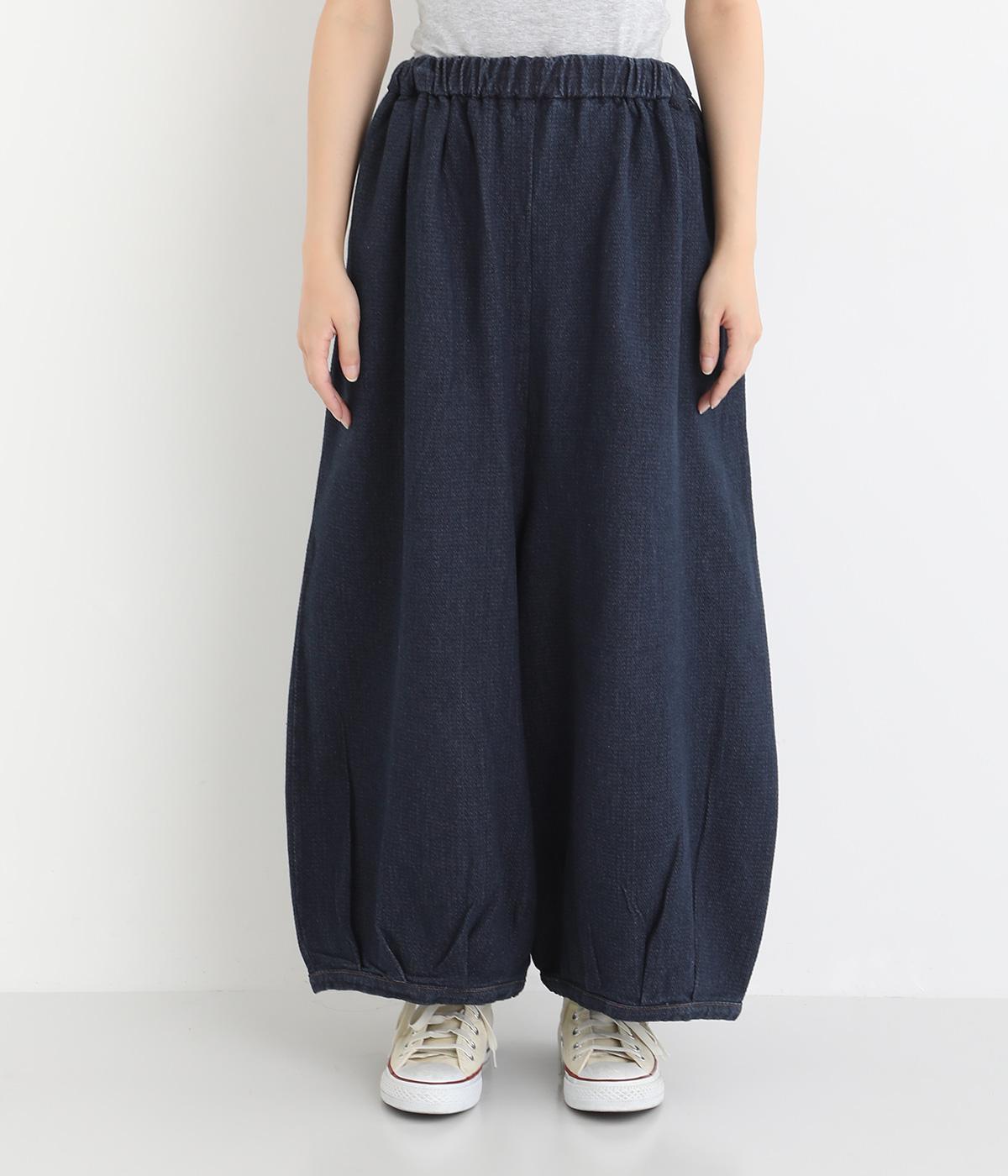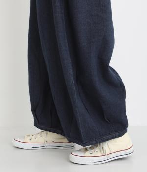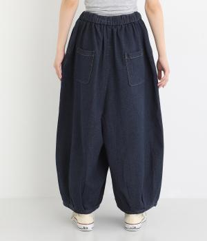 股上を深く設定し生地をたっぷりと使用してボリューミーに仕上げたパンツ。タックをほどこして裾をきゅっと絞った丸みのあるシルエットが個性を放ちます。ゴムと紐をぐるりと通したウエストがイージーな着用感をアシスト。ヒップとサイドに便利なポケットをつけています。