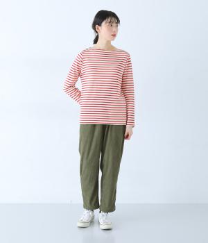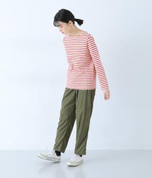 さっと穿けるイージータイプのパンツです。前後のギャザーがお腹まわりをさりげなくカバー。ベルトループ付きなので、お手持ちのベルトを使ったアレンジも楽しめます。ワンピースとのレイヤードにもおすすめ。