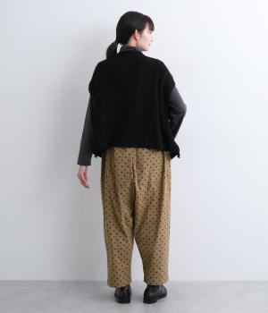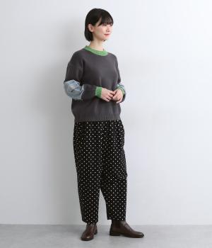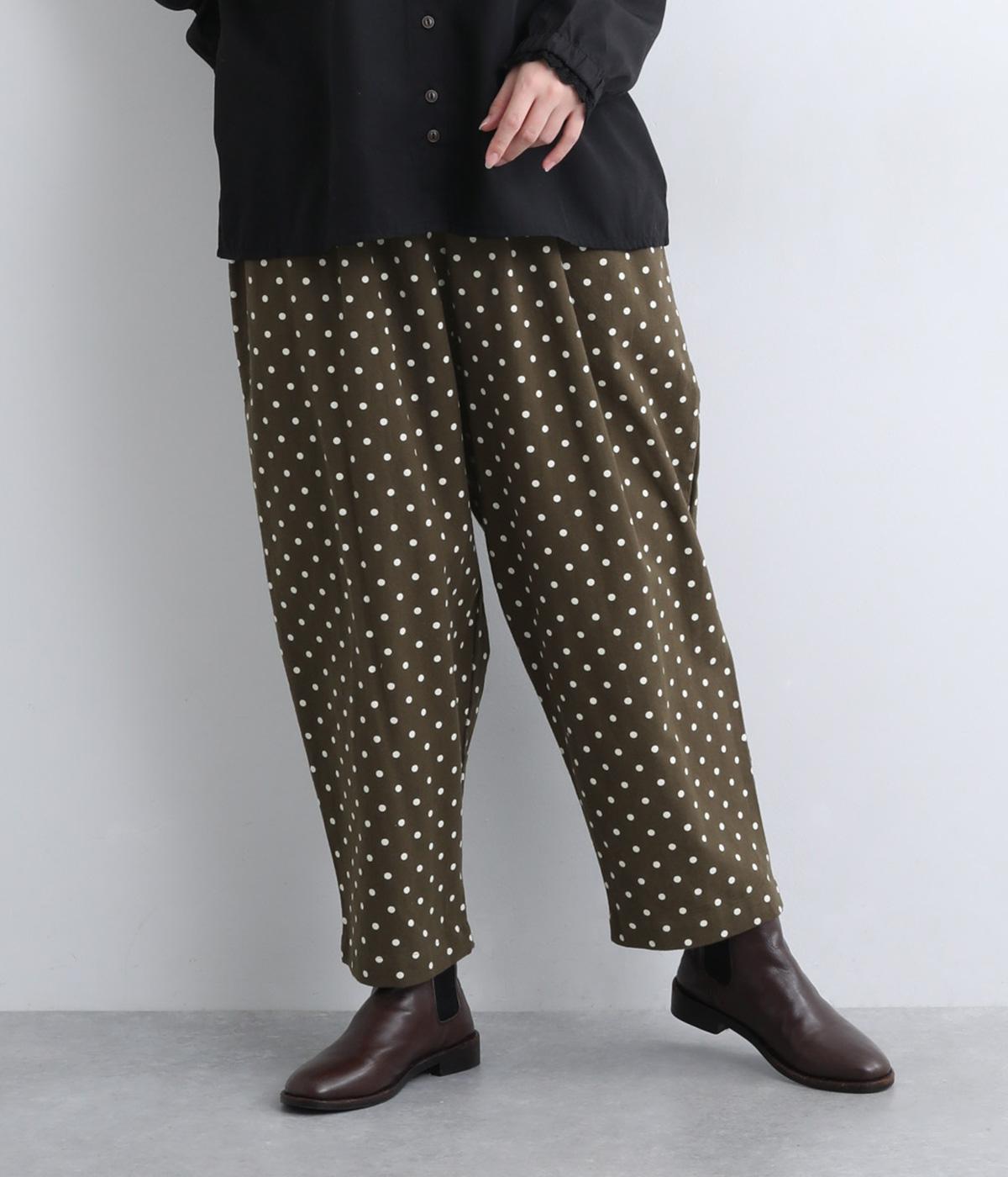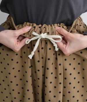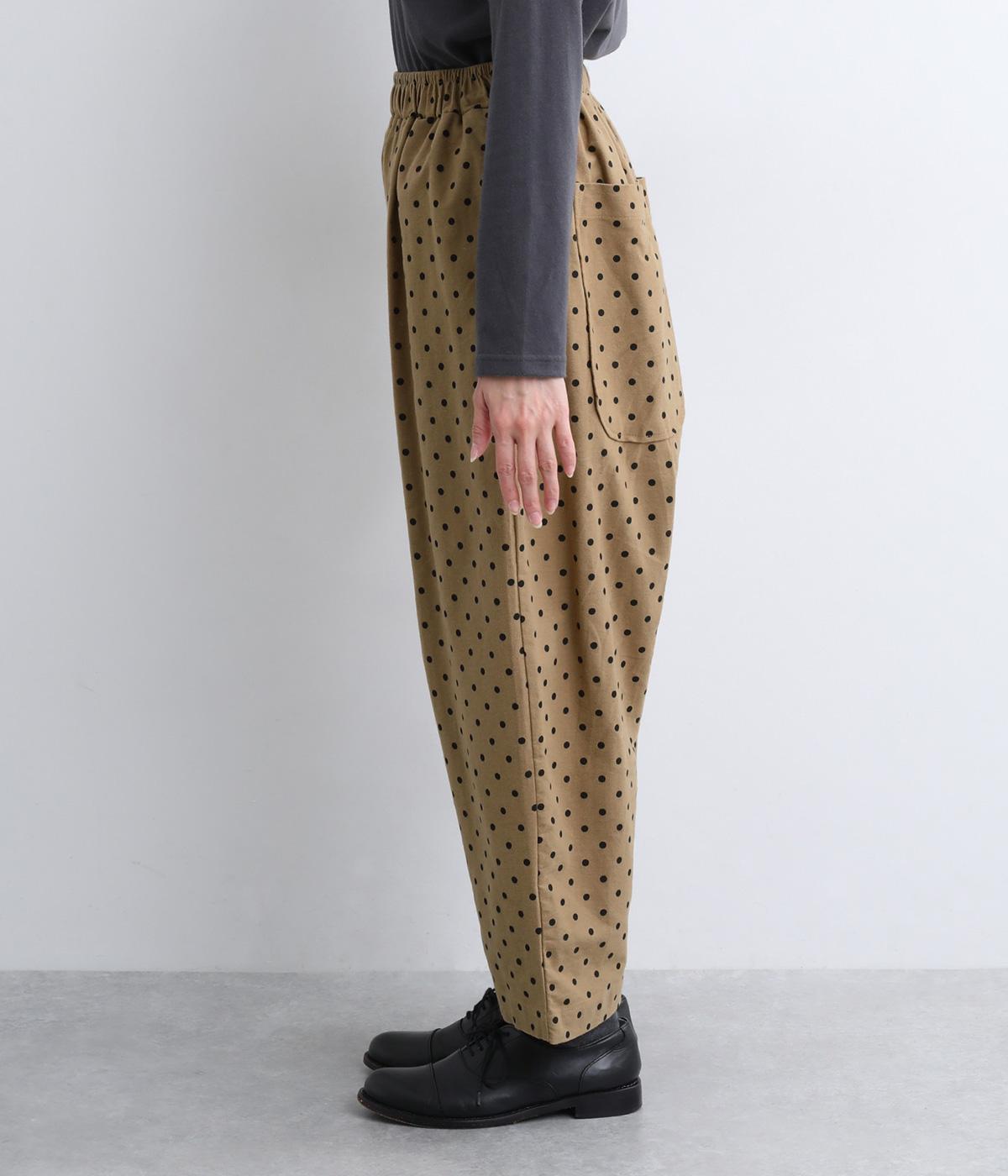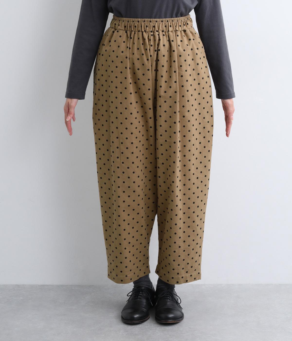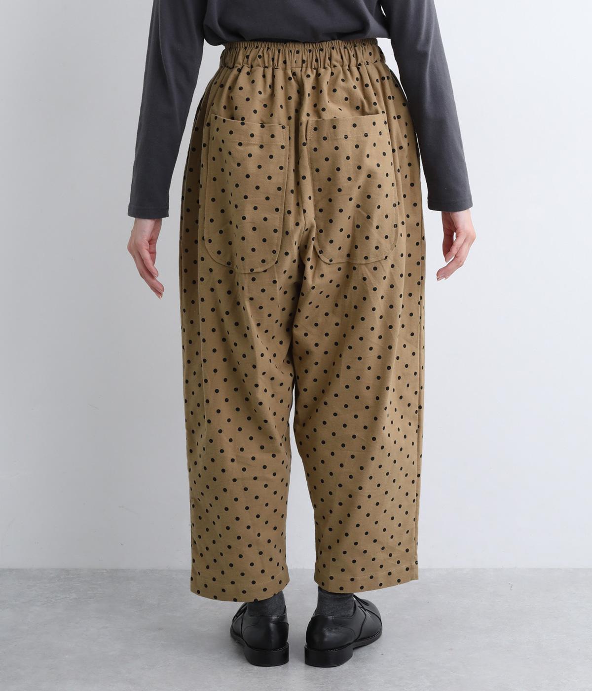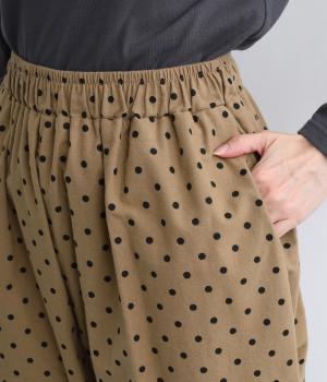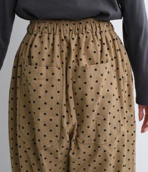 ふんわりとしたサルエルパンツに、立体感を引き立てる深めのヒップポケットをプラスしました。バックスタイルにも表情があり、どの角度から見ても印象的です。ゆとりのあるシルエットで動きやすく、ドット柄が軽やかさを添えた、カジュアルで上品な一本です。