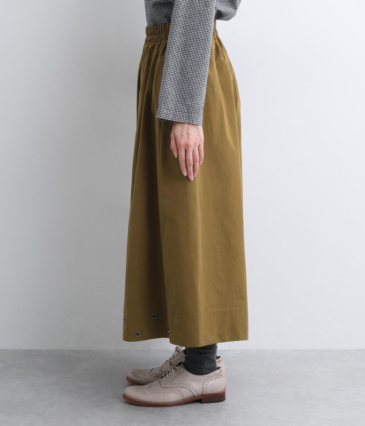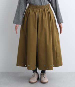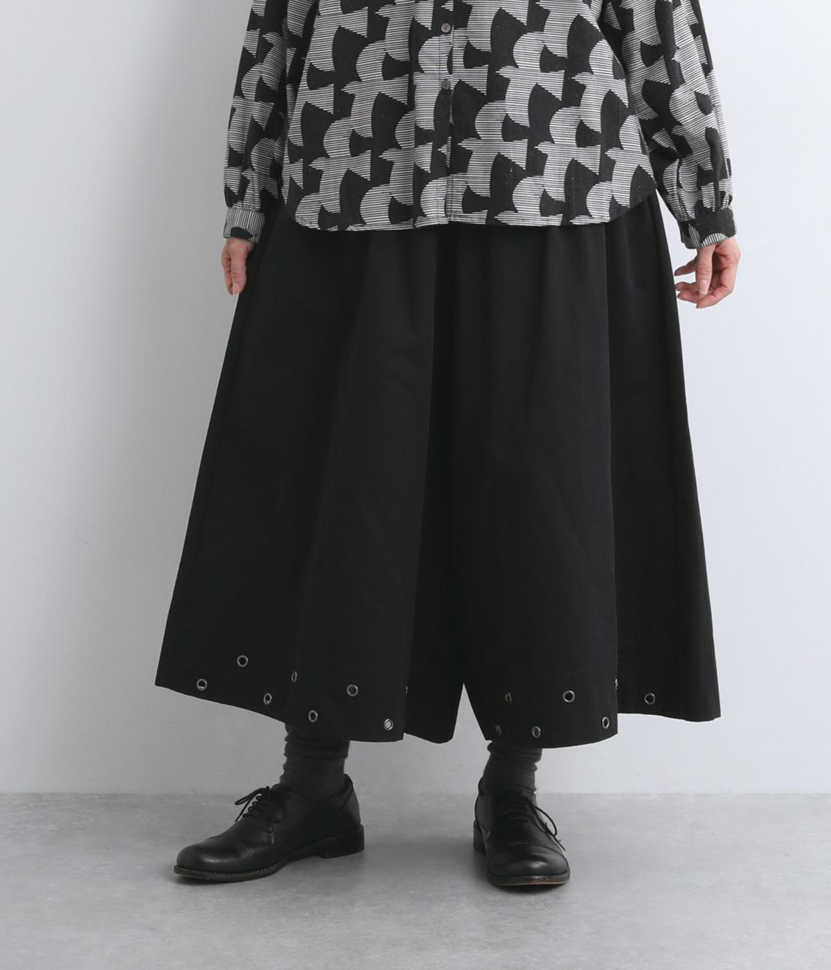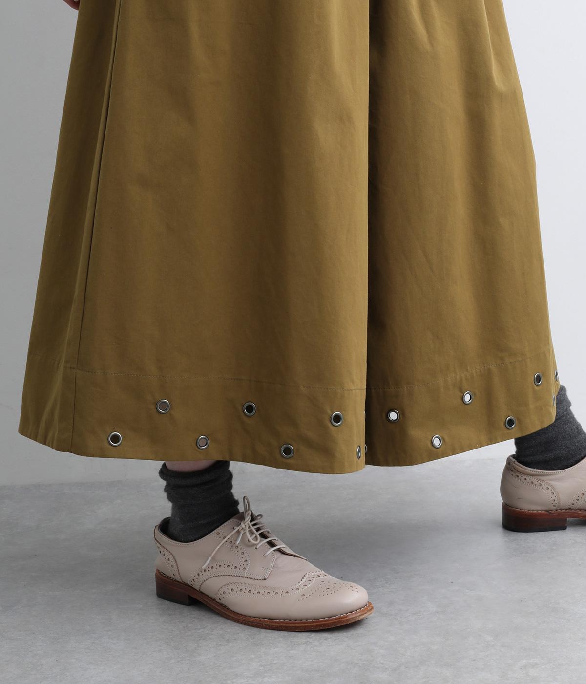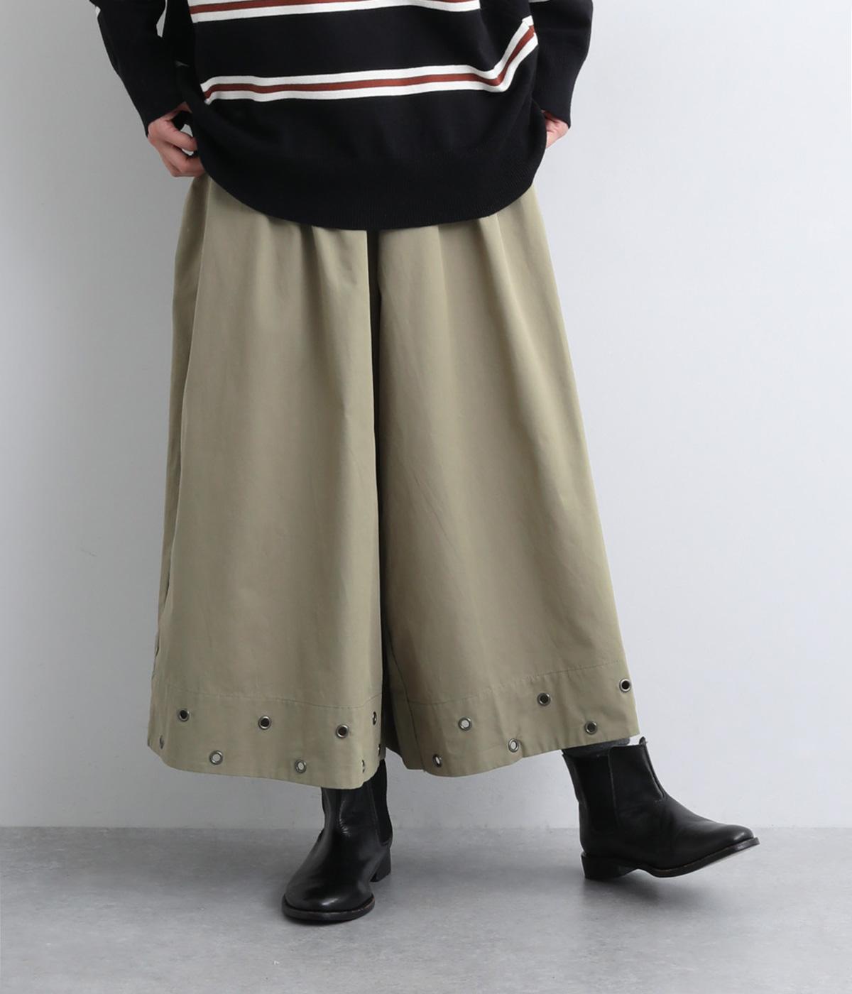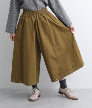 裾にあしらわれたアイレットが、シンプルなデザインにさりげない個性を添えるワイドパンツです。たっぷりとしたシルエットが体のラインを拾いにくく、リラックスしたはき心地をかなえます。ほどよいハリ感のあるダンプ生地が、立体的なフォルムをキープし、大人のナチュラルスタイルをすっきりとまとめます。
