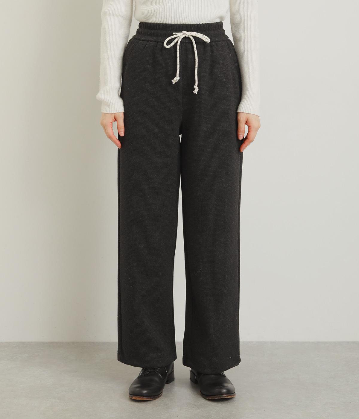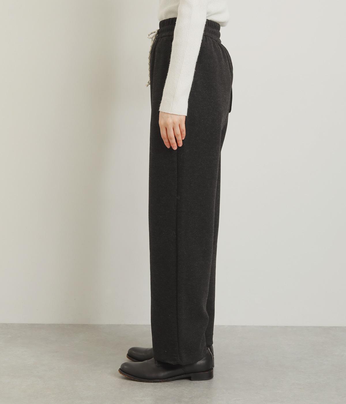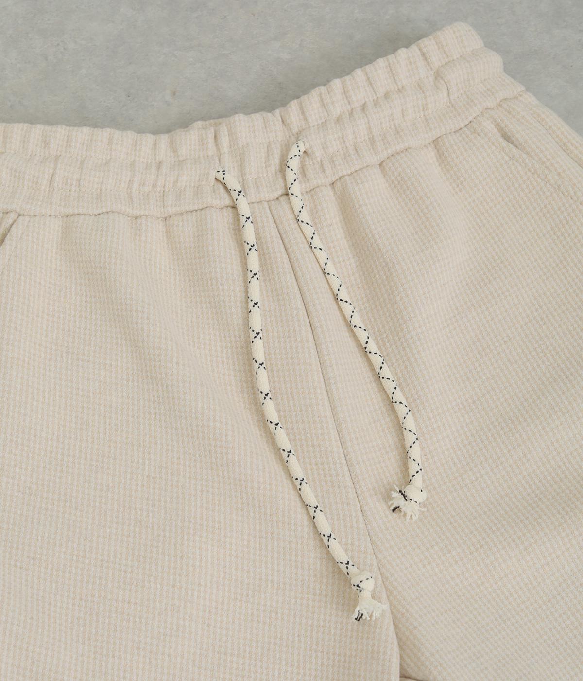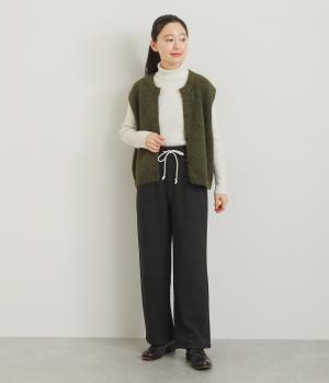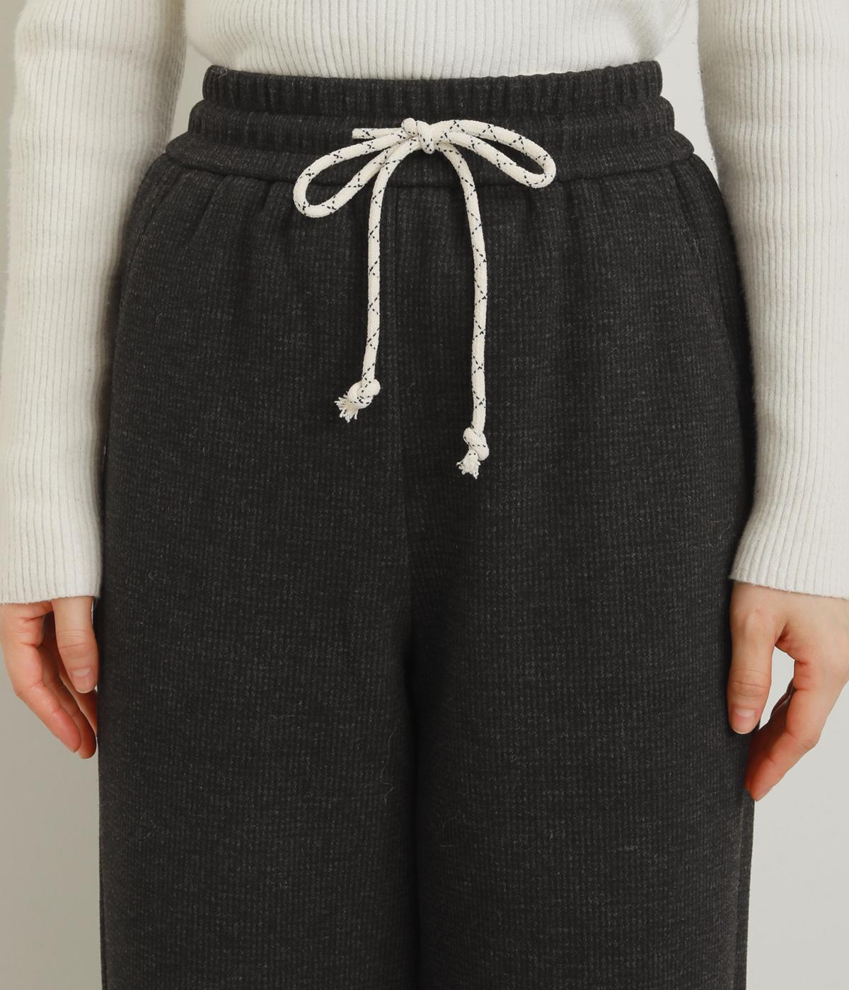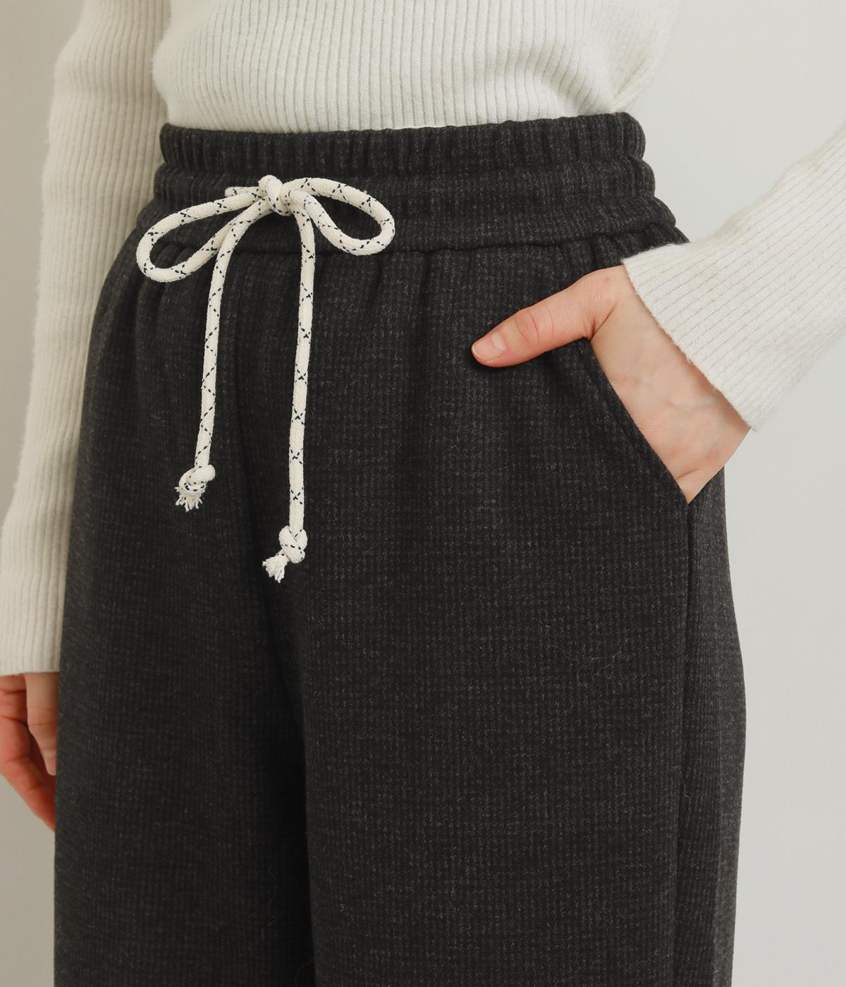 さり気ないグレンチェック柄が着こなしに大人なニュアンスを運ぶパンツ。ウエストは安定感のある幅広ゴムで、ステッチを入れた調整紐がデザインポイントにも。リラックス感をキープしながらもシルエットはすっきりしています。