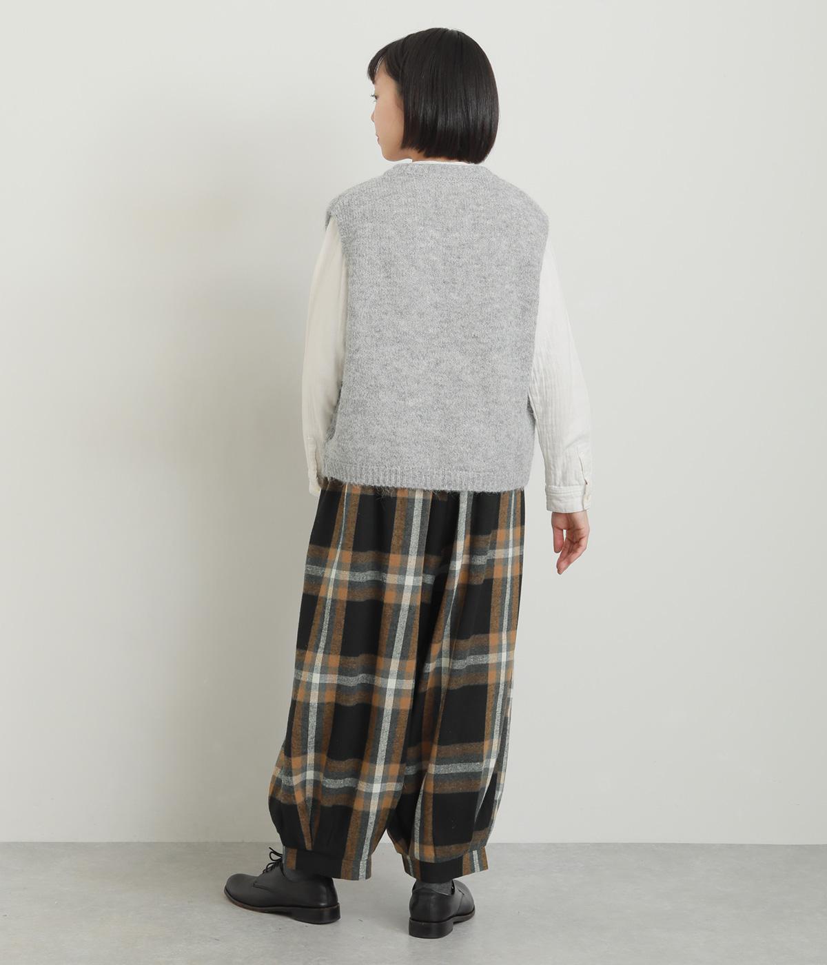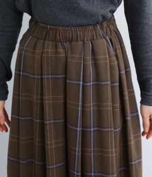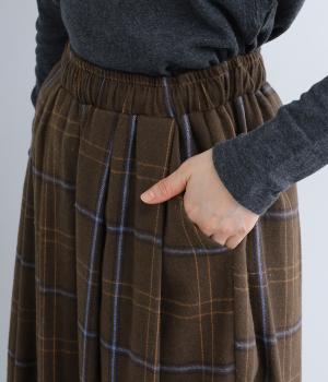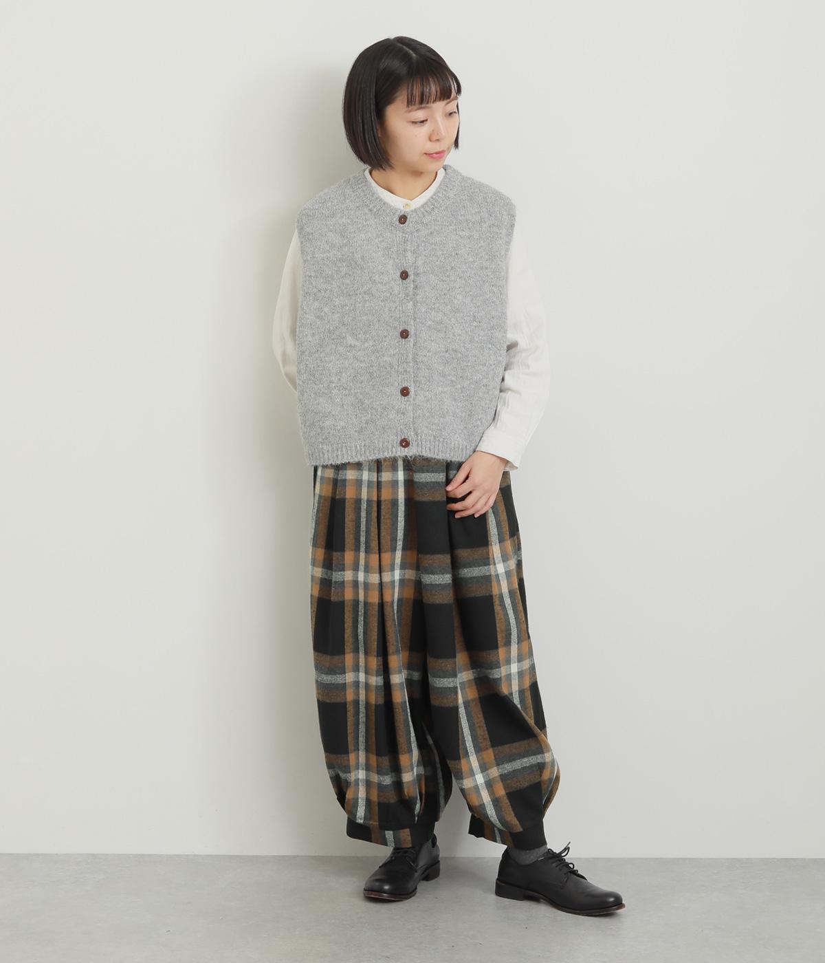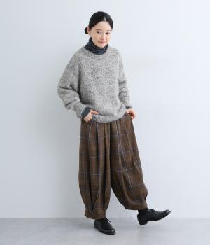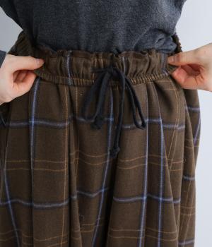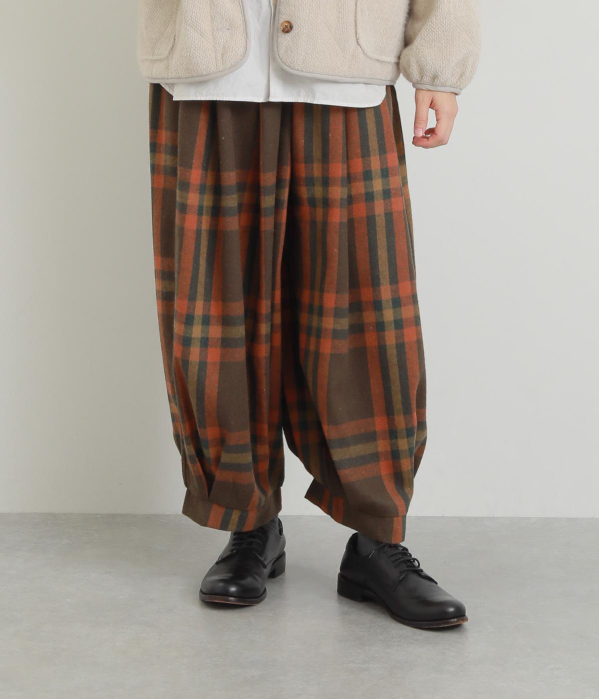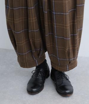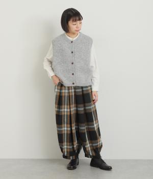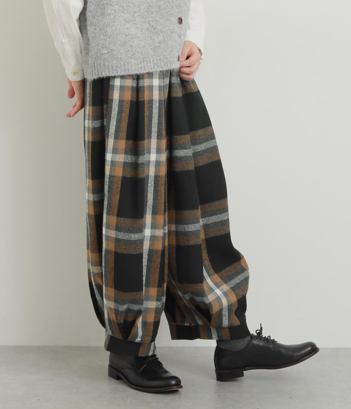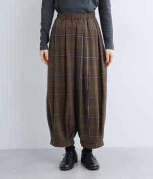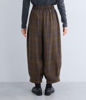 前ウエストと裾にタックを入れ、シルエットに立体感を持たせたパンツ。タックから生まれる陰影が、チェック柄をより表情豊かに見せてくれます。全体のバランスをすっきりと整える、きゅっと細くした裾が◎。ウエストは総ゴム仕様です。