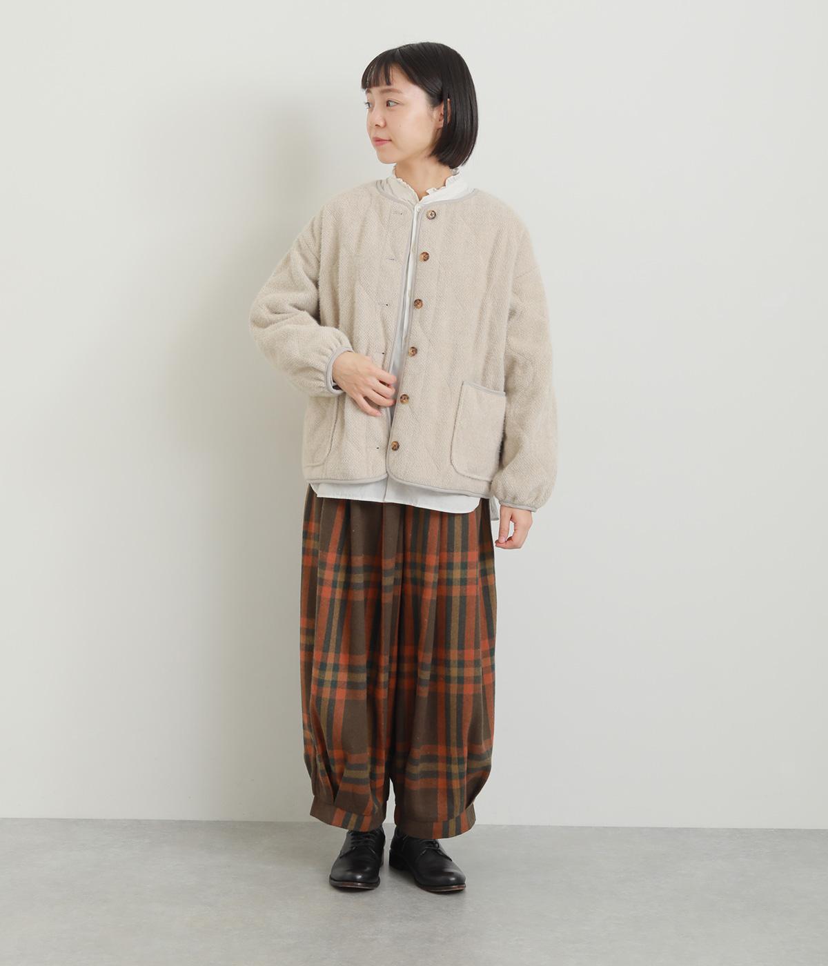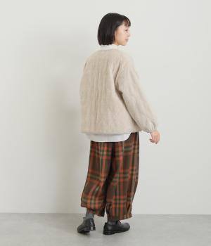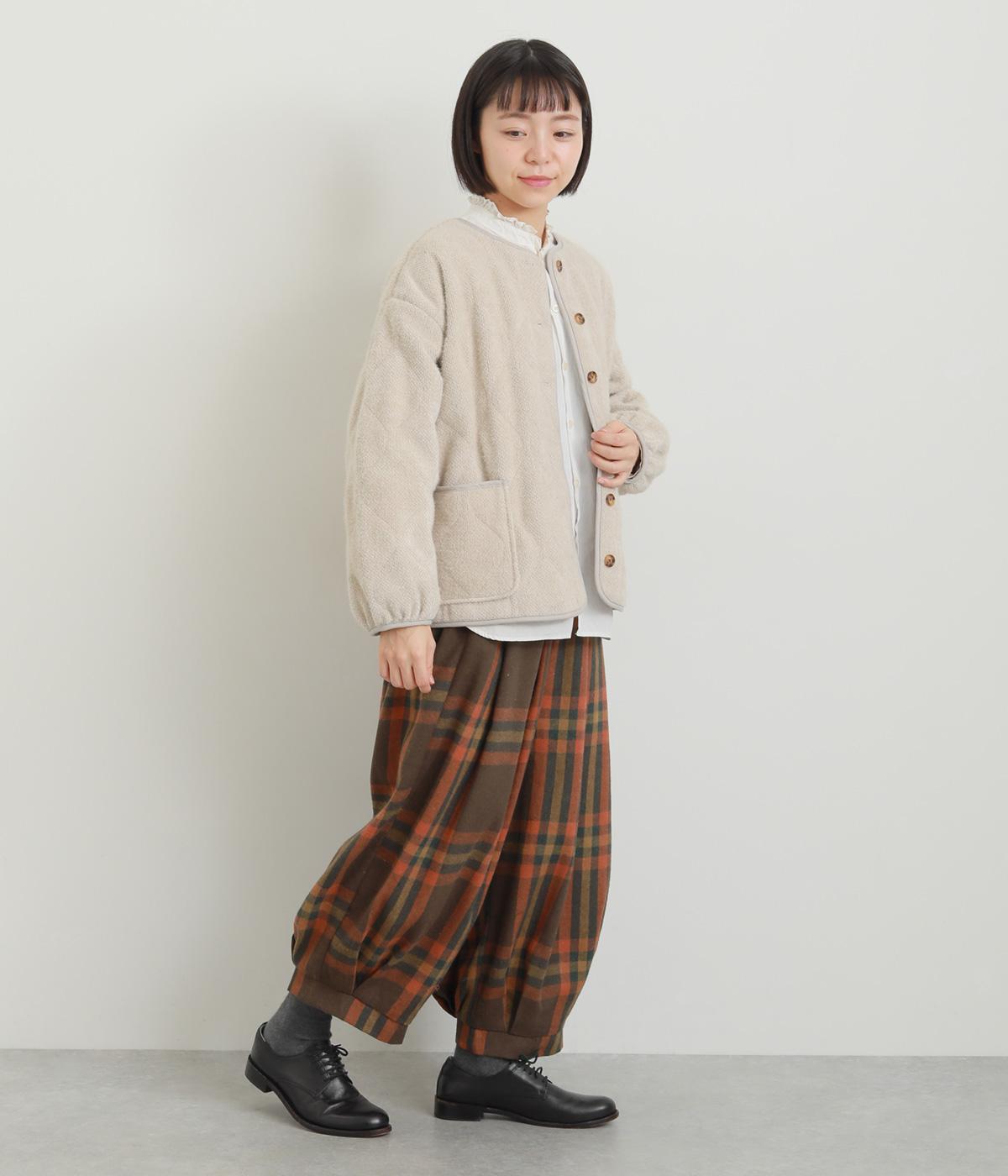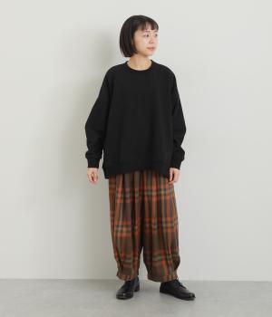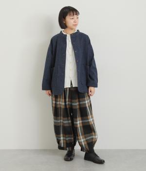 厚みをおさえ、軽くやわらかな風合いのイージーなはき心地を叶える生地感です。表面のふっくらとした起毛とチェック柄が着こなしに季節感を添えてくれます。