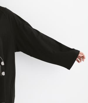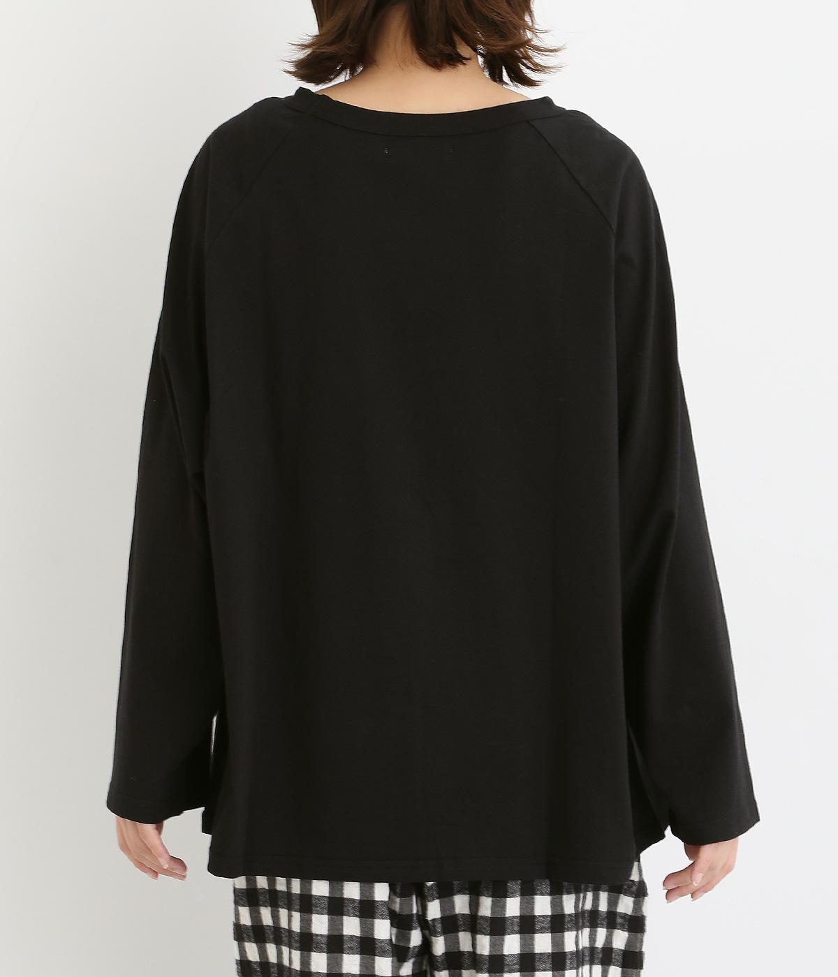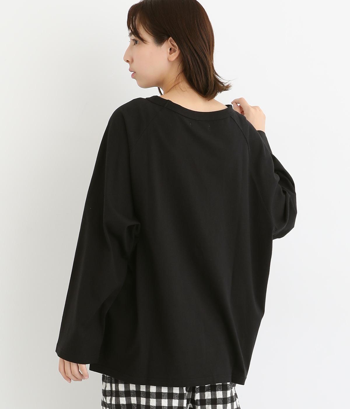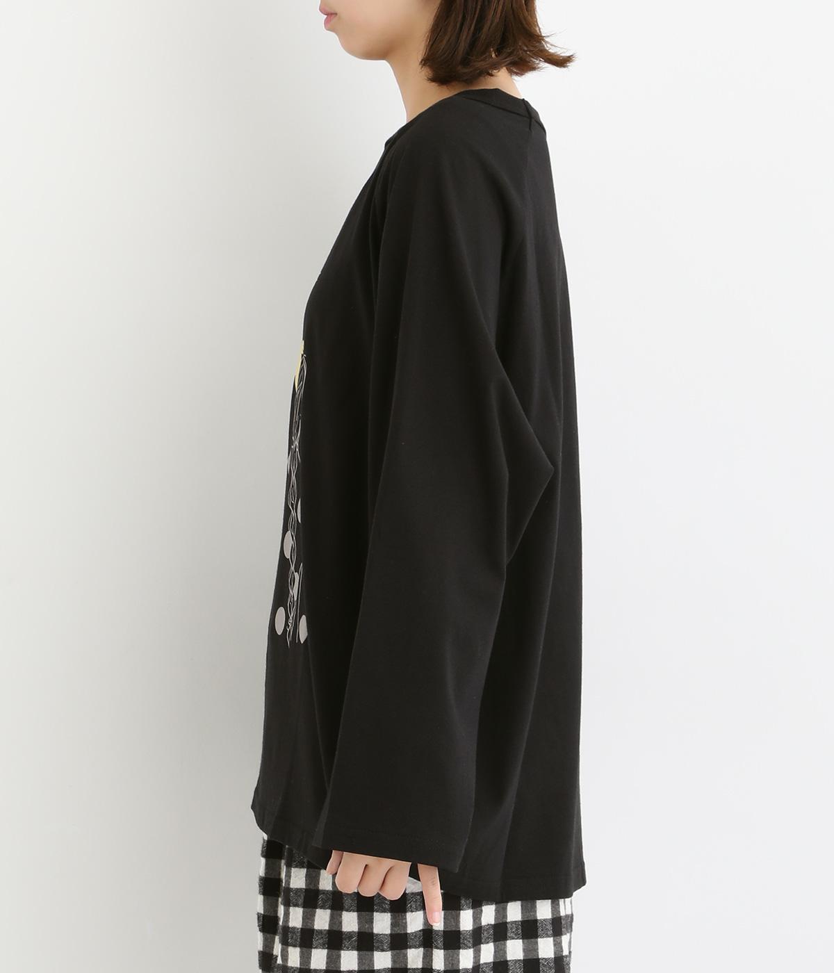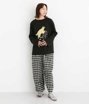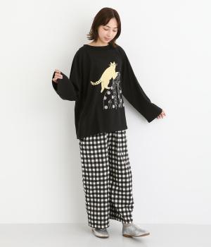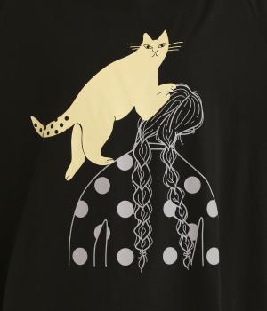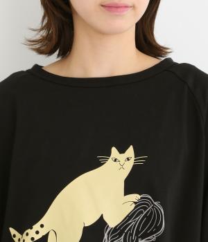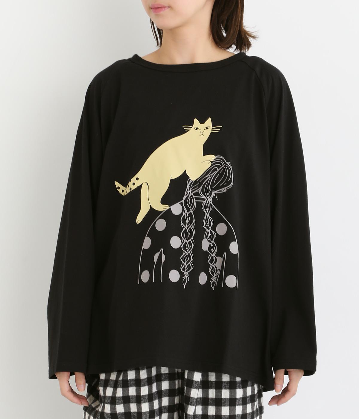 女の子の肩に猫が乗ったユニークなプリントが主役のTシャツ。全体にゆとりを持たせてリラクシーに仕上げています。横に広げた浅めのネックが女性らしさをプラス。肩のラインをやさしく見せてくれるラグランスリーブもポイントです。