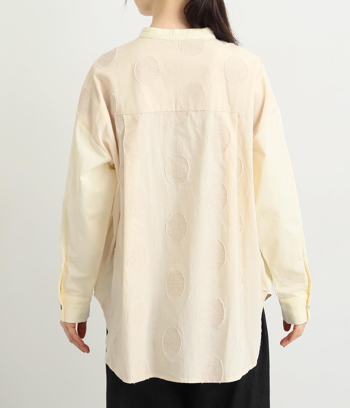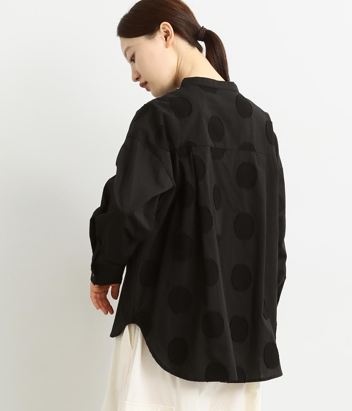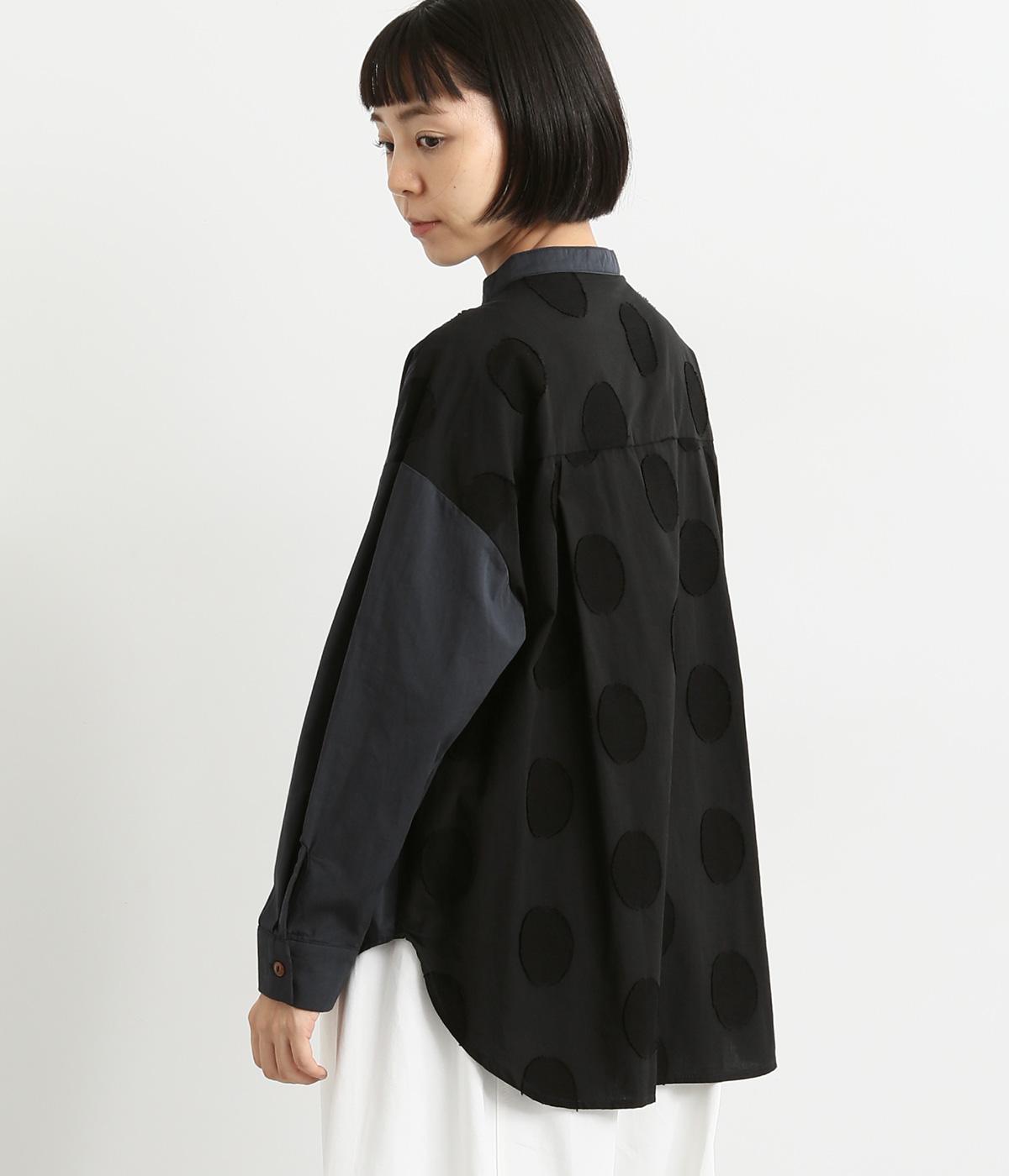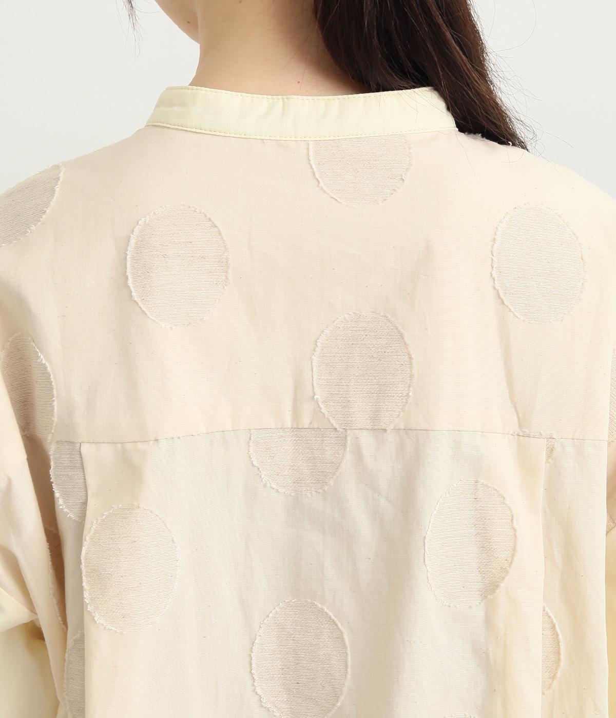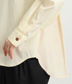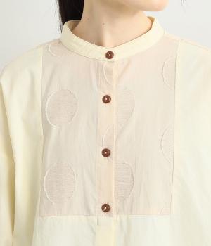 胸部分と背面に大きなドットをあしらいました。ドットを立体的にすることでさりげなく個性をプラス。バンドカラーですっきり柔らかい印象に。裾は丸みのあるカット。後ろに長さを持たせて体型カバーにも◎。