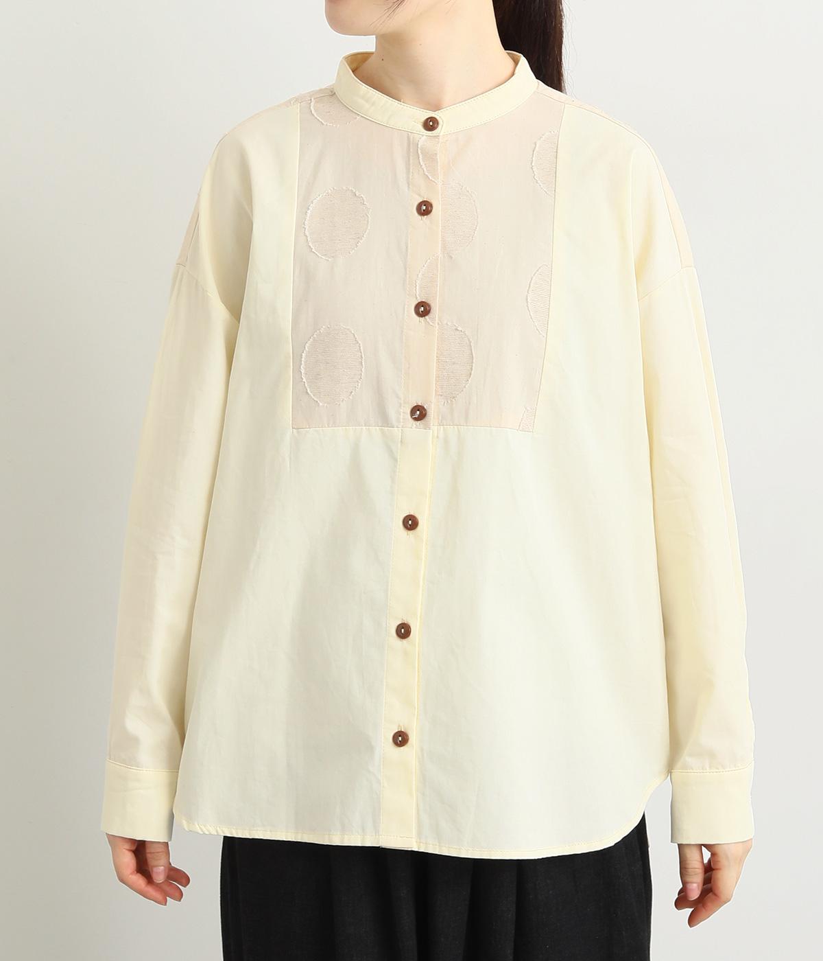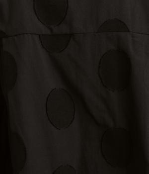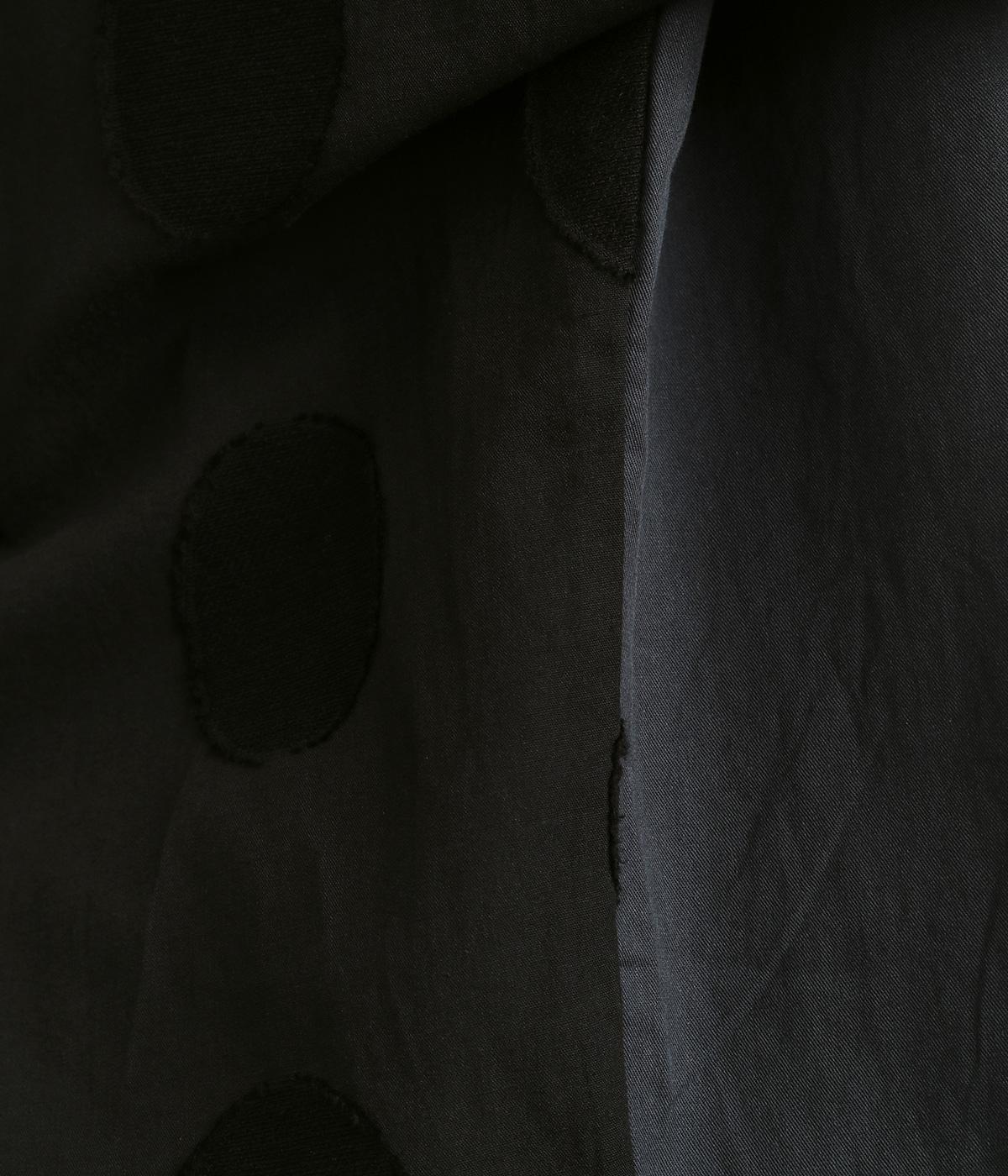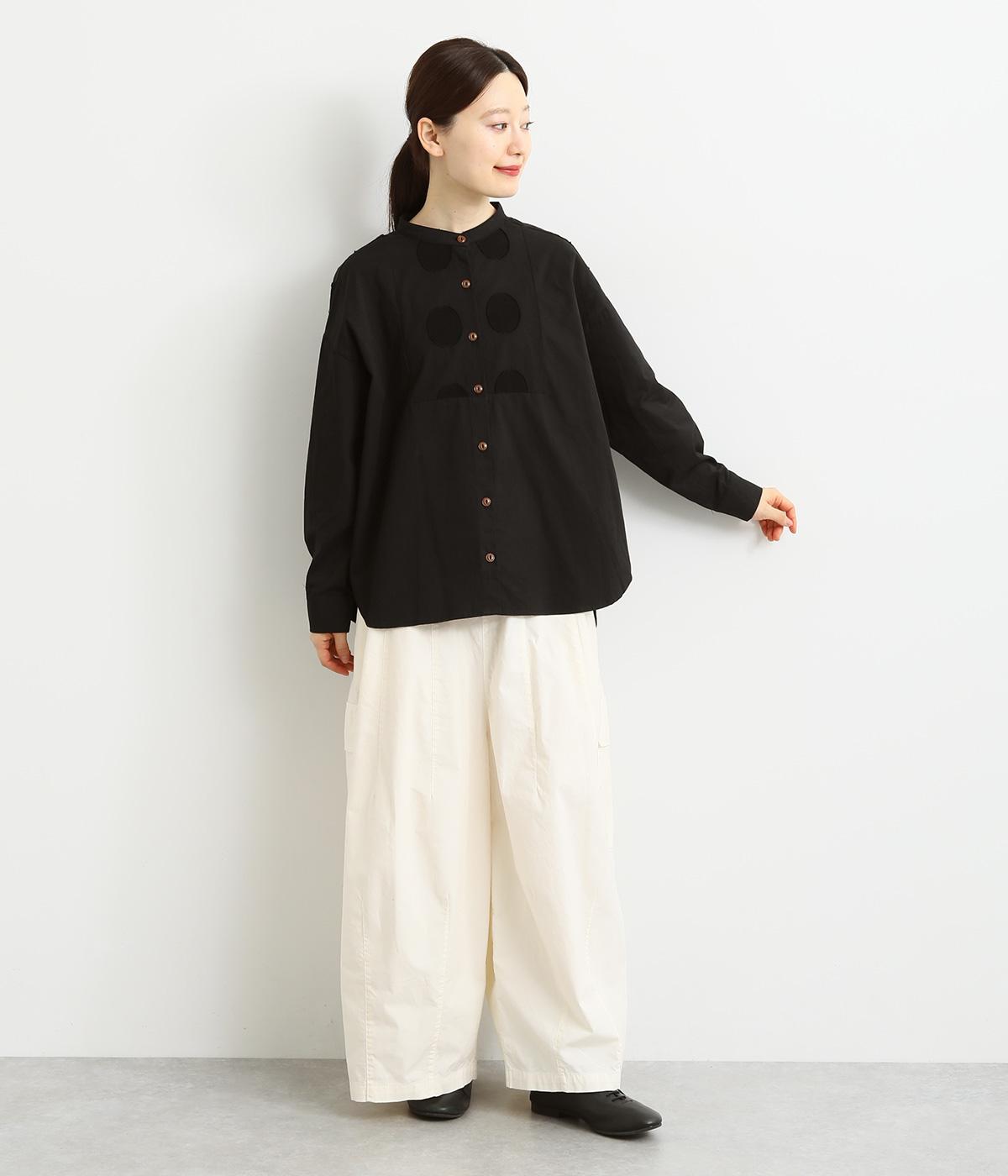 胸部分と背面に大きなドットをあしらいました。ドットを立体的にすることでさりげなく個性をプラス。バンドカラーですっきり柔らかい印象に。裾は丸みのあるカット。後ろに長さを持たせて体型カバーにも◎。