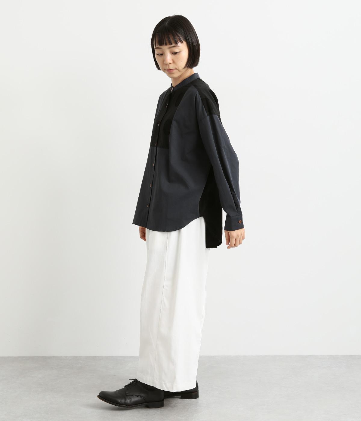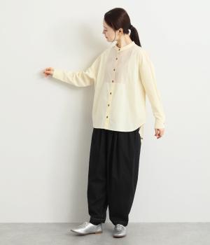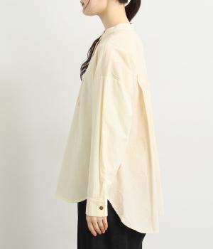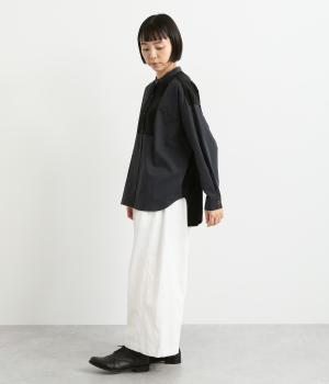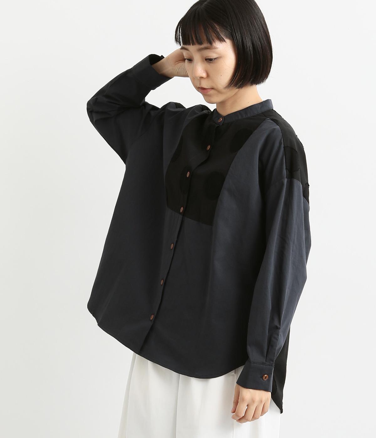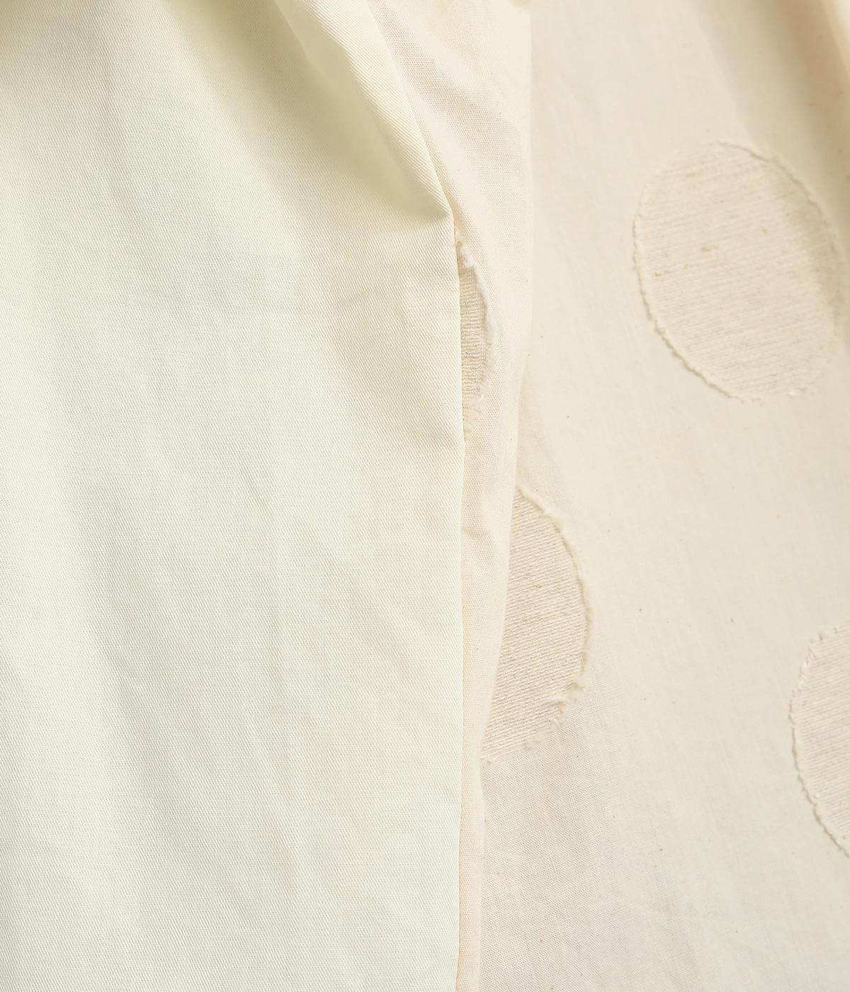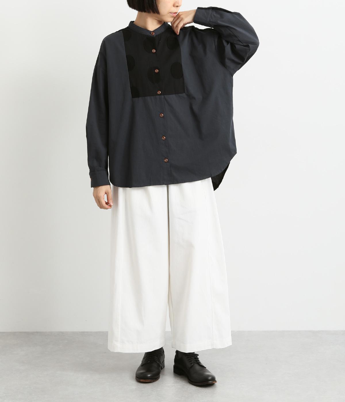 胸部分と背面に大きなドットをあしらいました。ドットを立体的にすることでさりげなく個性をプラス。バンドカラーですっきり柔らかい印象に。裾は丸みのあるカット。後ろに長さを持たせて体型カバーにも◎。