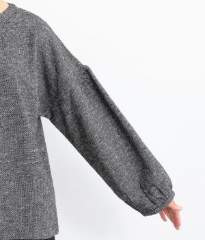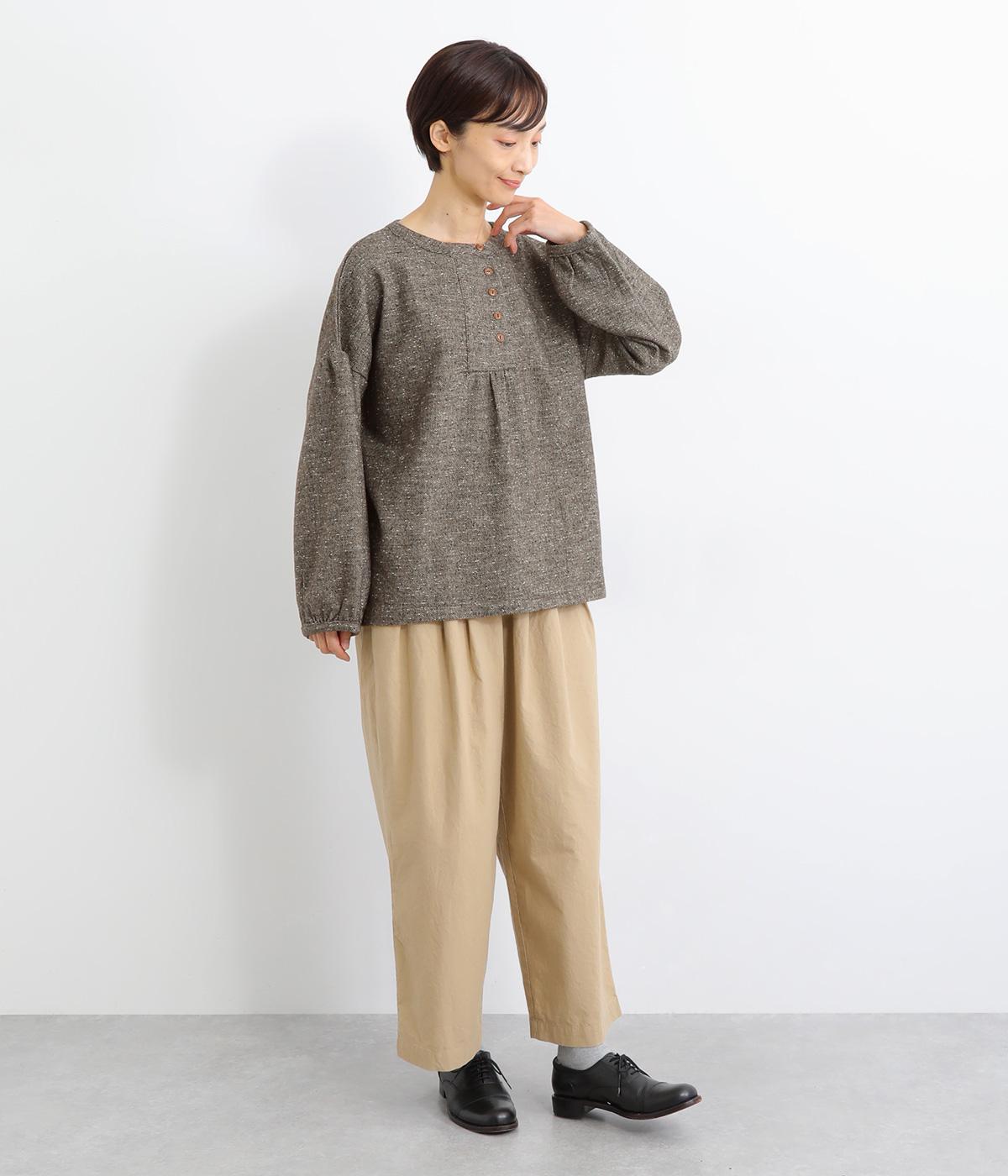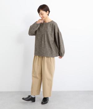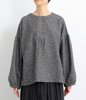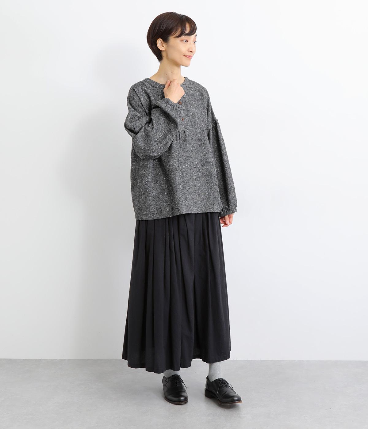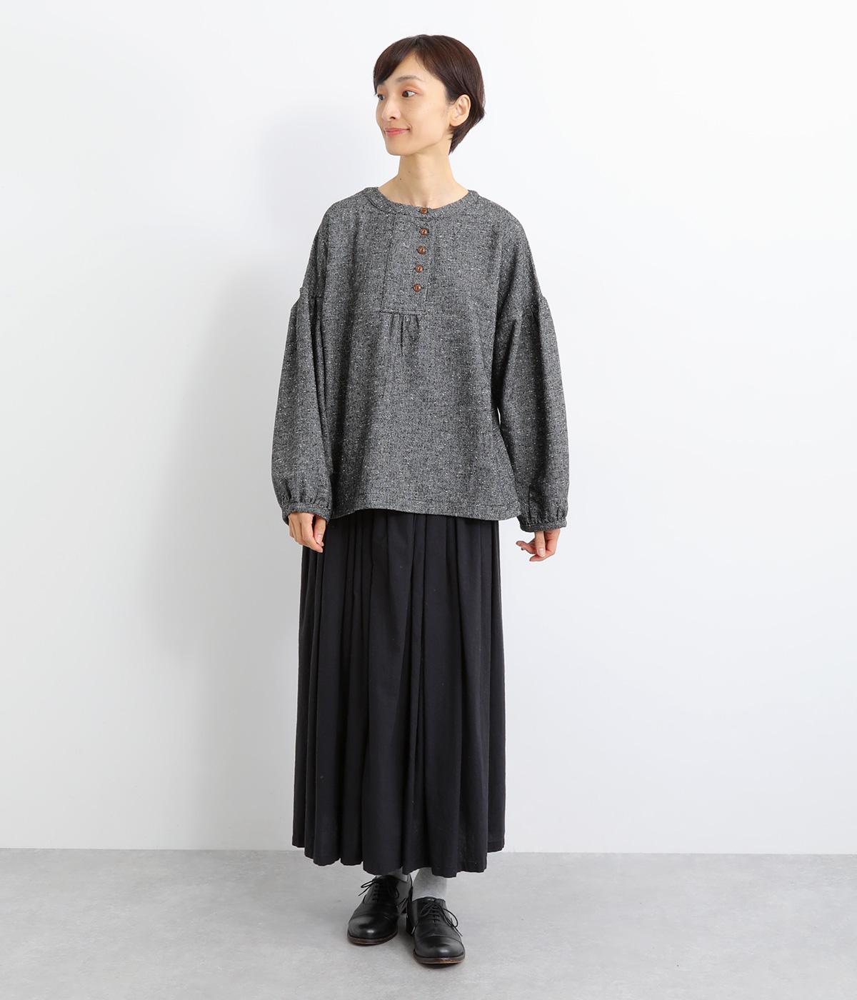 ギャザーを入れふんわりとさせた愛らしい袖と、あたたかみのある生地感がポイントのシャツ。体のラインを拾いにくいゆったりとしたシルエットに仕上げました。ボタンを並べたフロントのデザインもお洒落。視線をアップさせて全体のバランスを整えています。