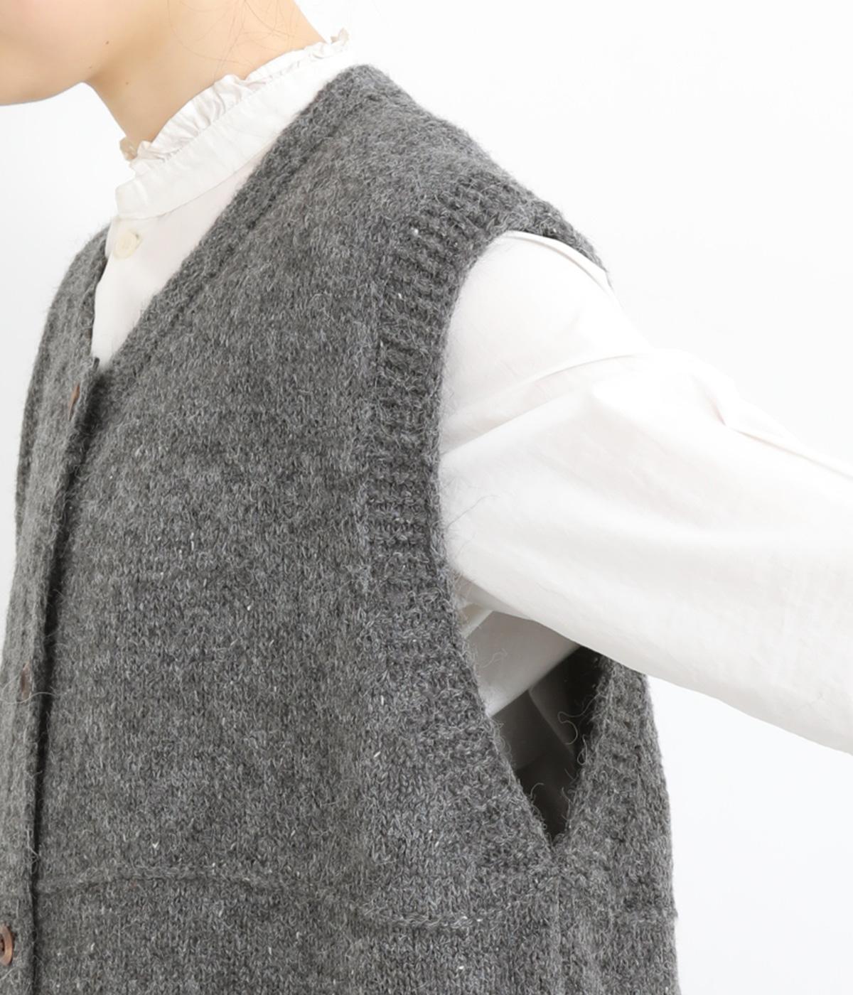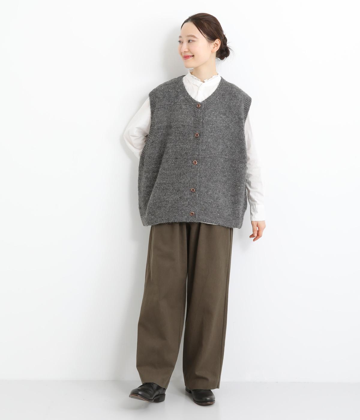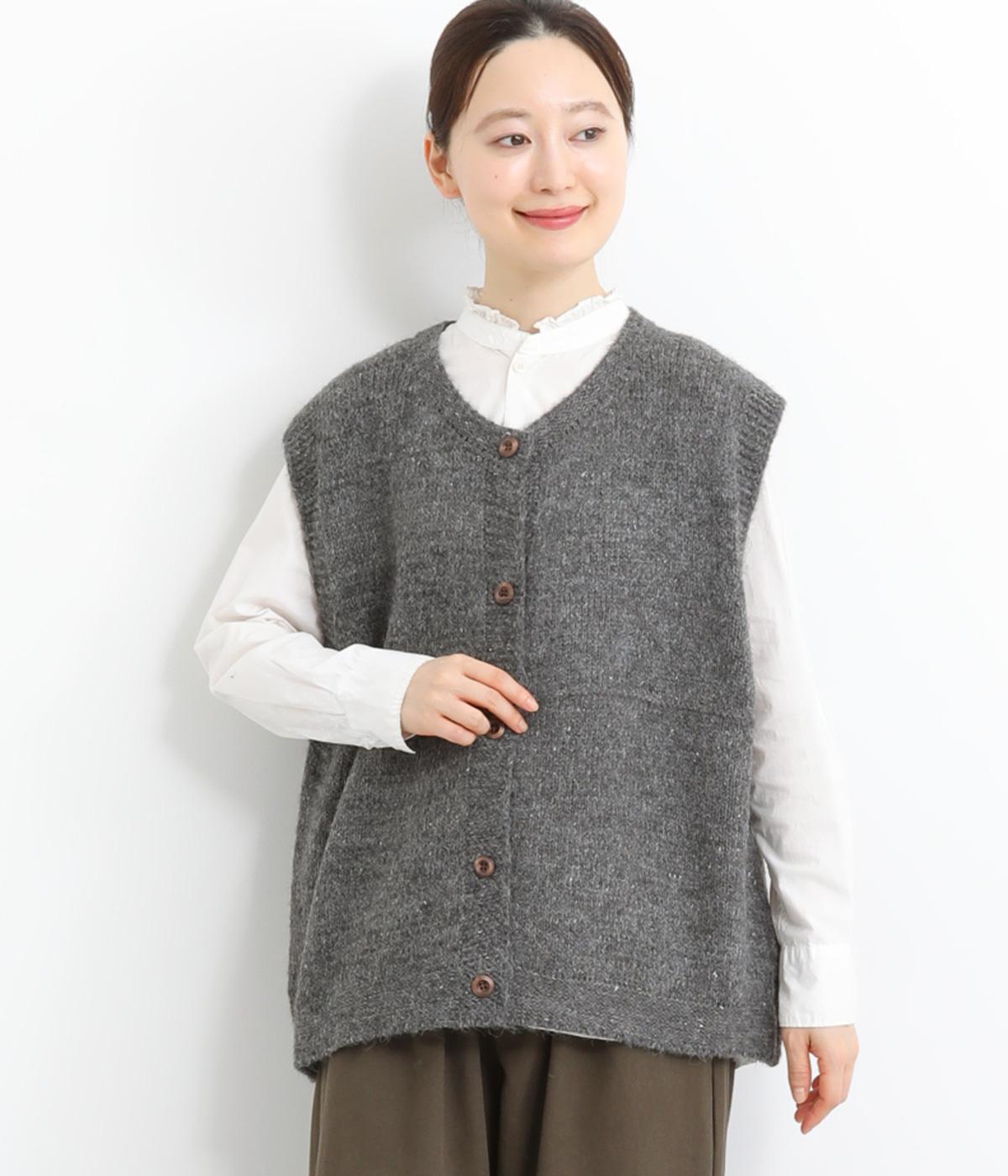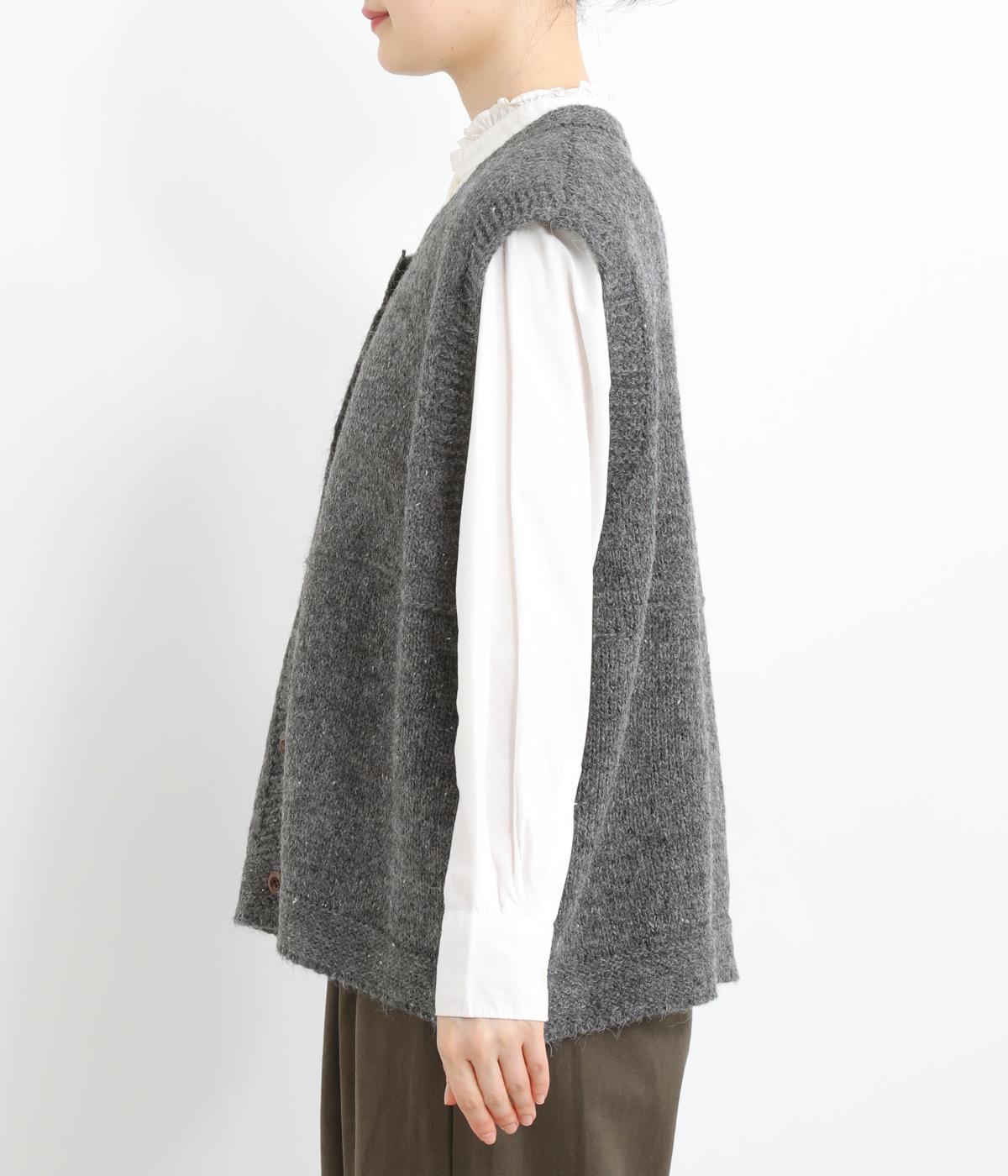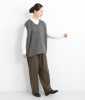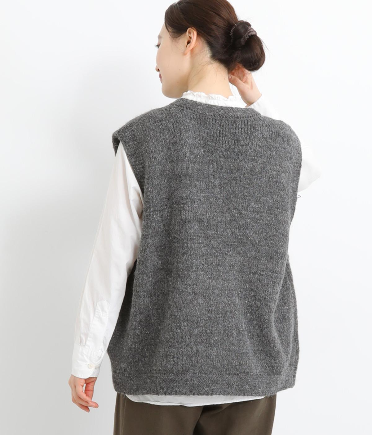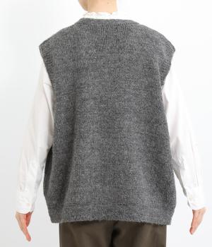 シンプルでストンとしたボックスシルエットがかわいらしいベスト。ゆったりとした首まわりはインナー次第でいろいろなスタイルにアレンジできるのが魅力的です。カジュアルながらも女性らしさを演出してくれる一着です。