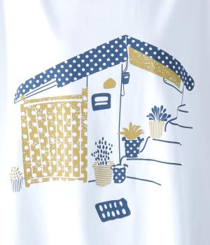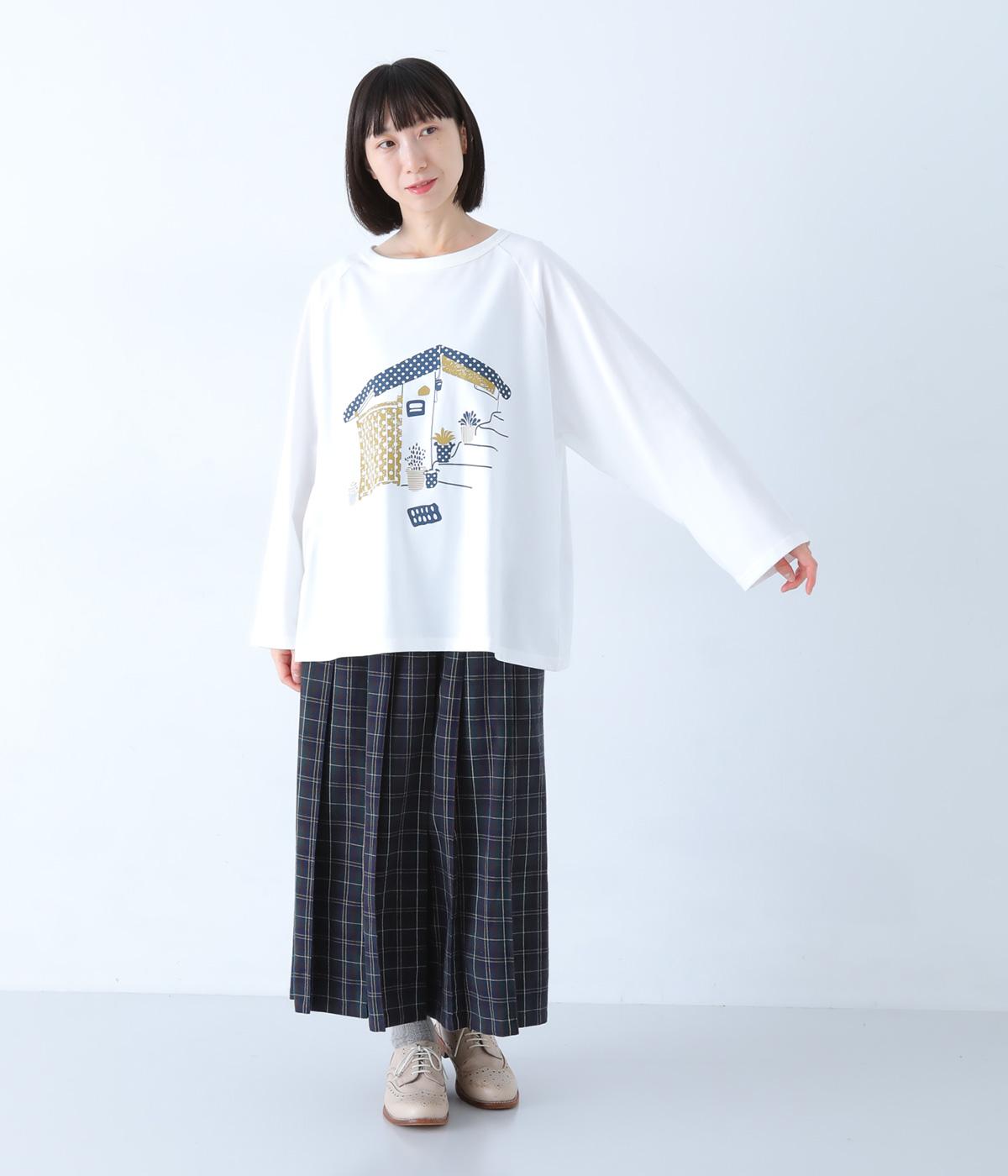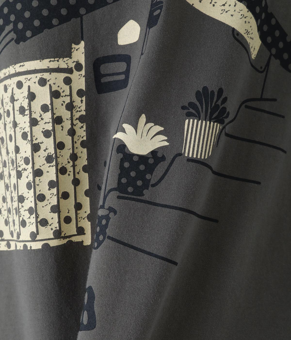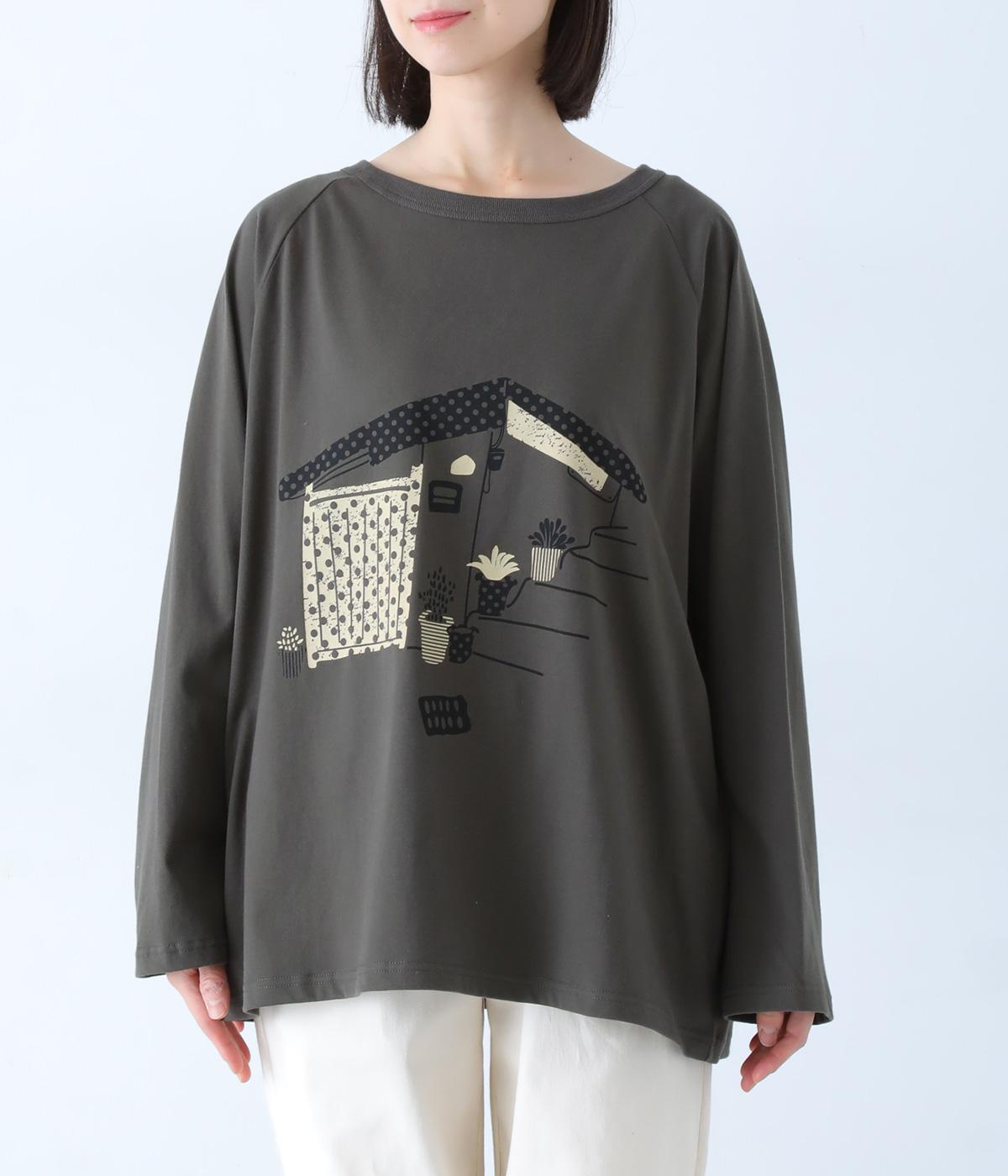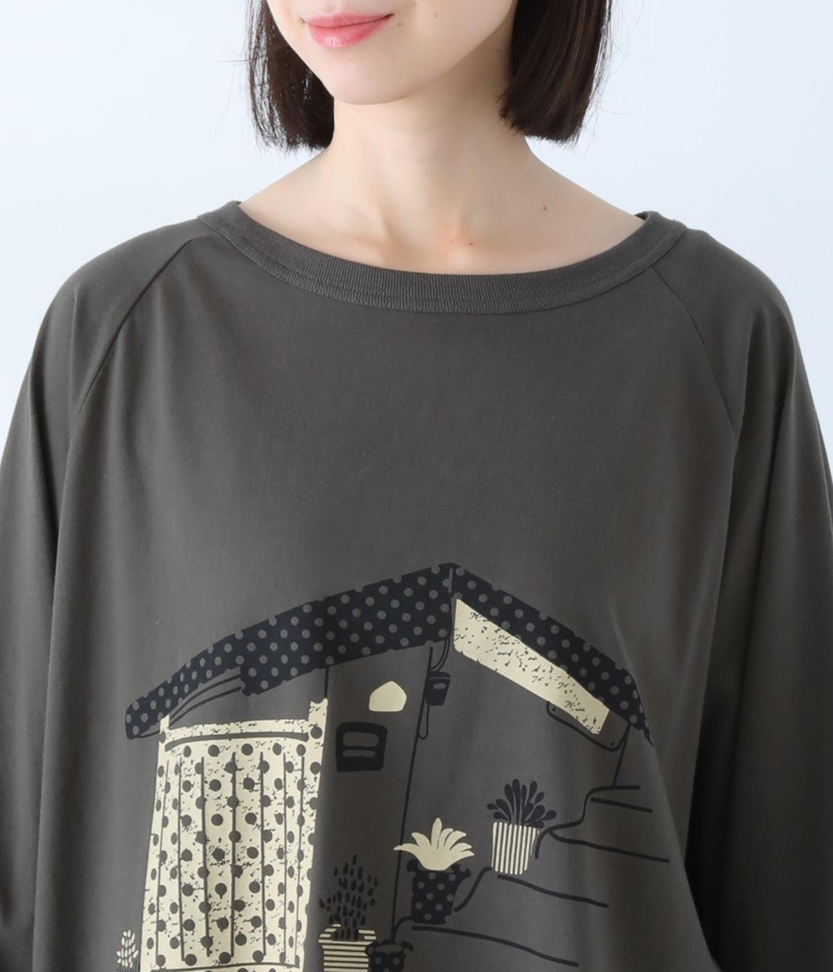 おしゃれなカフェをイメージしたプリントの長袖Tシャツです。広めの襟ぐりが顔まわりをすっきりと見せてくれます。裾、袖ともにゆとりがあり、見た目も着心地もリラックス感たっぷり。デイリーに活躍するアイテムです。