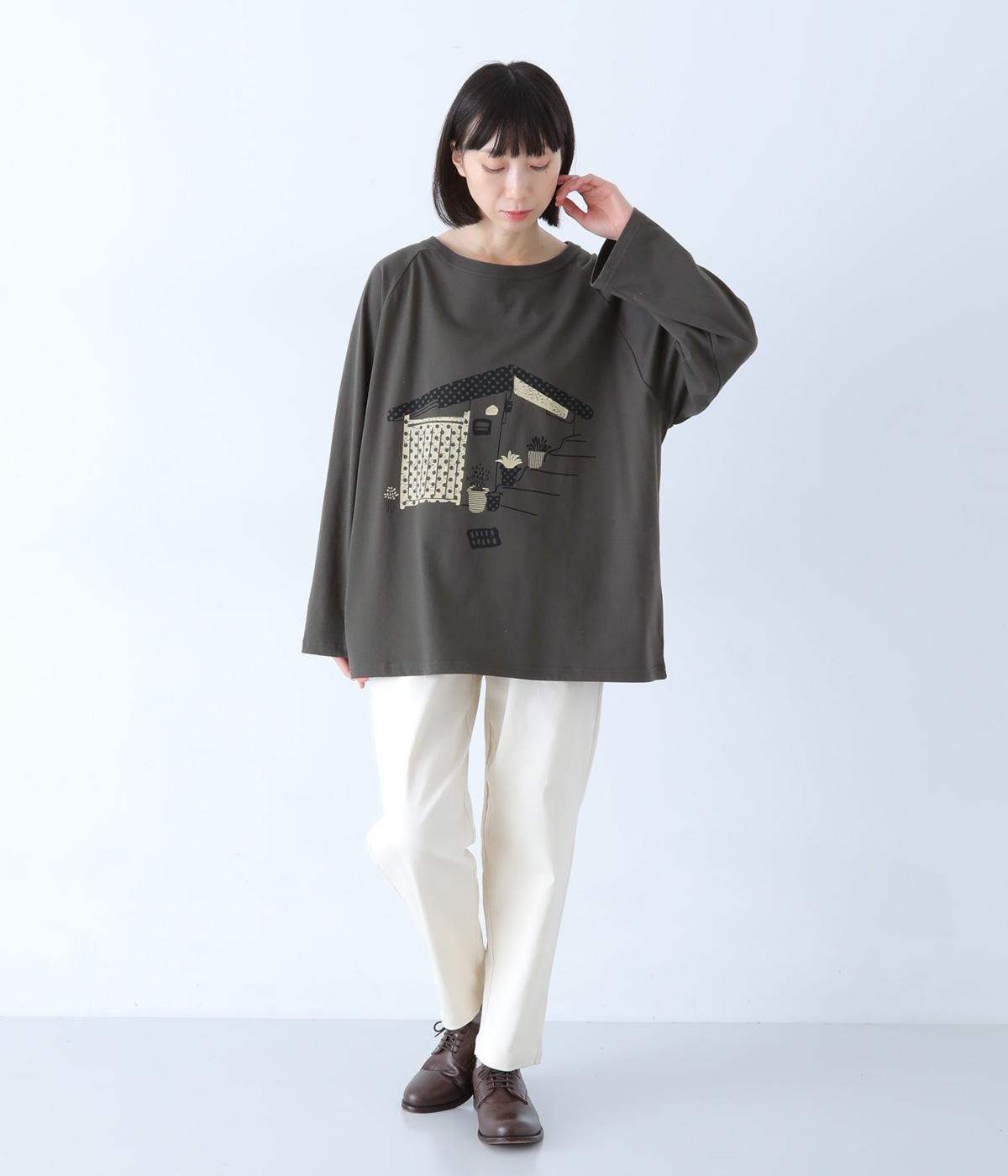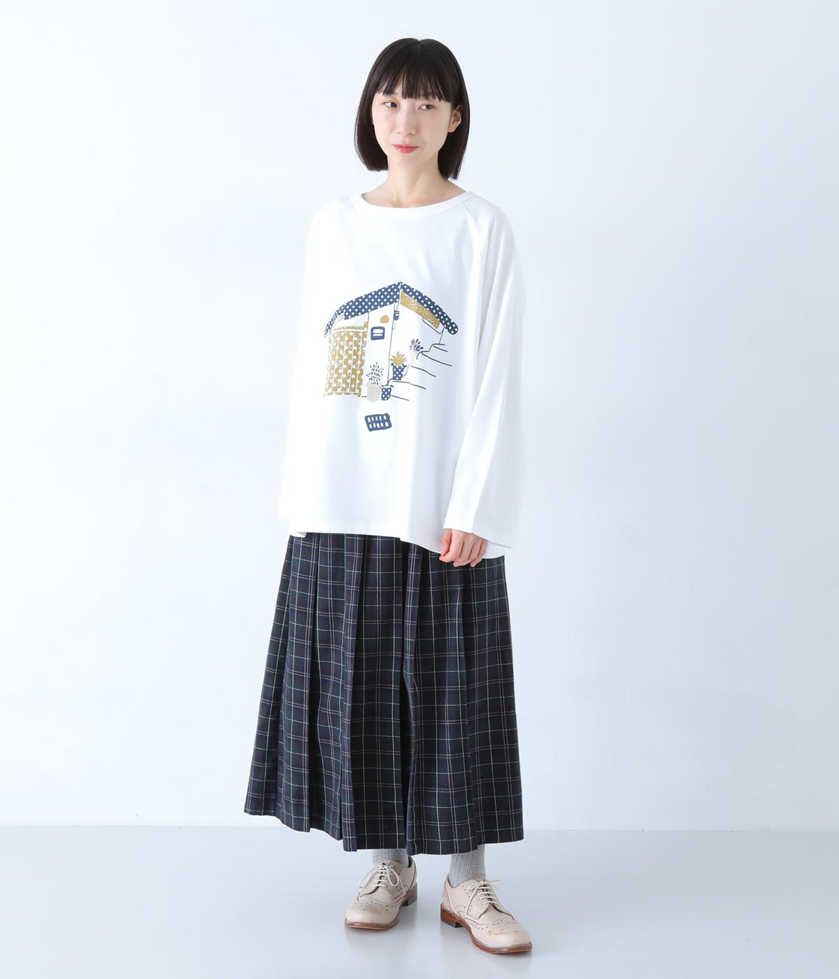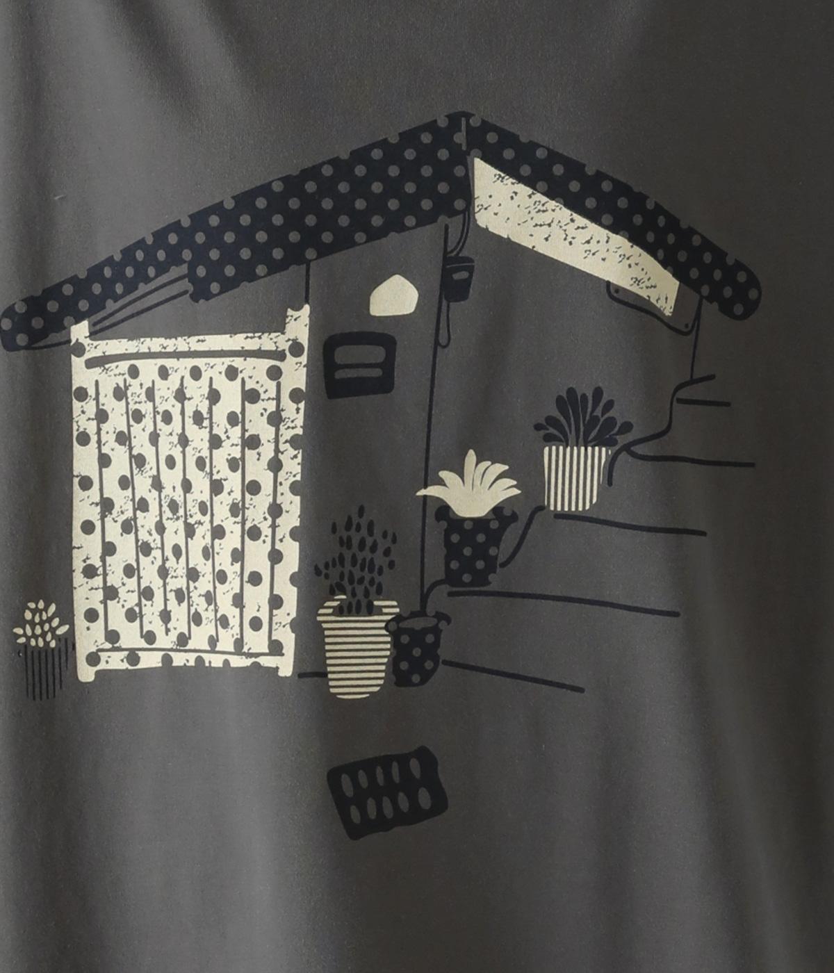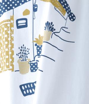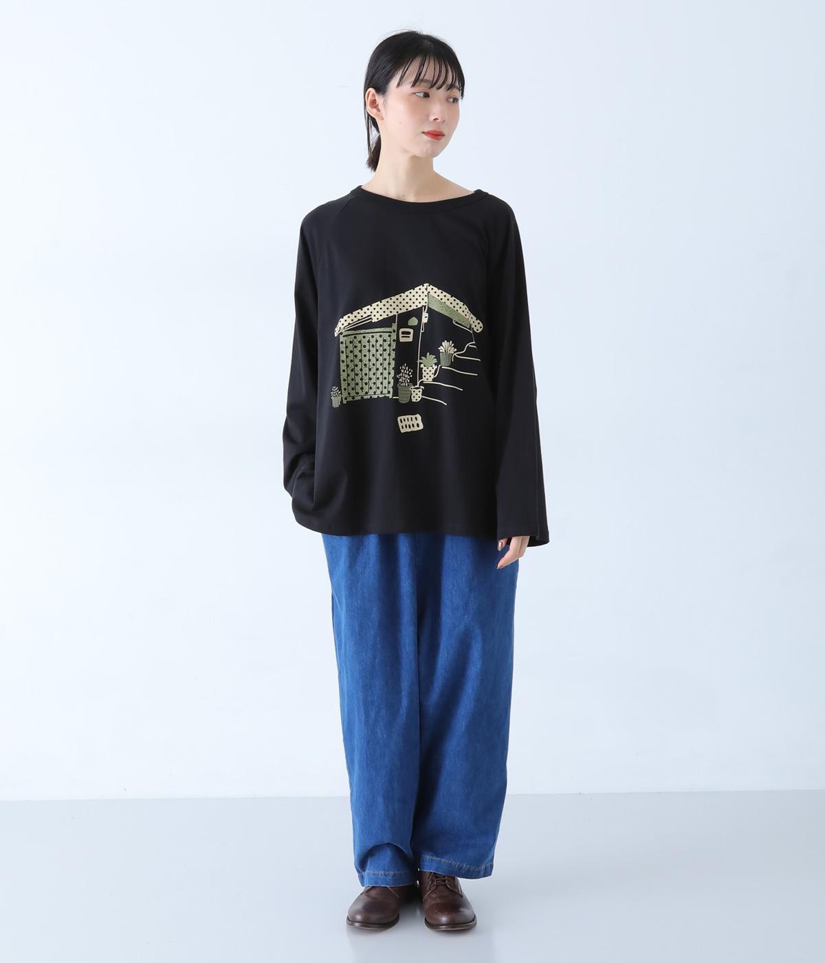 おしゃれなカフェをイメージしたプリントの長袖Tシャツです。広めの襟ぐりが顔まわりをすっきりと見せてくれます。裾、袖ともにゆとりがあり、見た目も着心地もリラックス感たっぷり。デイリーに活躍するアイテムです。
