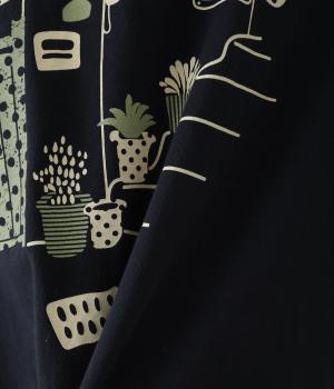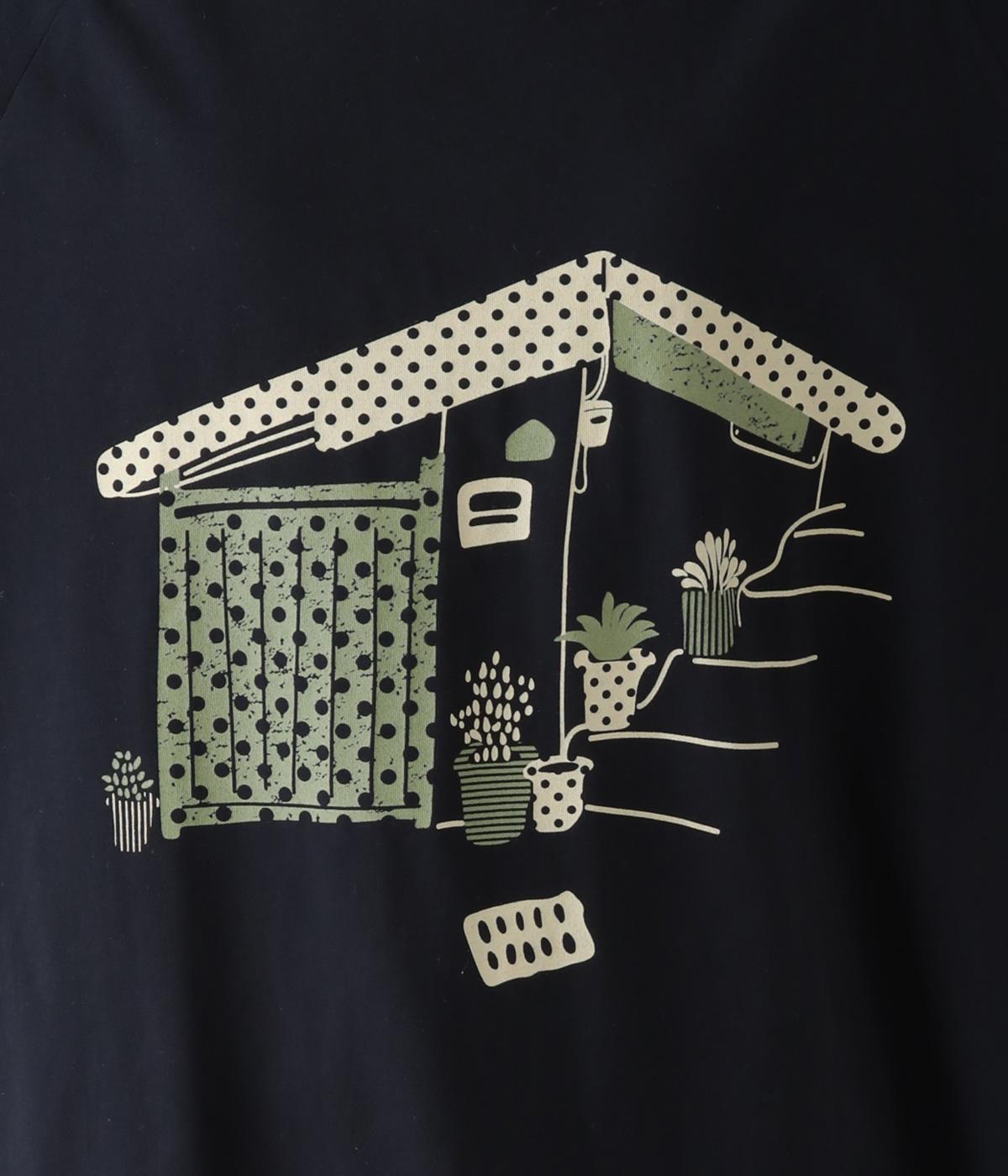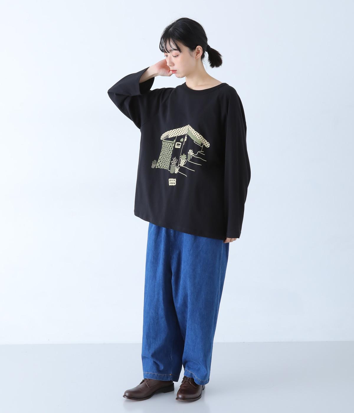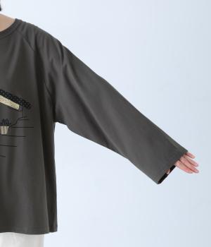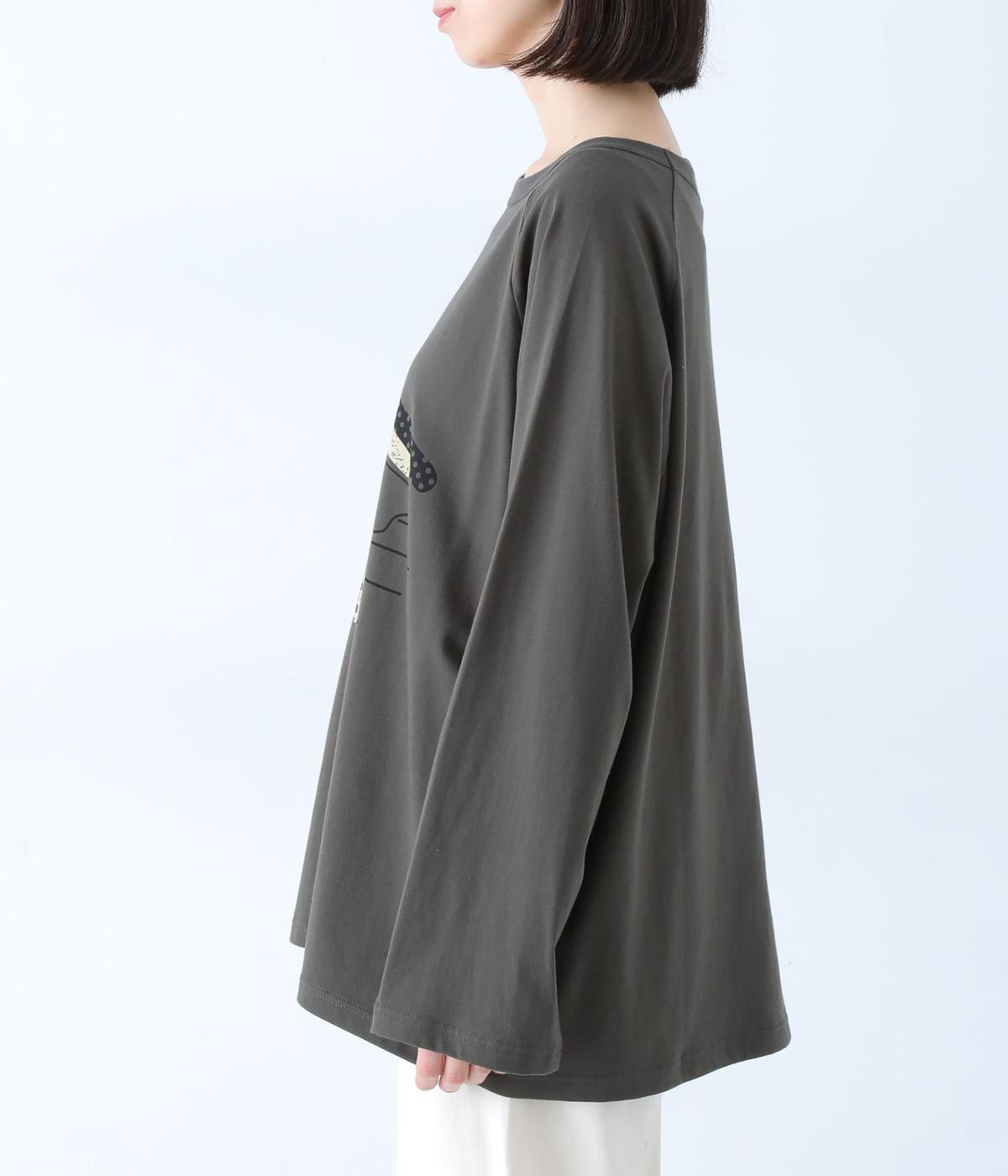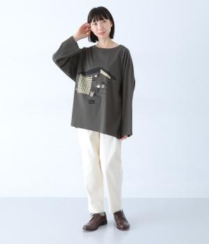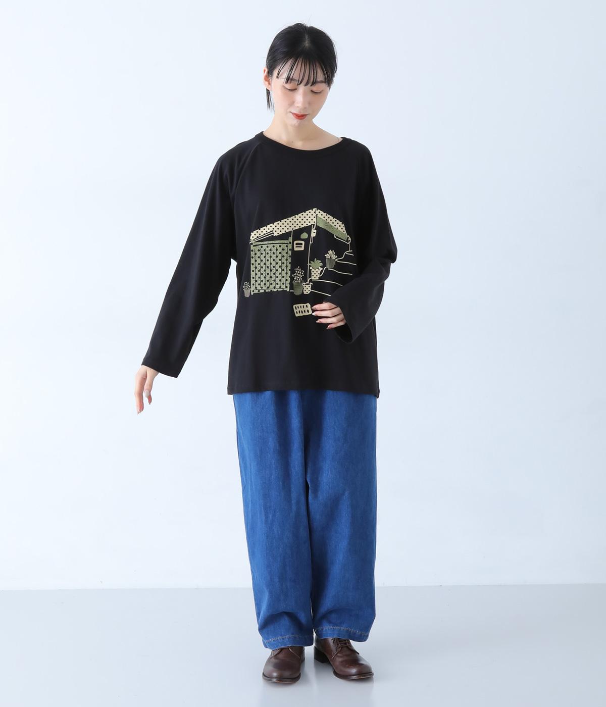 おしゃれなカフェをイメージしたプリントの長袖Tシャツです。広めの襟ぐりが顔まわりをすっきりと見せてくれます。裾、袖ともにゆとりがあり、見た目も着心地もリラックス感たっぷり。デイリーに活躍するアイテムです。