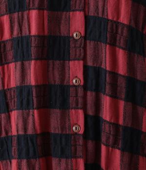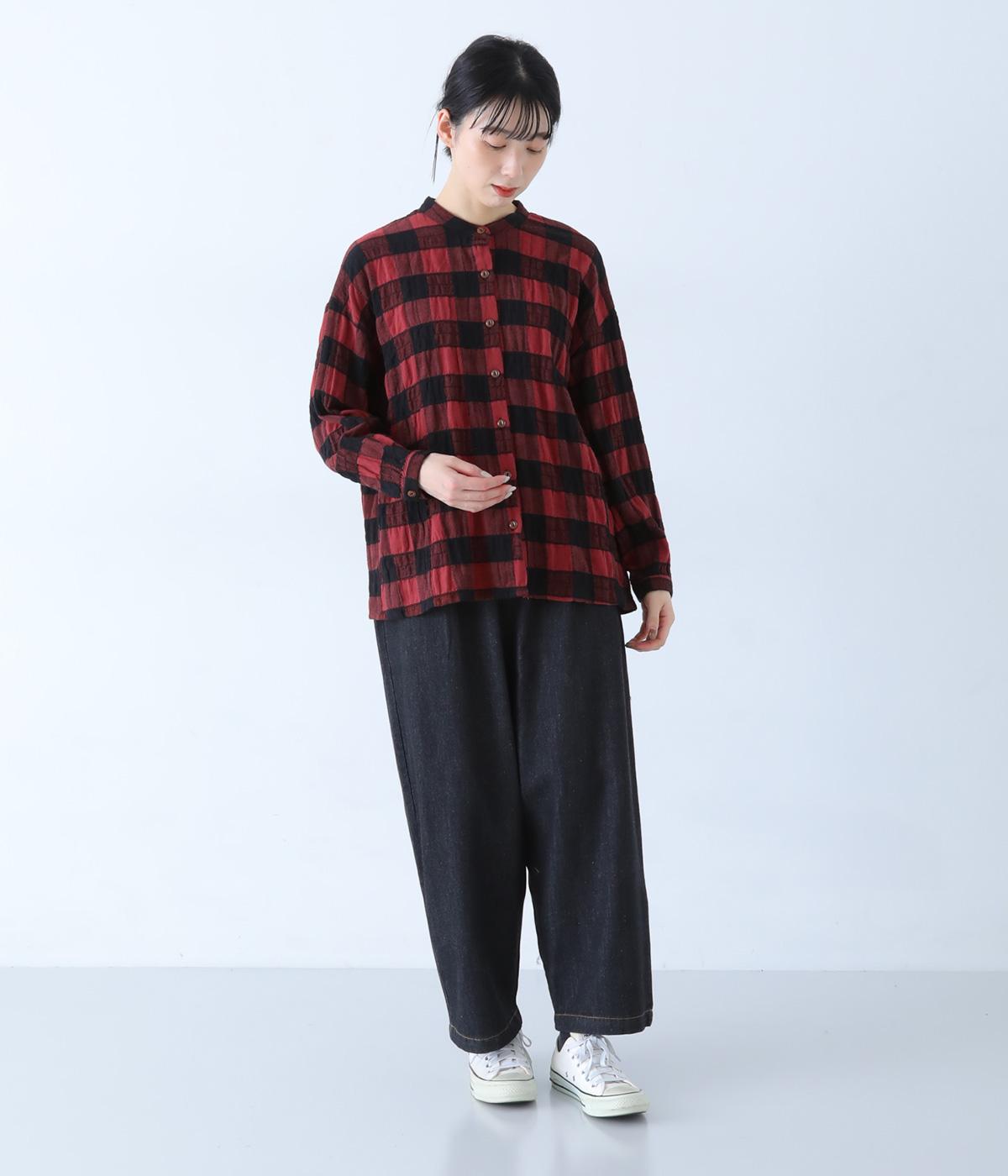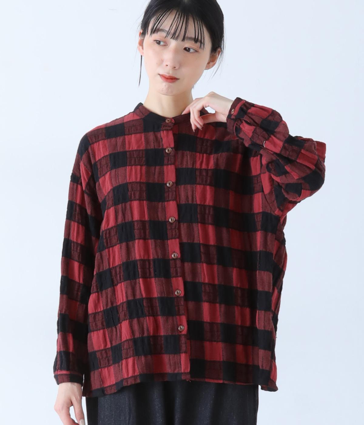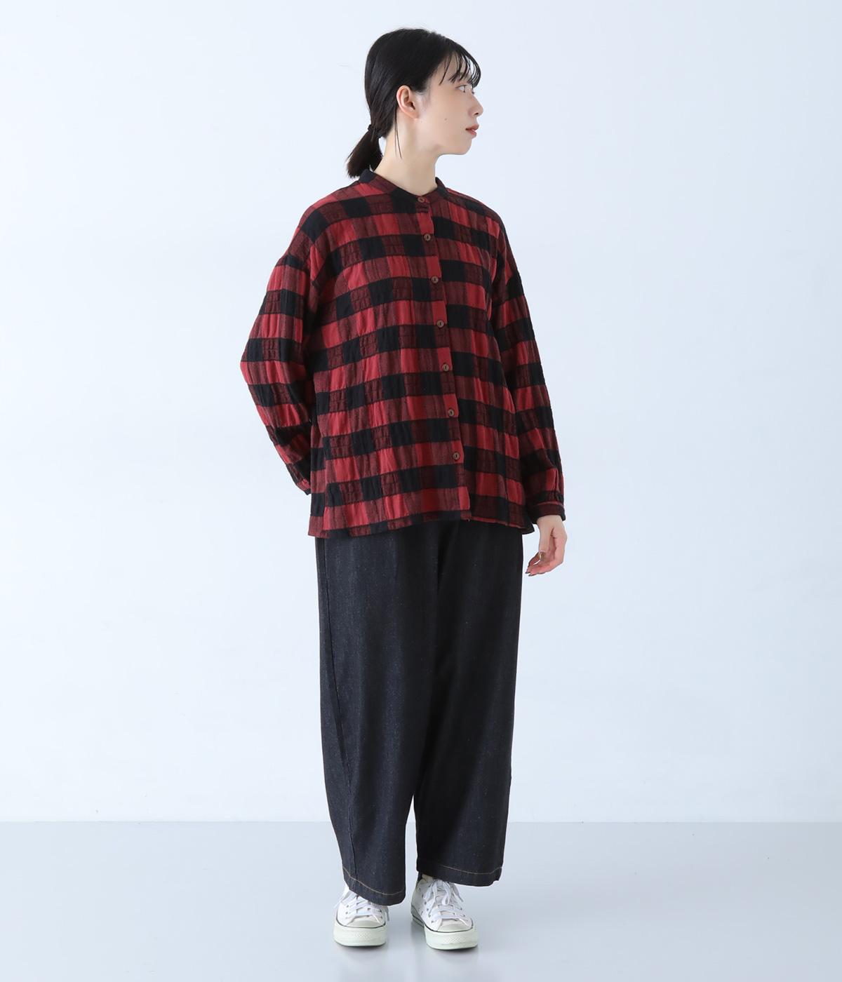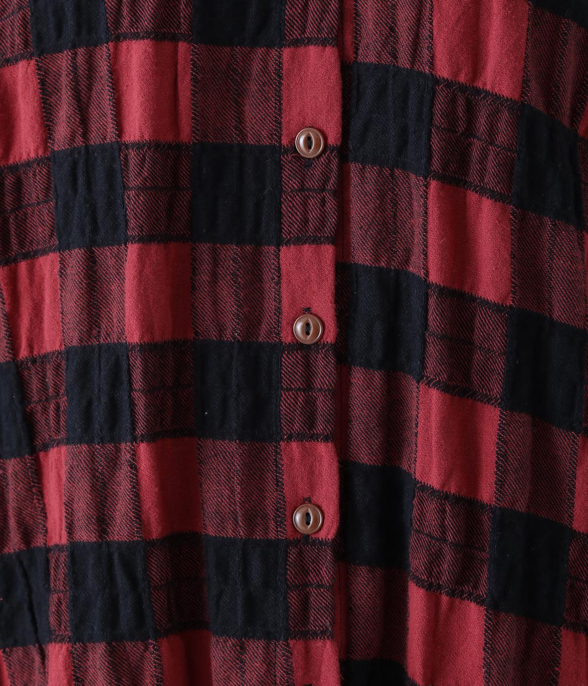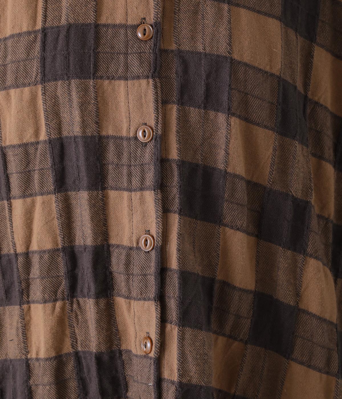 深みのある配色のブロックチェック柄。表面にポコポコとした凹凸のある、シワ加工を施した生地を使用しています。ニュアンスたっぷりの素材が、奥行きのある表情を生み出します。