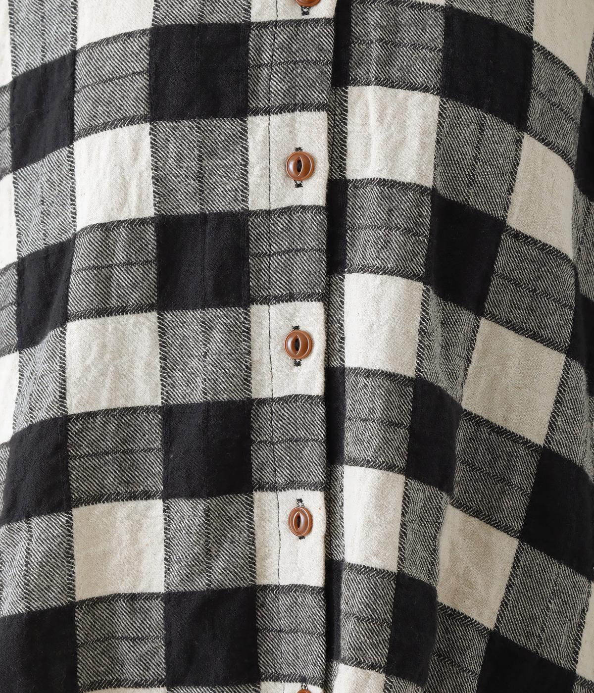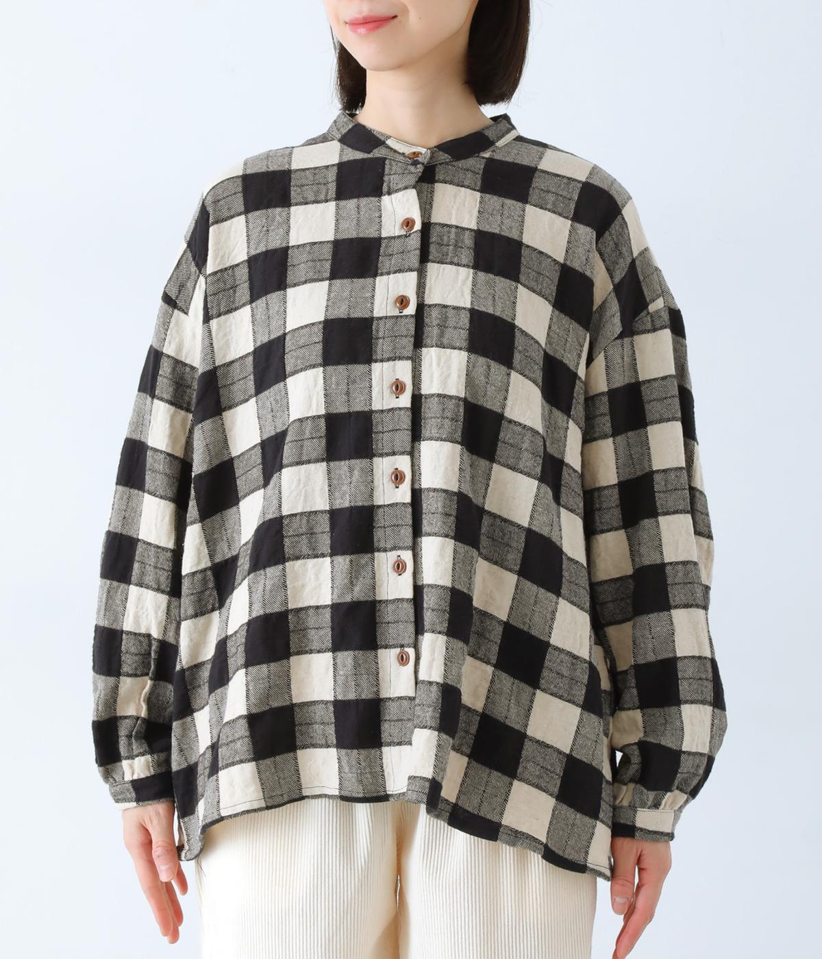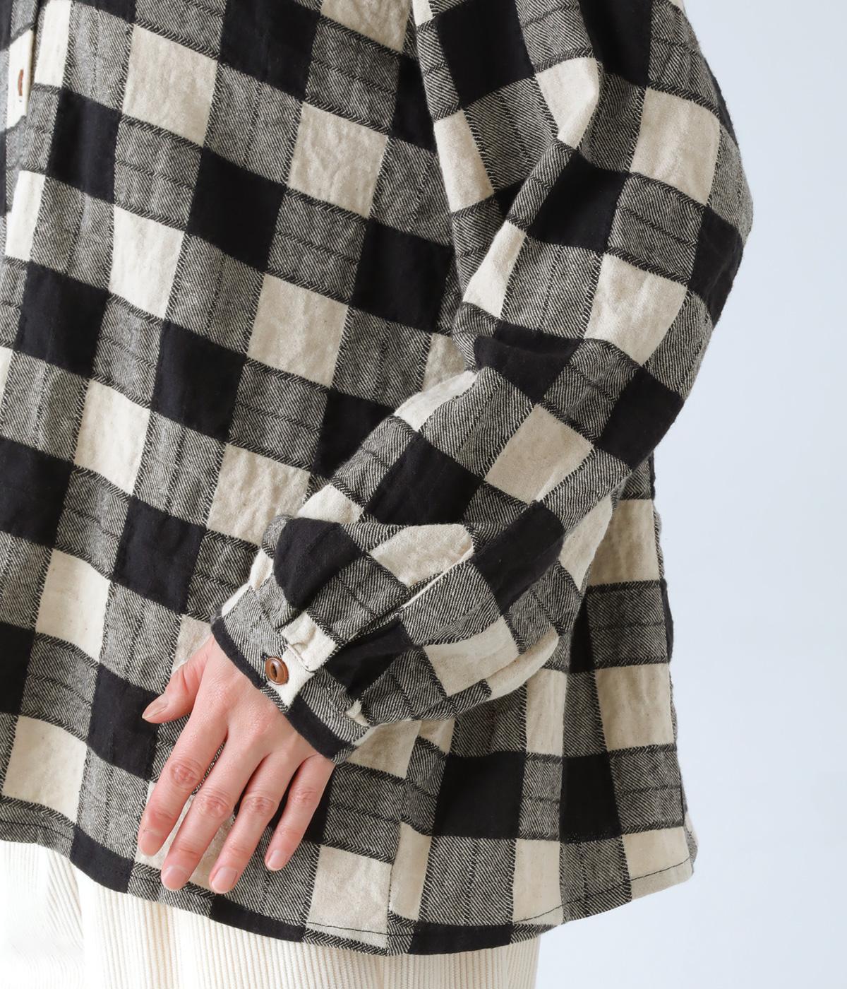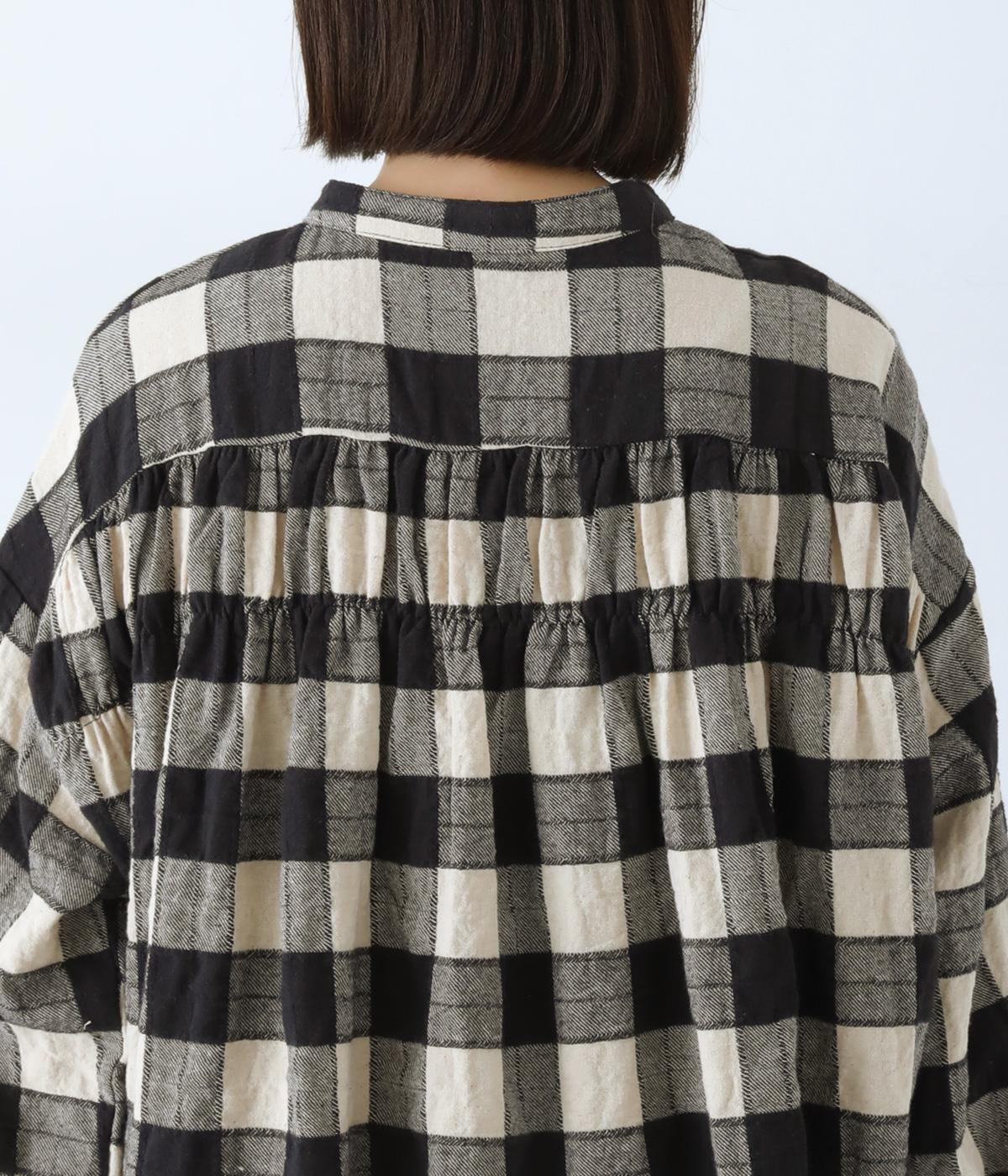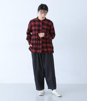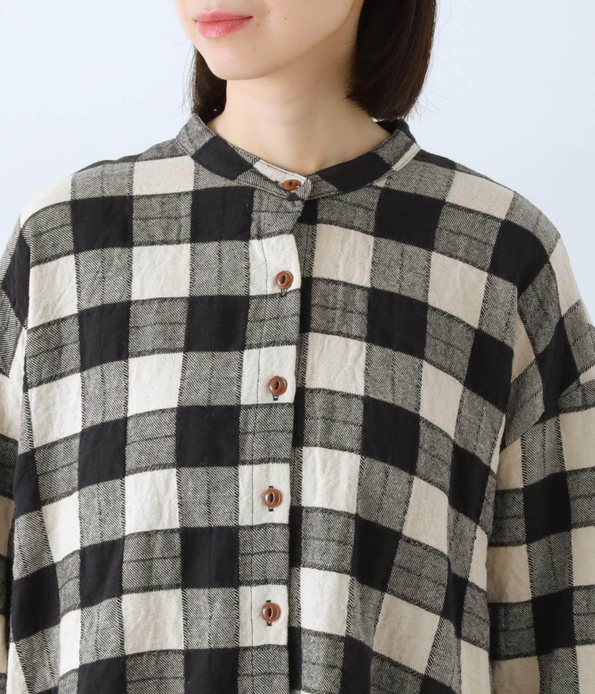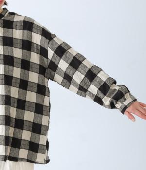 深みのある配色のブロックチェック柄。表面にポコポコとした凹凸のある、シワ加工を施した生地を使用しています。ニュアンスたっぷりの素材が、奥行きのある表情を生み出します。