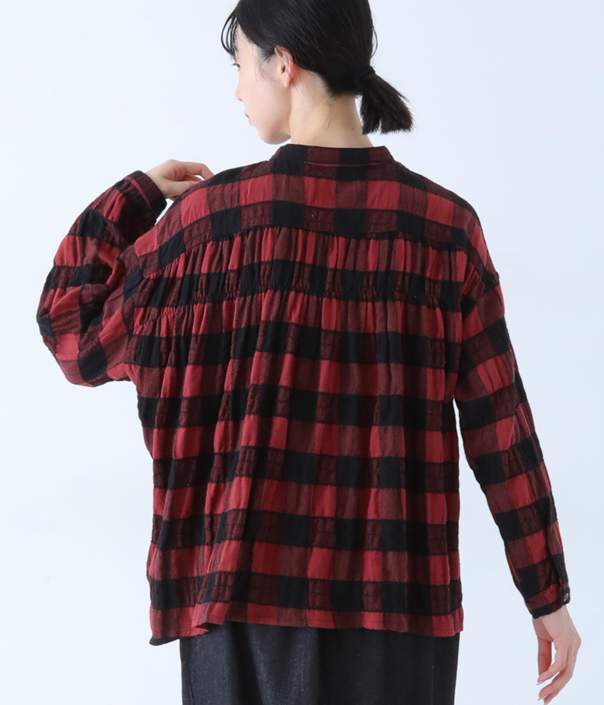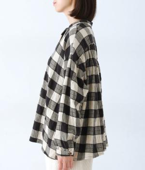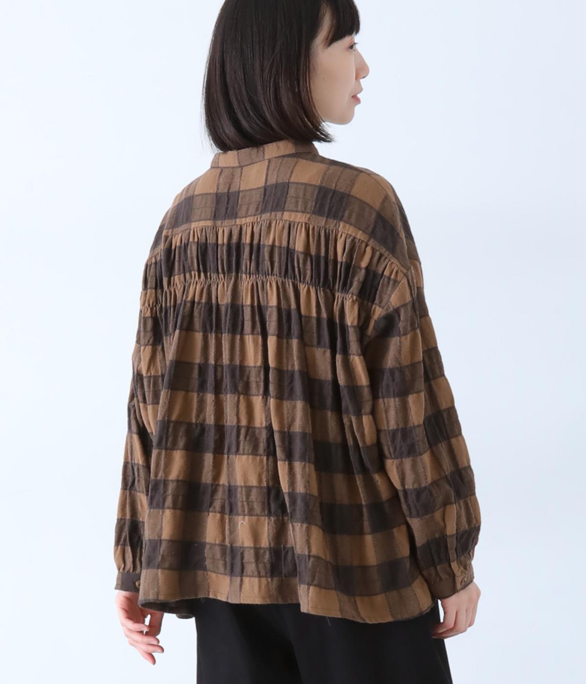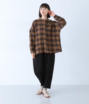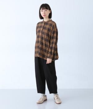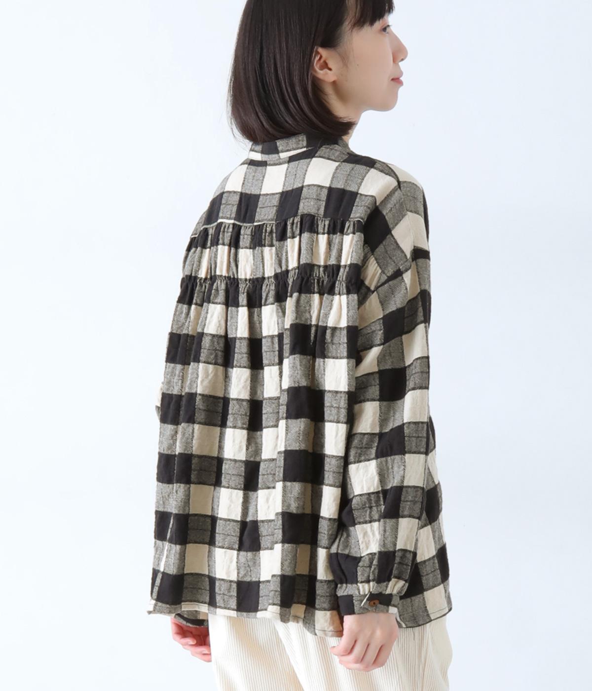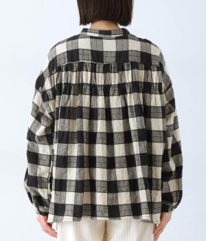 フロントはすっきりとシンプルに、後ろはシャーリングゴムを入れて動きやすく華やかに仕上げたブラウス。木調のボタンで着こなしになじみやすい一枚です。中にタートルやカットソーをインしたり、上にニットベストやカーディガンを重ねたり、多彩な着こなしに活躍してくれます。