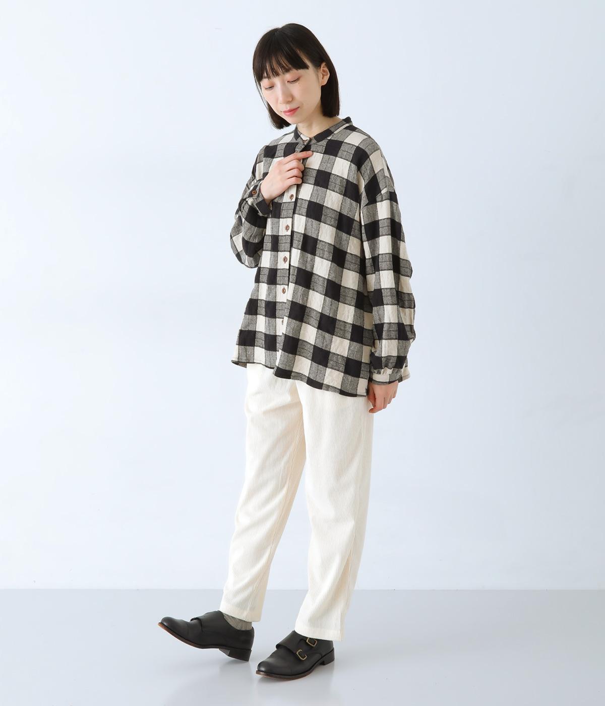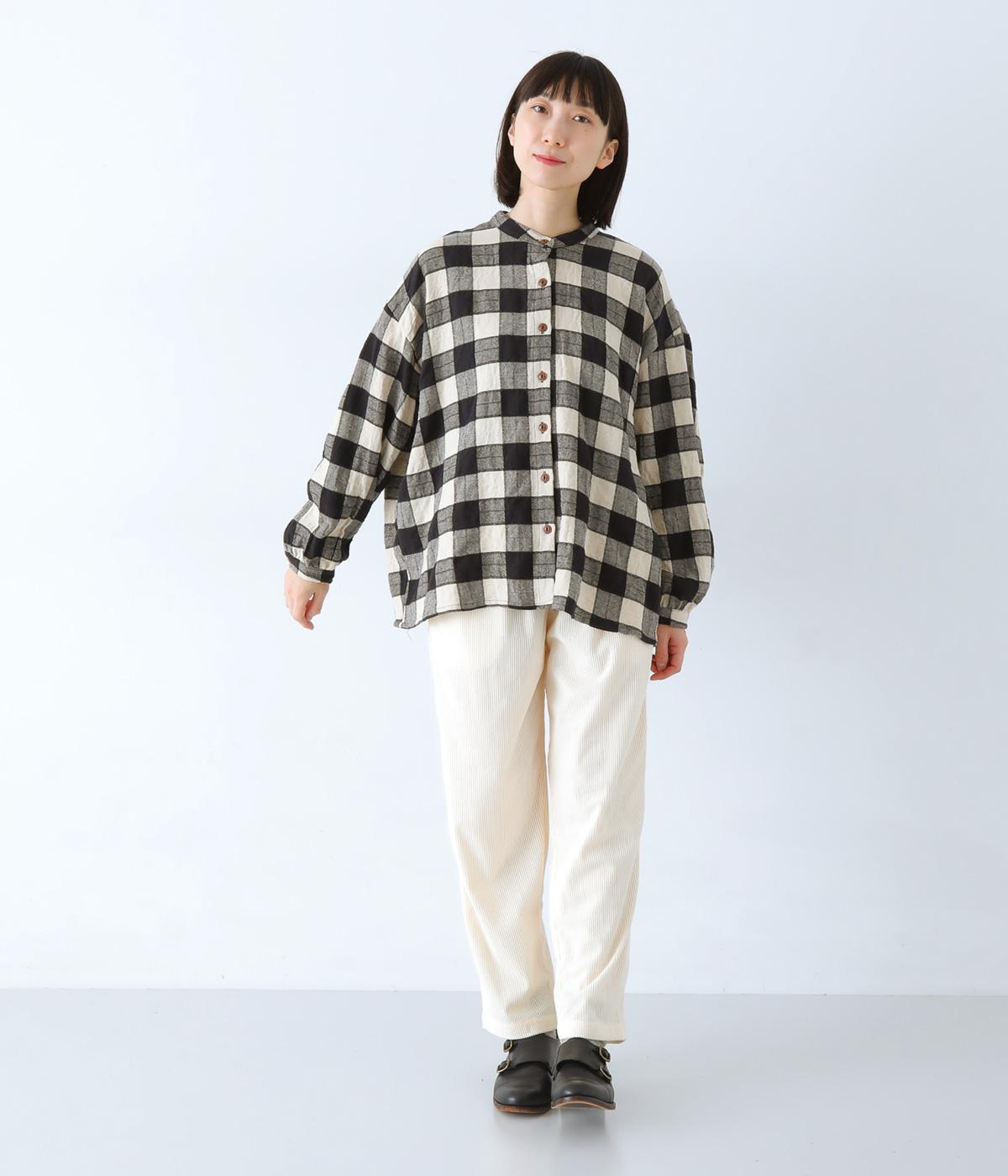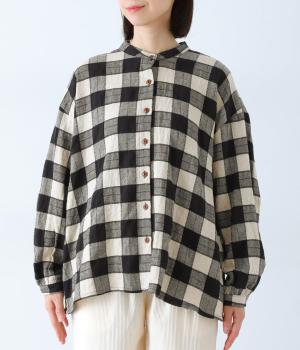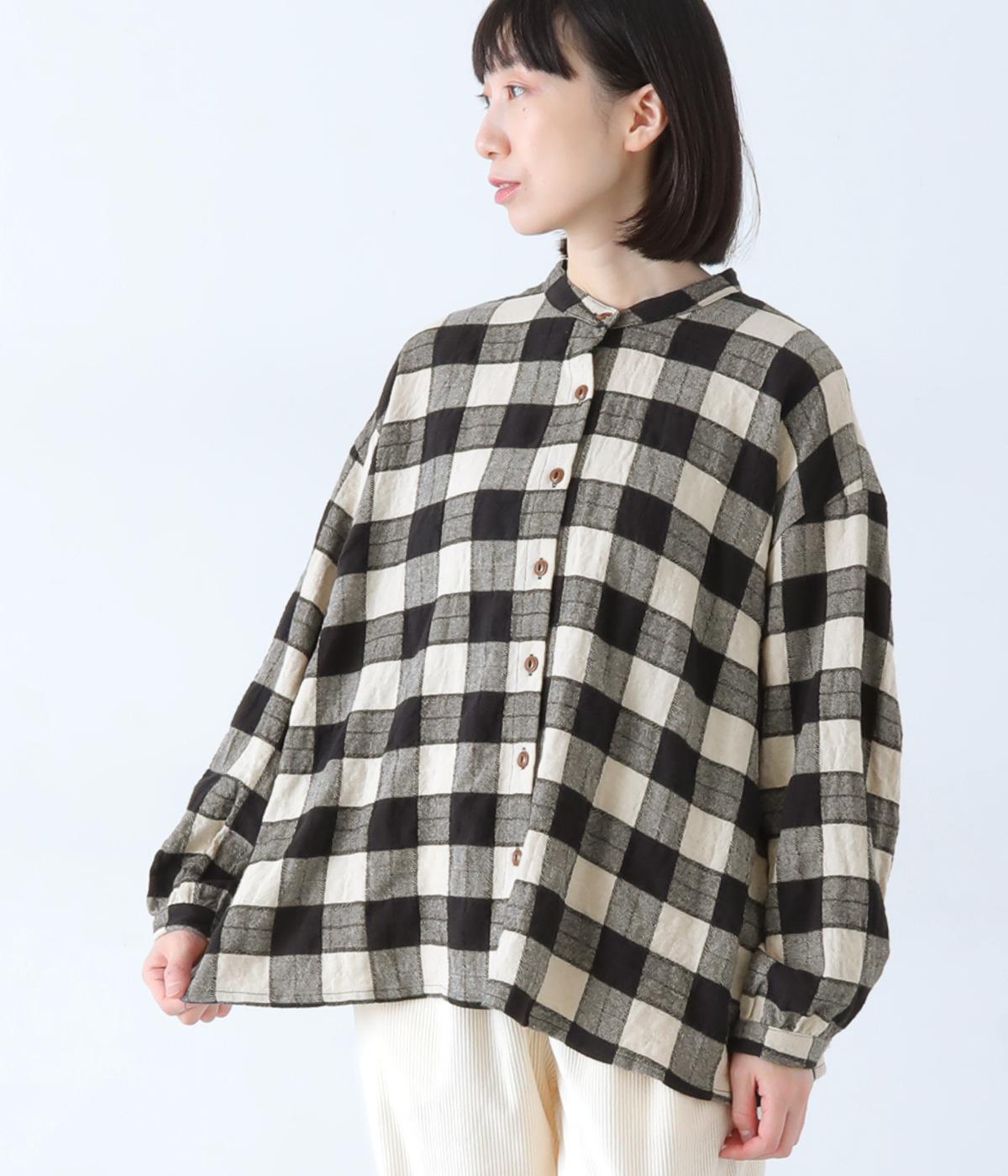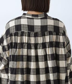 フロントはすっきりとシンプルに、後ろはシャーリングゴムを入れて動きやすく華やかに仕上げたブラウス。木調のボタンで着こなしになじみやすい一枚です。中にタートルやカットソーをインしたり、上にニットベストやカーディガンを重ねたり、多彩な着こなしに活躍してくれます。