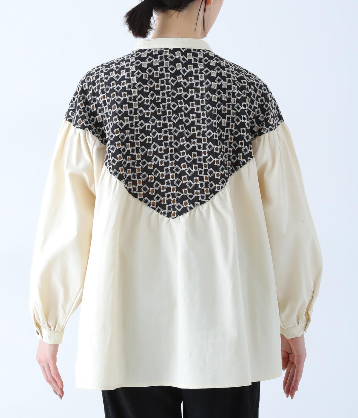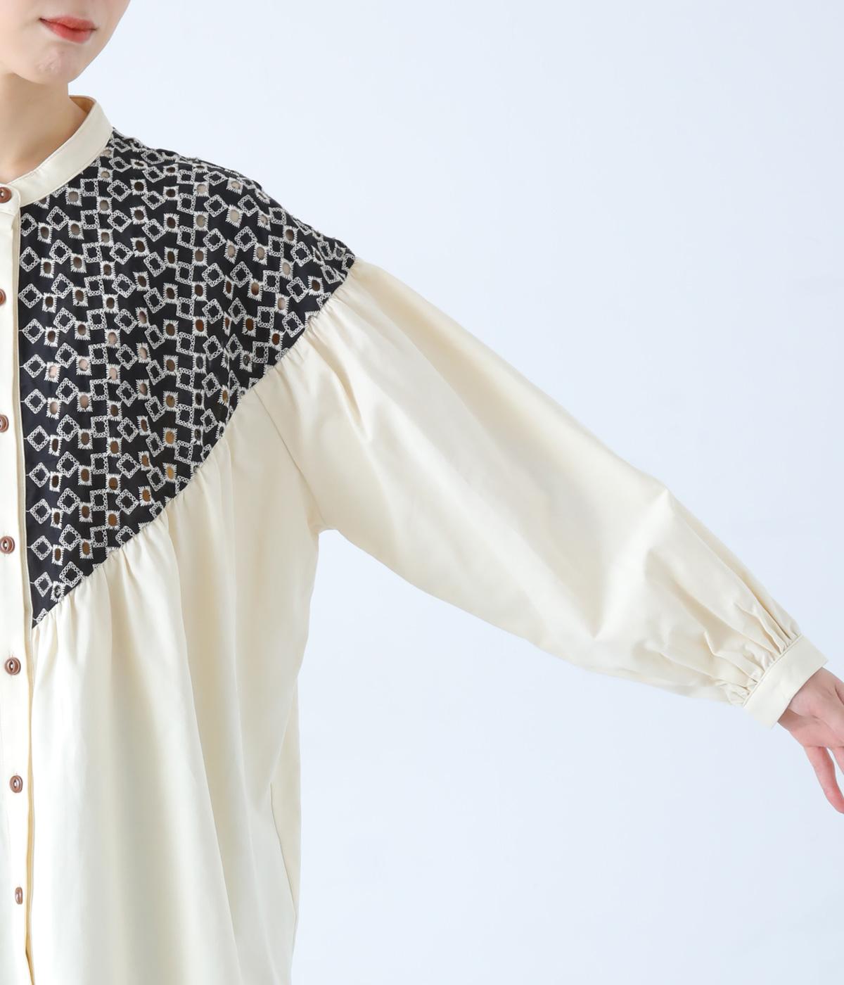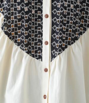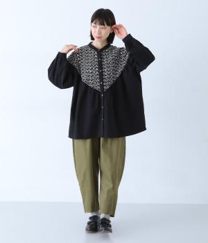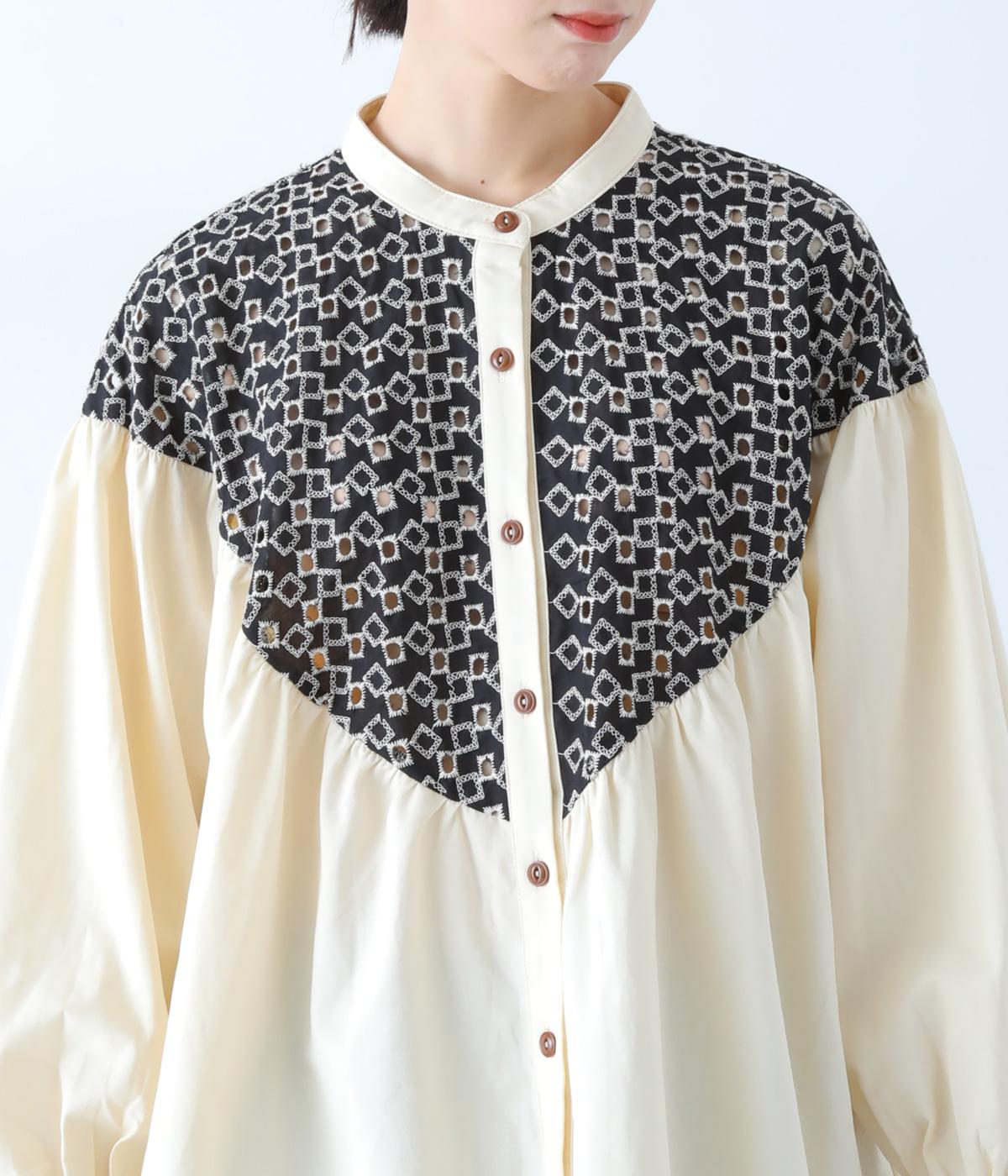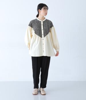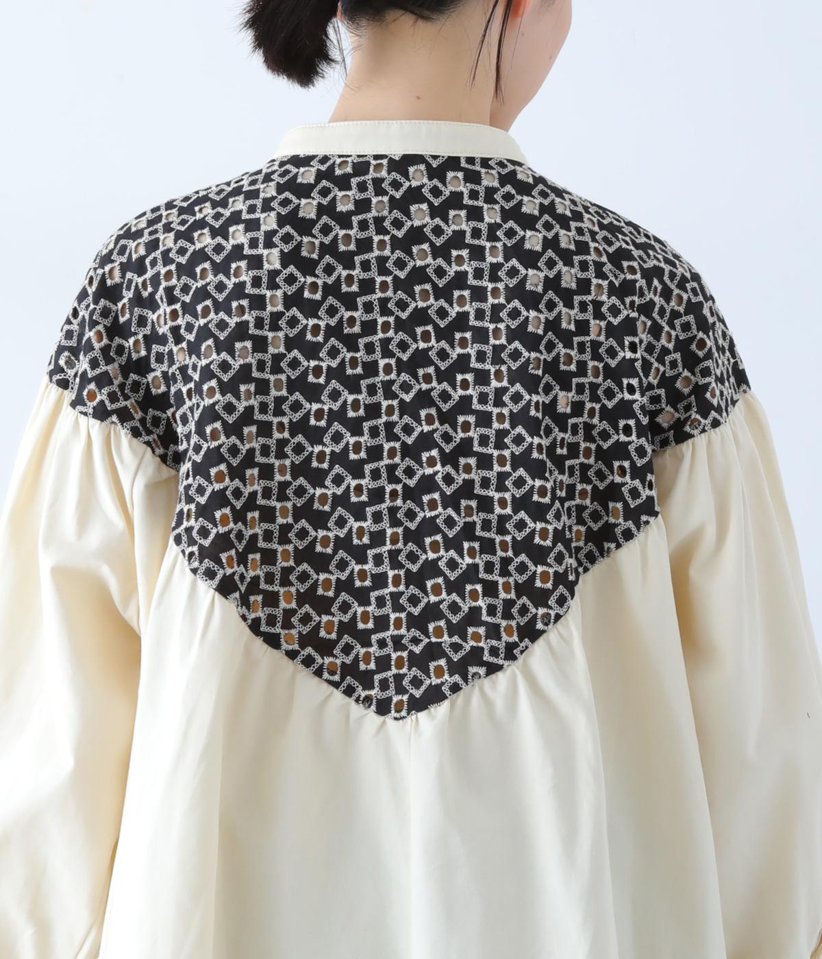 ヨーク部分に透かし柄の刺しゅうをあしらった異素材ミックス。ベースの無地はやわらかなコットンで、着心地よく仕上げています。