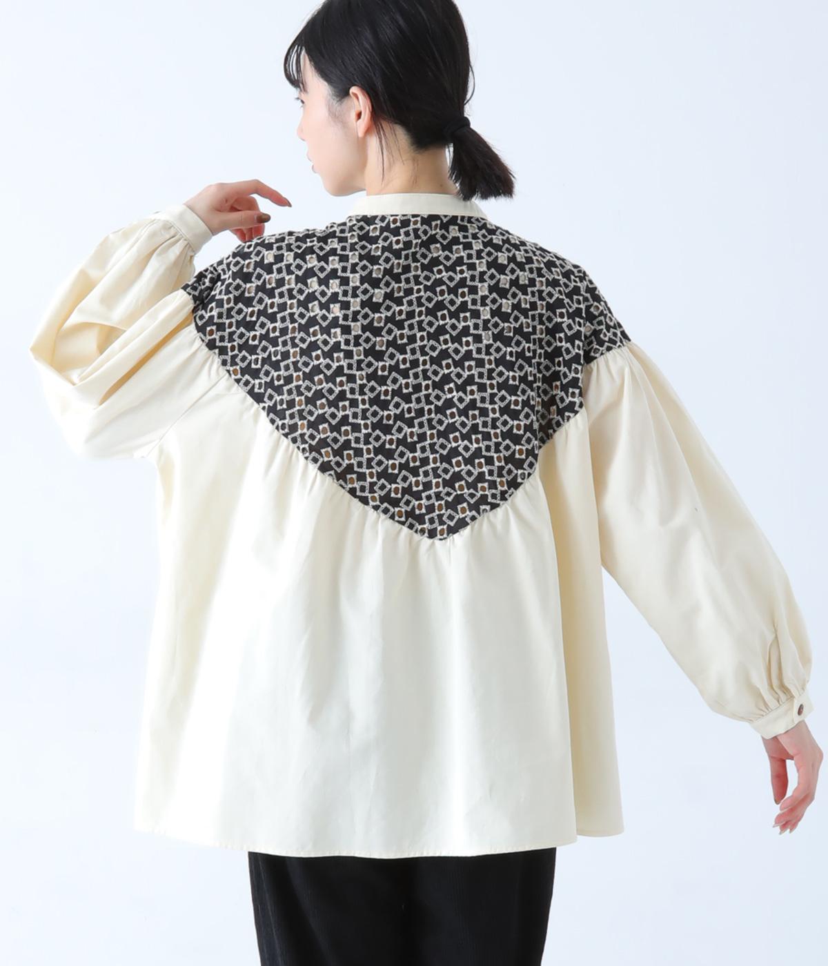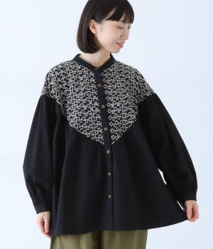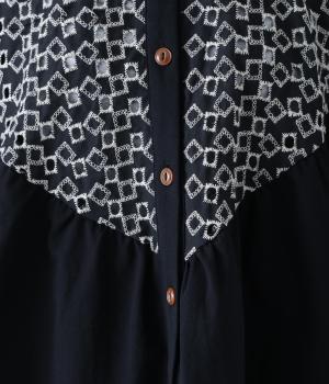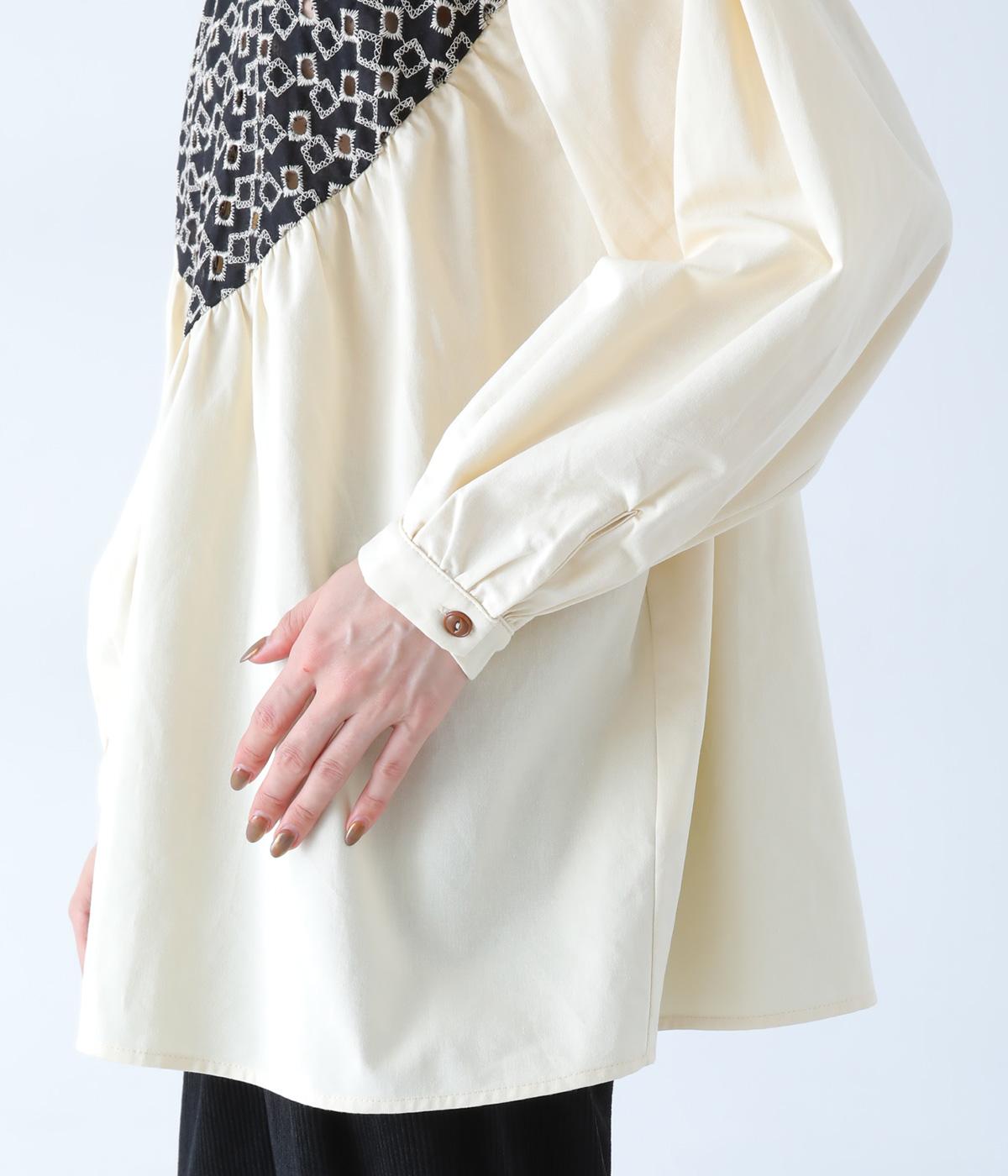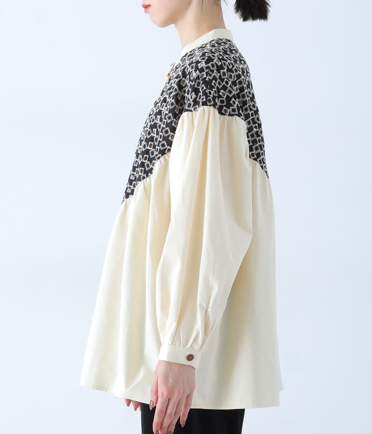 ヨーク部分に透かし柄の刺しゅうをあしらった異素材ミックス。ベースの無地はやわらかなコットンで、着心地よく仕上げています。