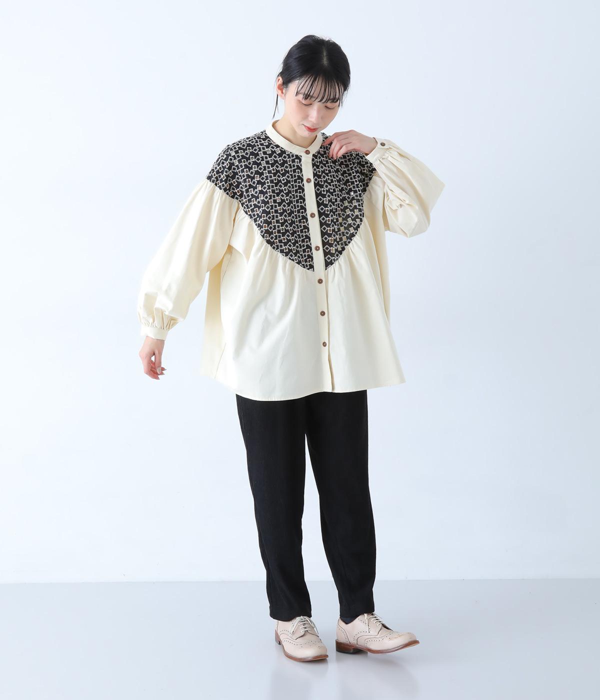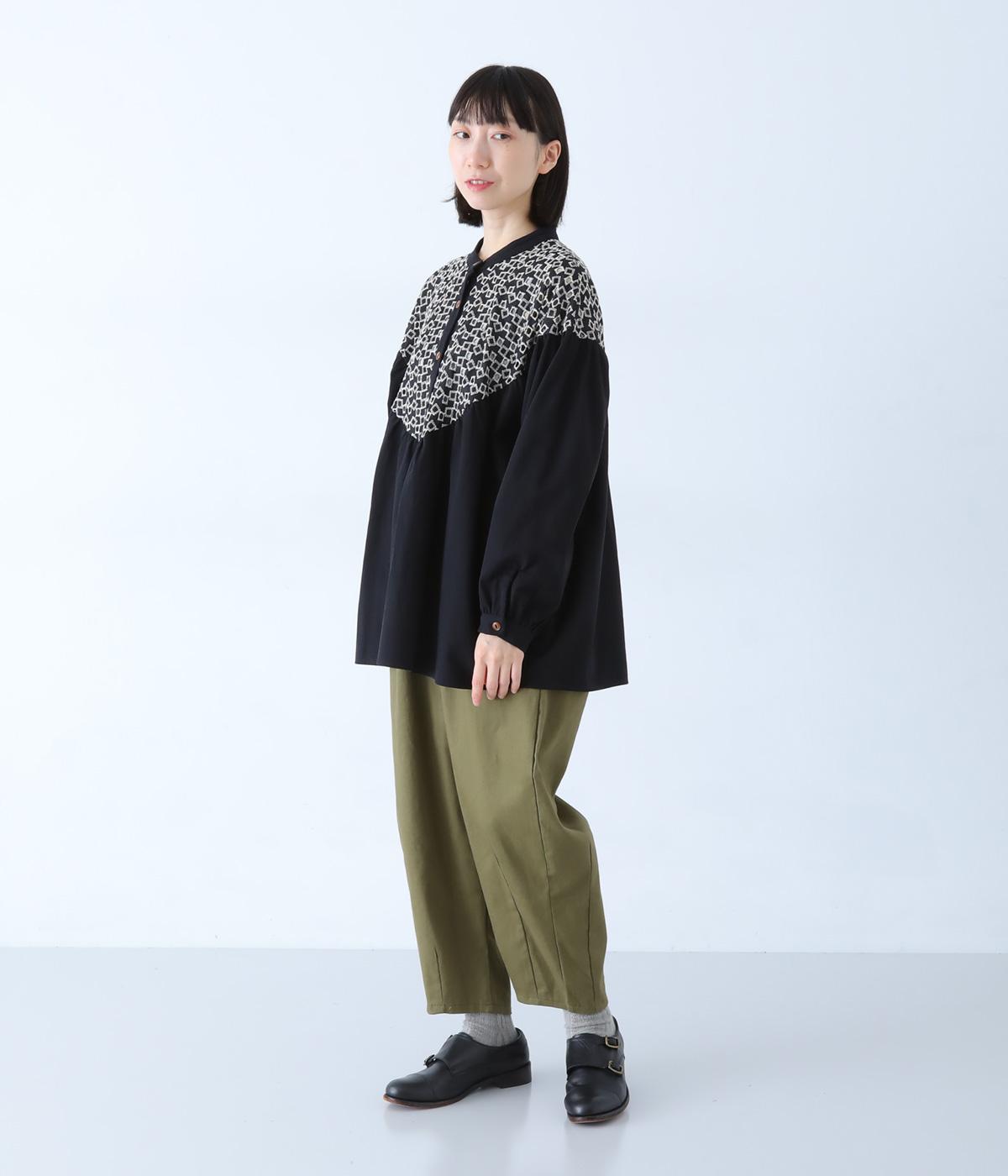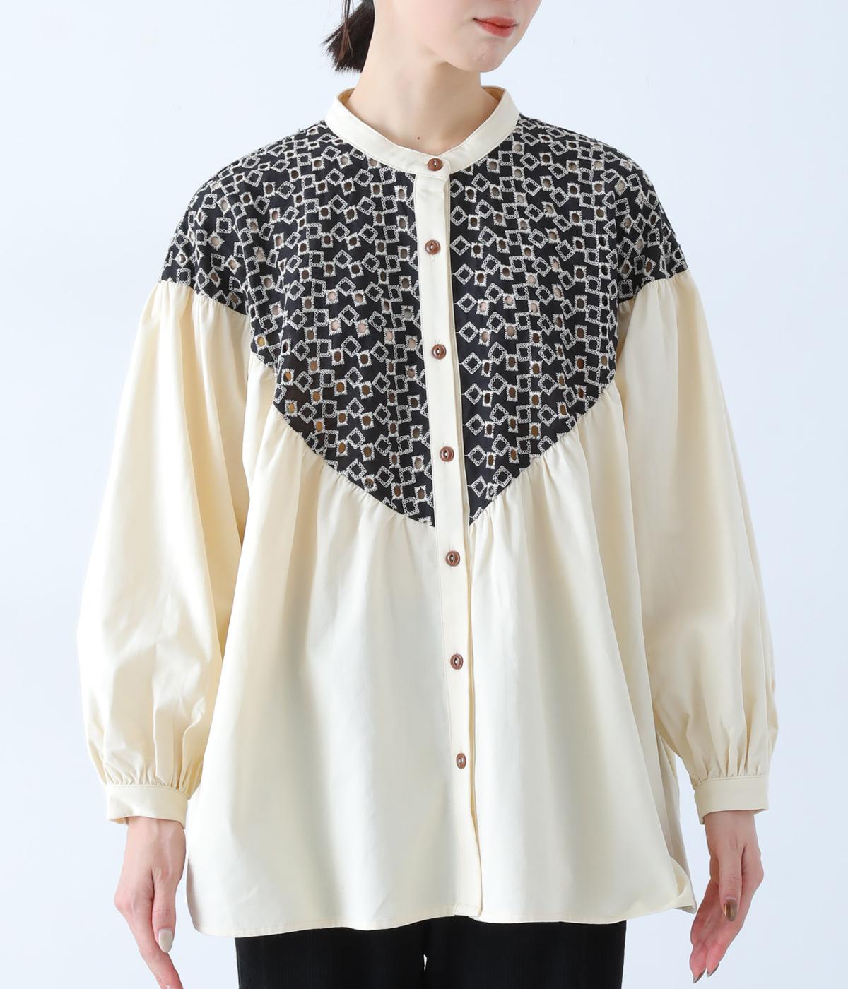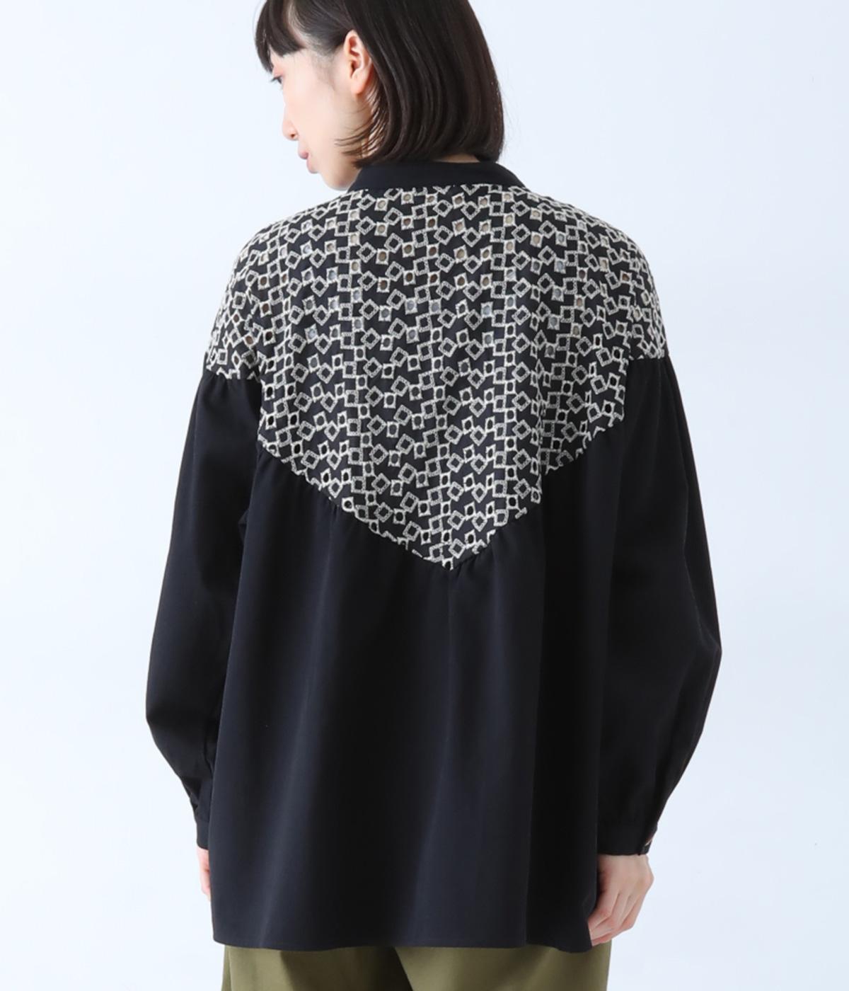 ヨーク部分に透かし柄の刺しゅうをあしらった異素材ミックス。ベースの無地はやわらかなコットンで、着心地よく仕上げています。