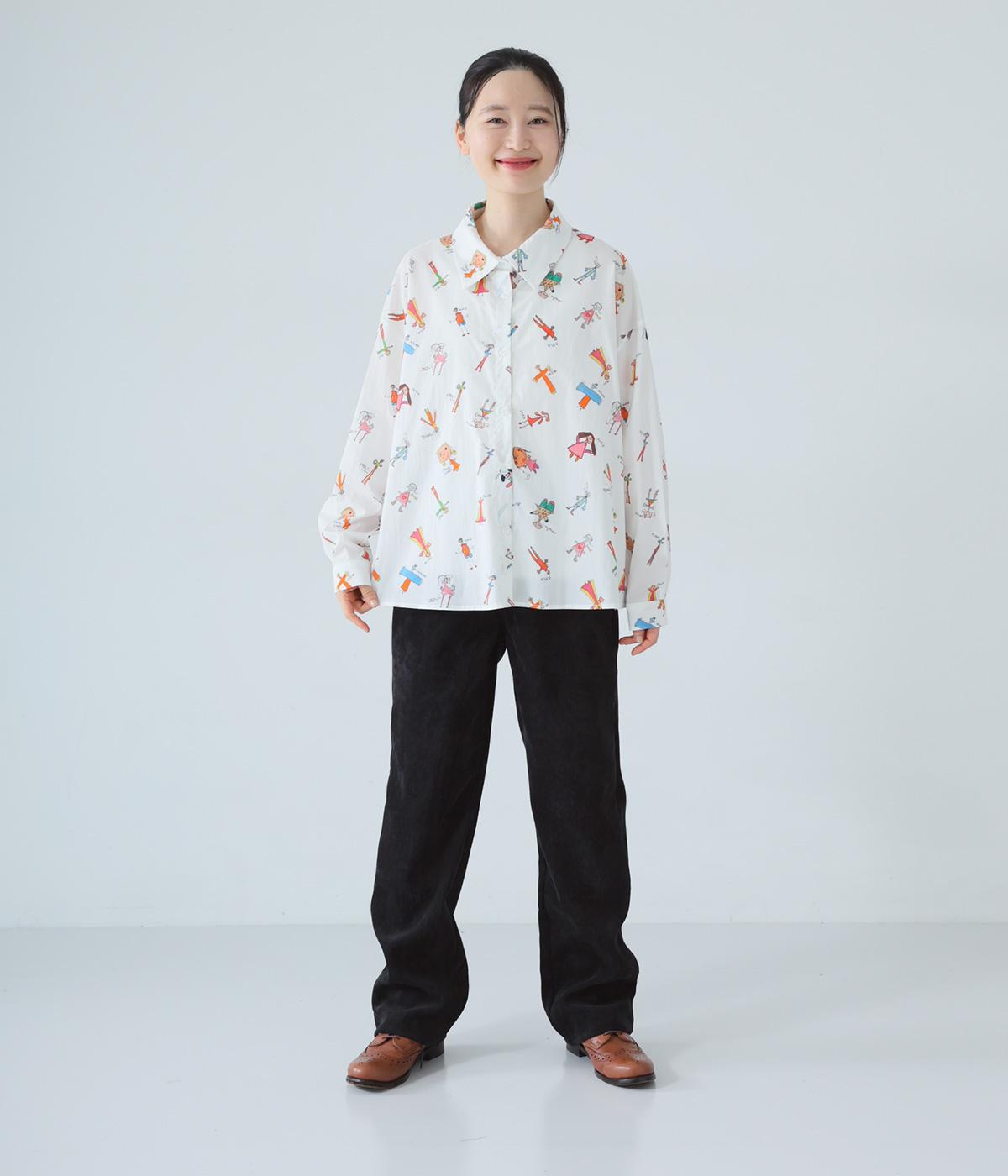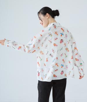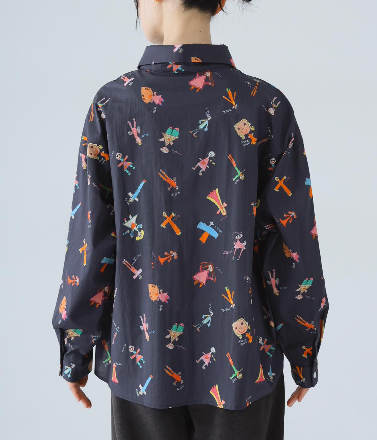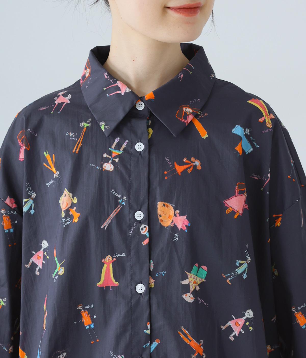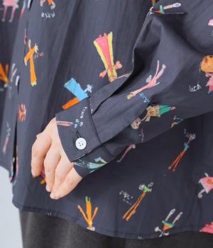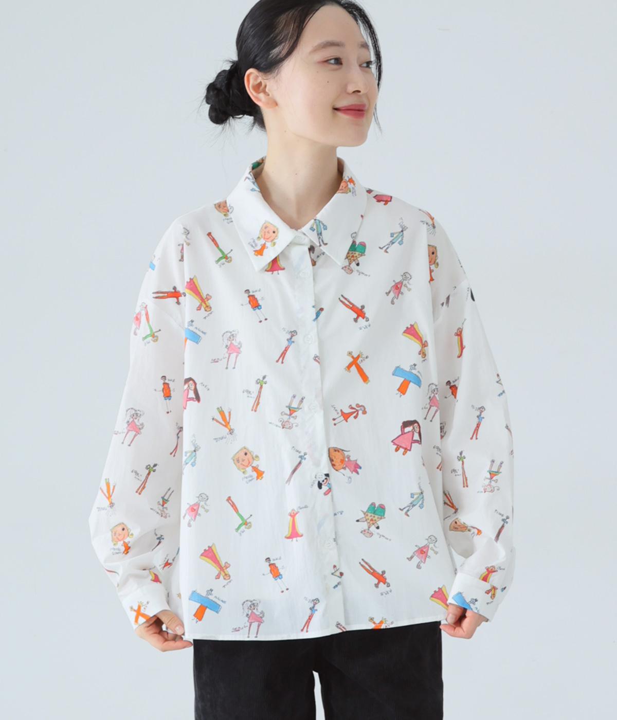 シャツをキャンバスに子どもが描いたような、カラフルでユニークなプリントが目を引きます。ゆったりとしたサイズ感と長めの袖丈がこなれ感たっぷり。少し大きめの襟が顔まわりをすっきりと見せてくれます。Tシャツなどにさっと羽織った着こなしもおすすめです。