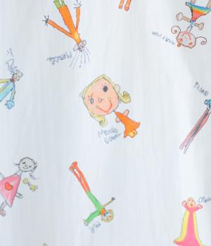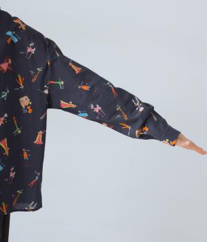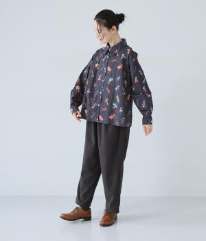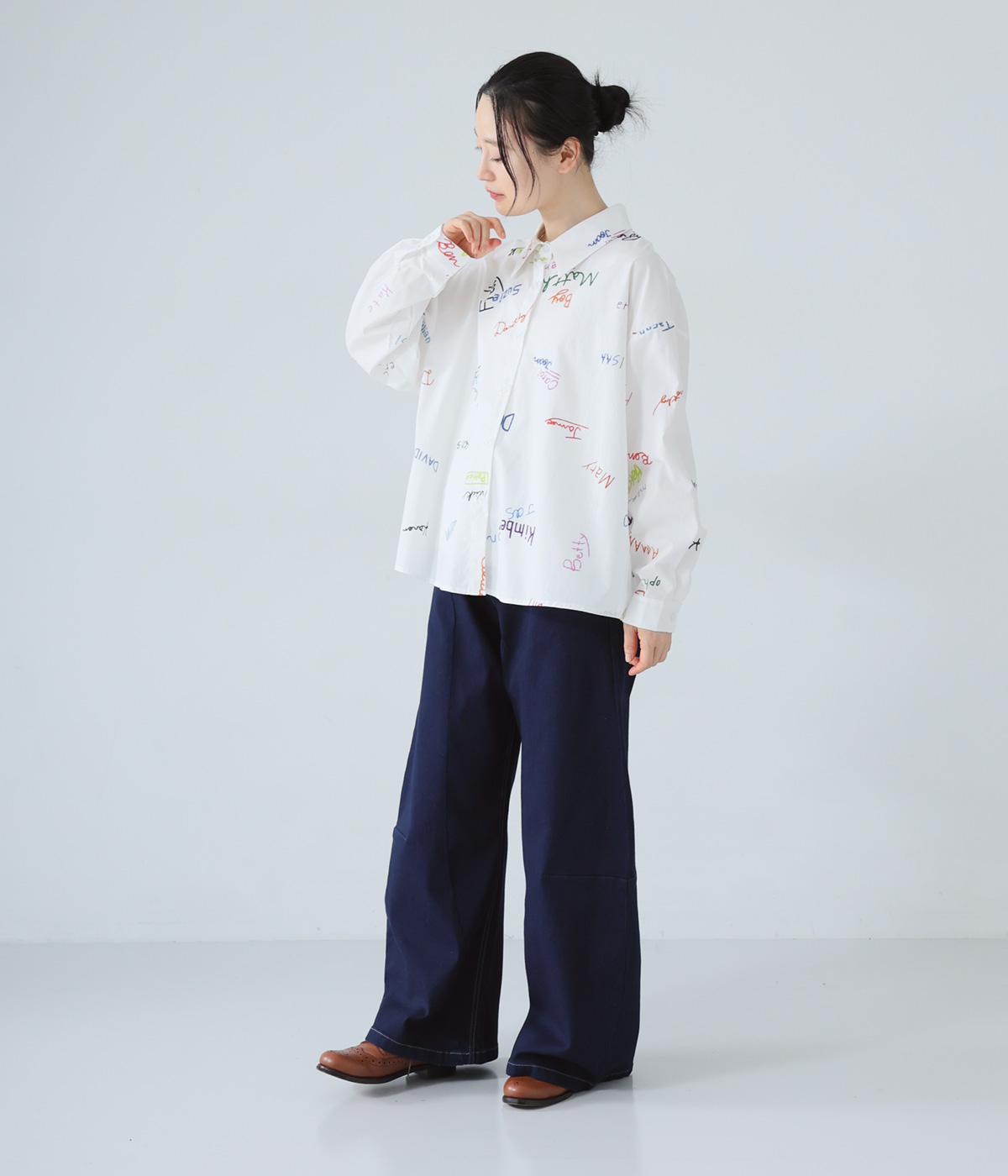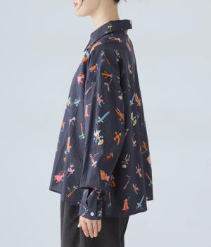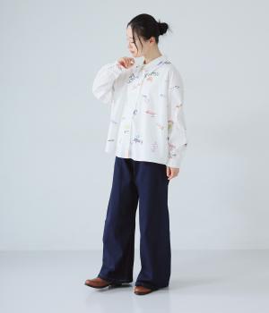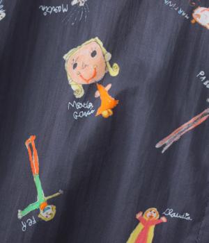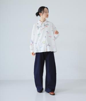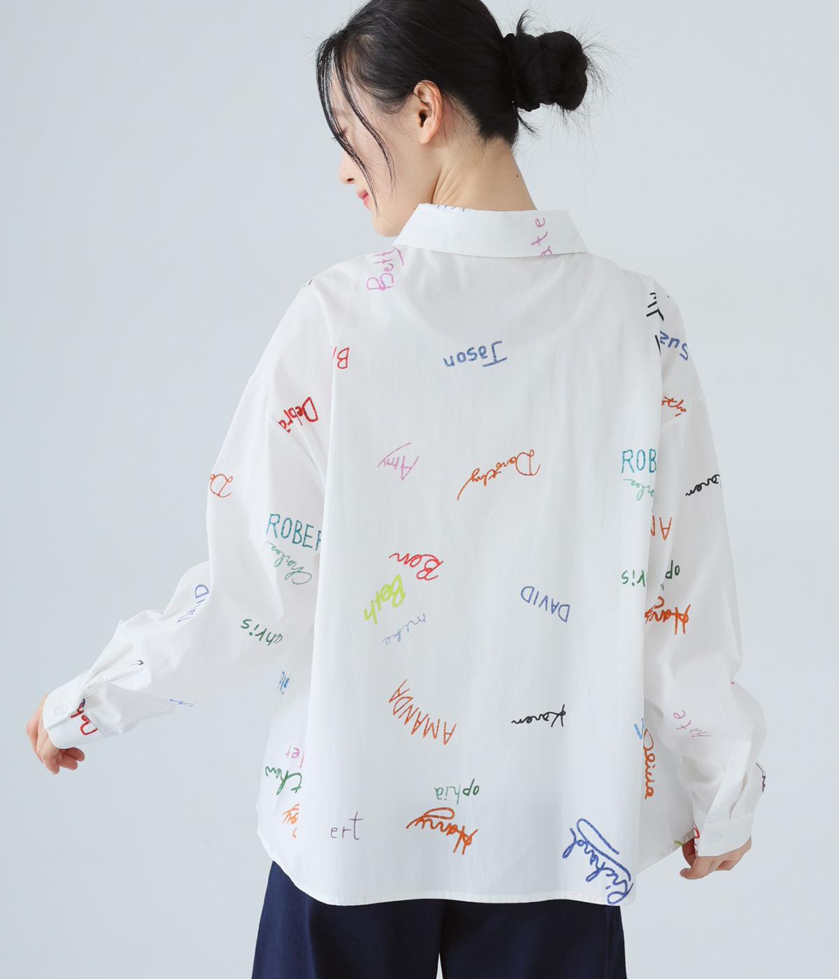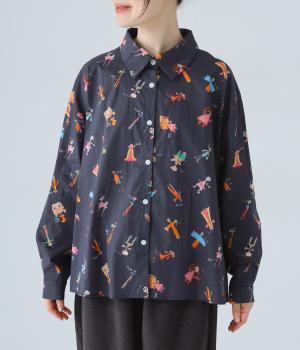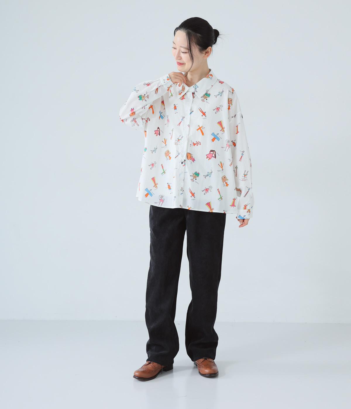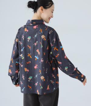 シャツをキャンバスに子どもが描いたような、カラフルでユニークなプリントが目を引きます。ゆったりとしたサイズ感と長めの袖丈がこなれ感たっぷり。少し大きめの襟が顔まわりをすっきりと見せてくれます。Tシャツなどにさっと羽織った着こなしもおすすめです。