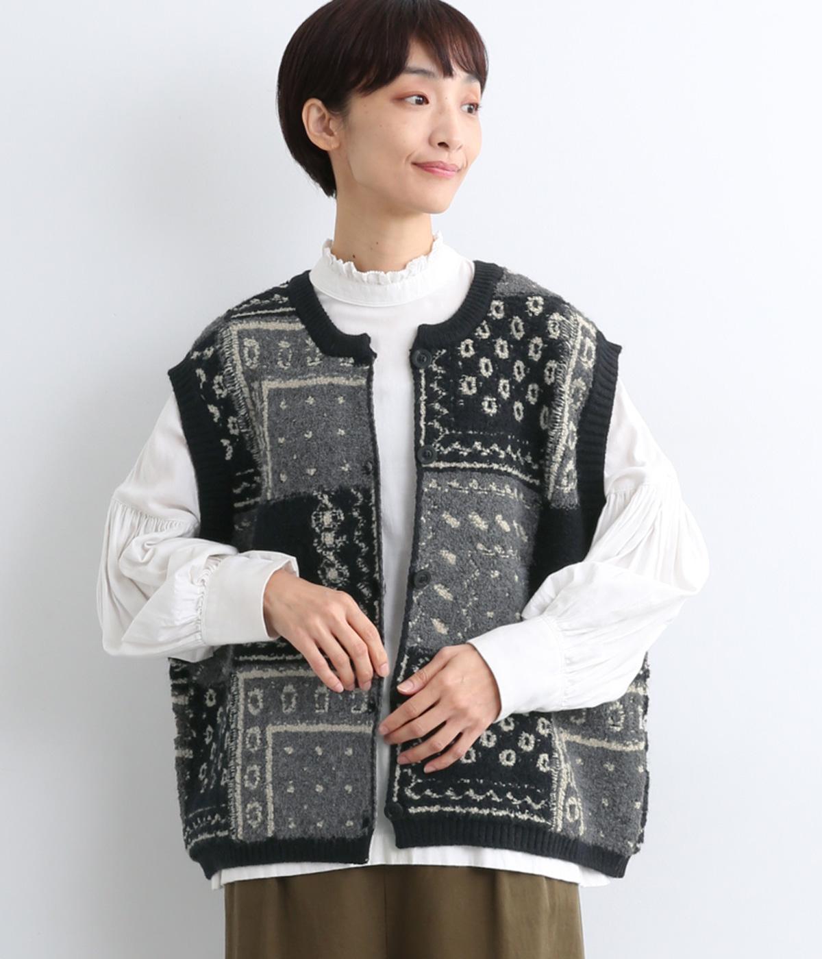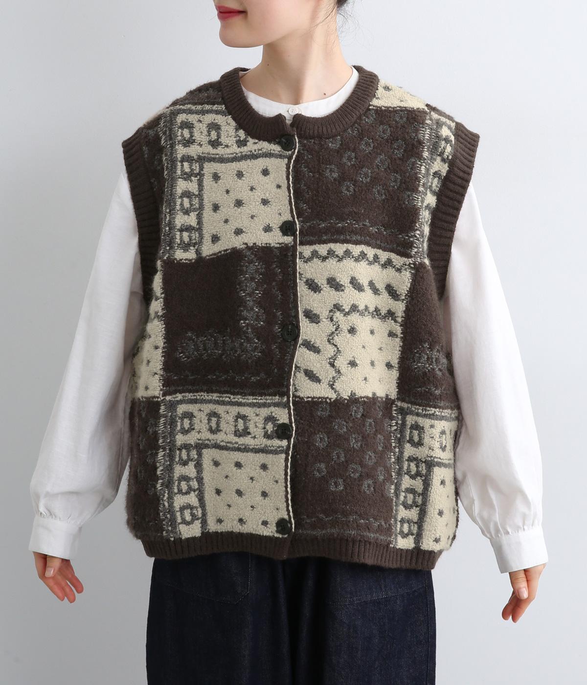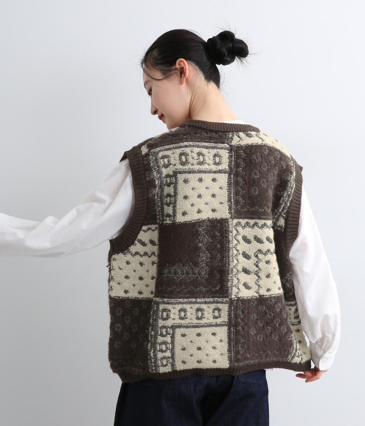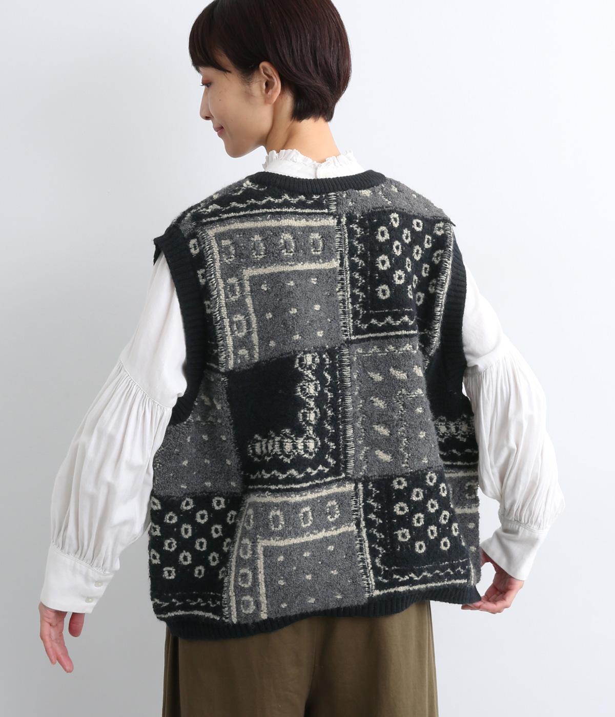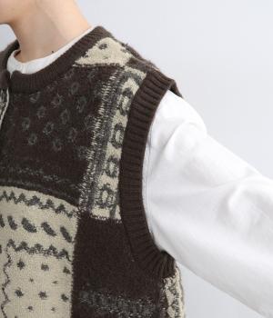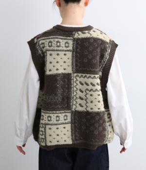 パッチワークのように四角く区切られた配色がユニークなニットベスト。横に張り出した前後の身頃が体のラインをカバーし、腕や肩まわりをすっきりと見せてくれます。普段の何気ない装いにプラスするだけで、華やかなレイヤードスタイルが完成するアイテムです。