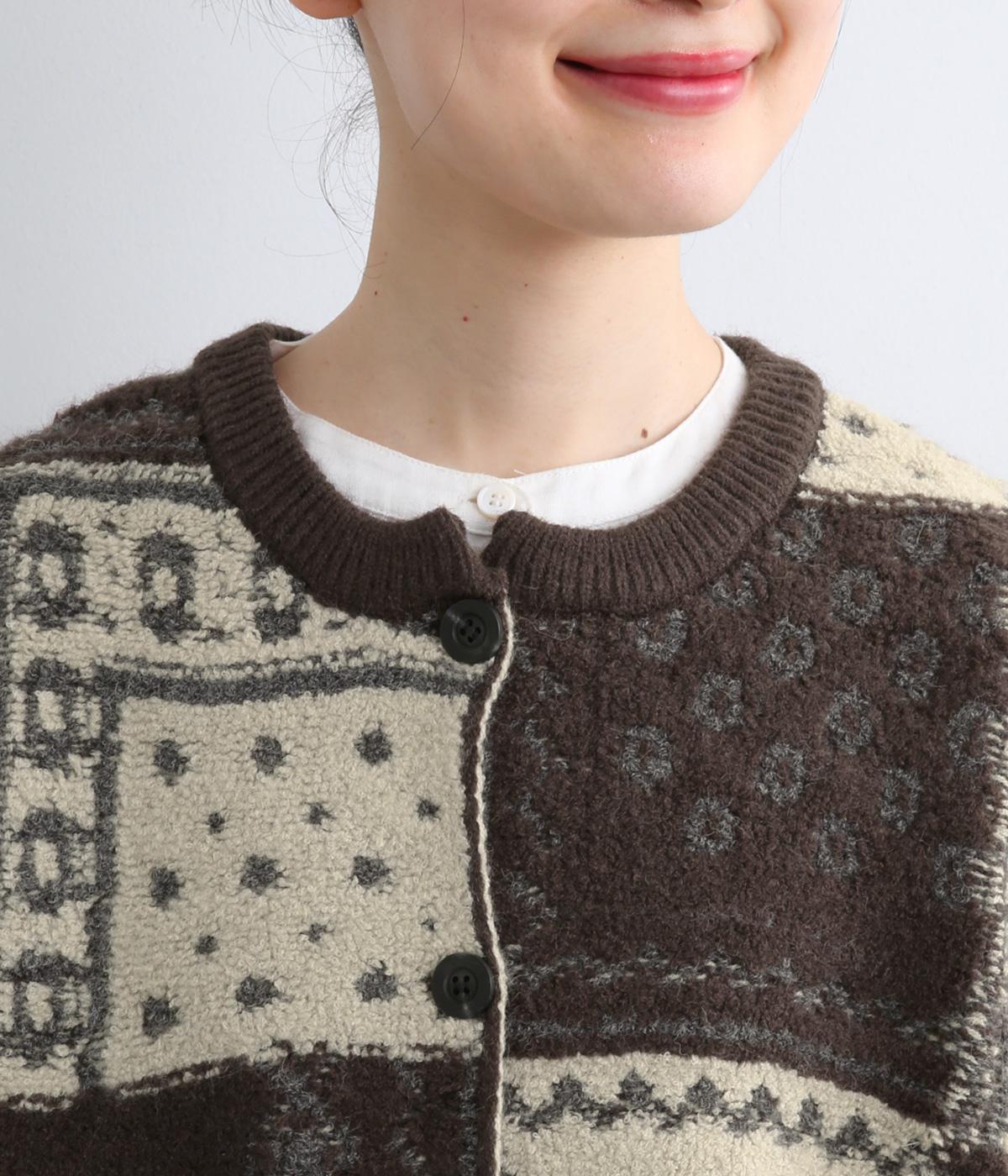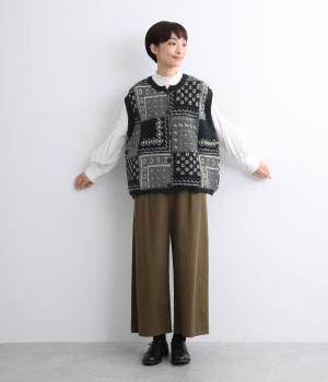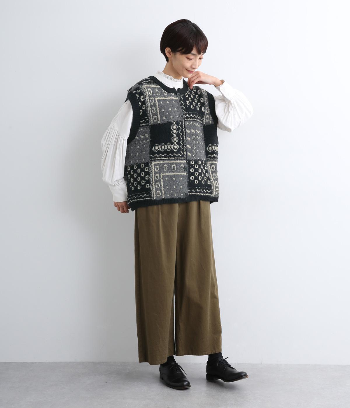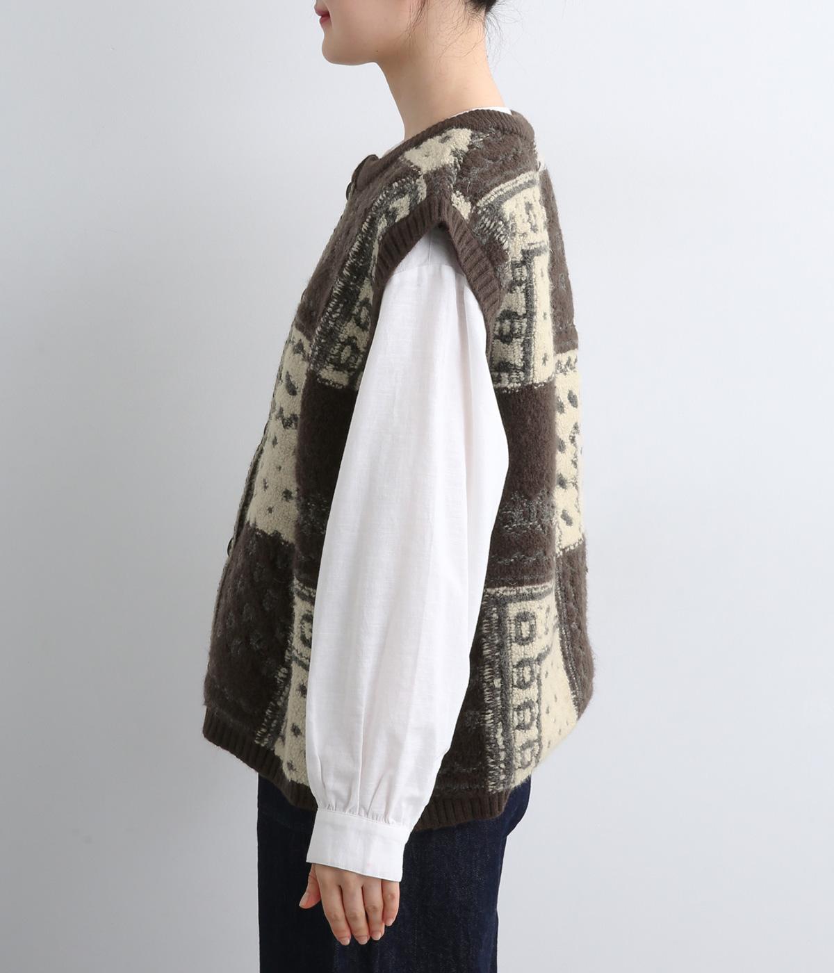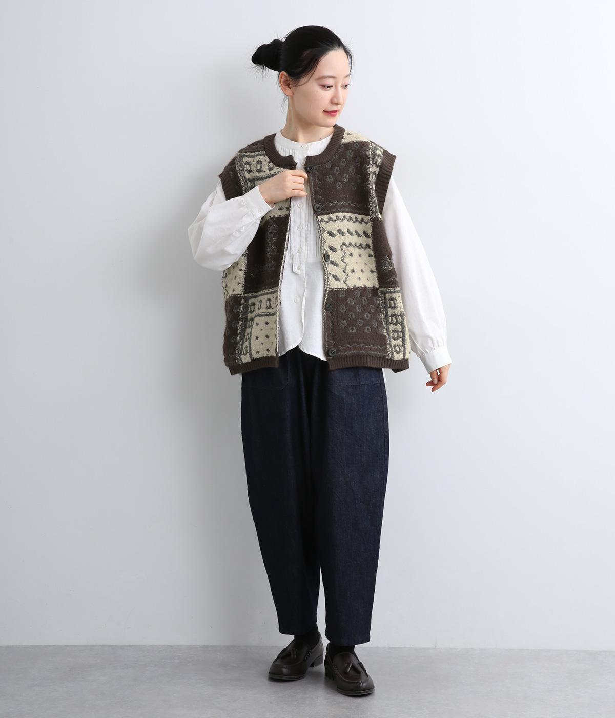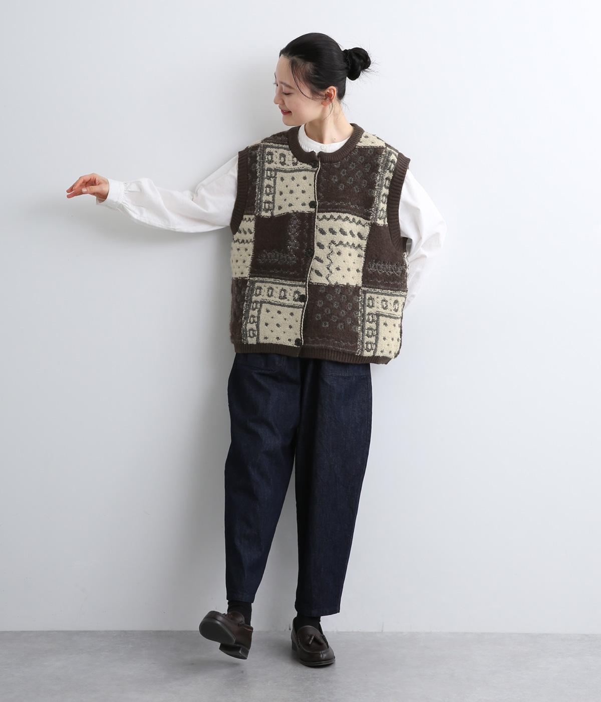パッチワークのように四角く区切られた配色がユニークなニットベスト。横に張り出した前後の身頃が体のラインをカバーし、腕や肩まわりをすっきりと見せてくれます。普段の何気ない装いにプラスするだけで、華やかなレイヤードスタイルが完成するアイテムです。
