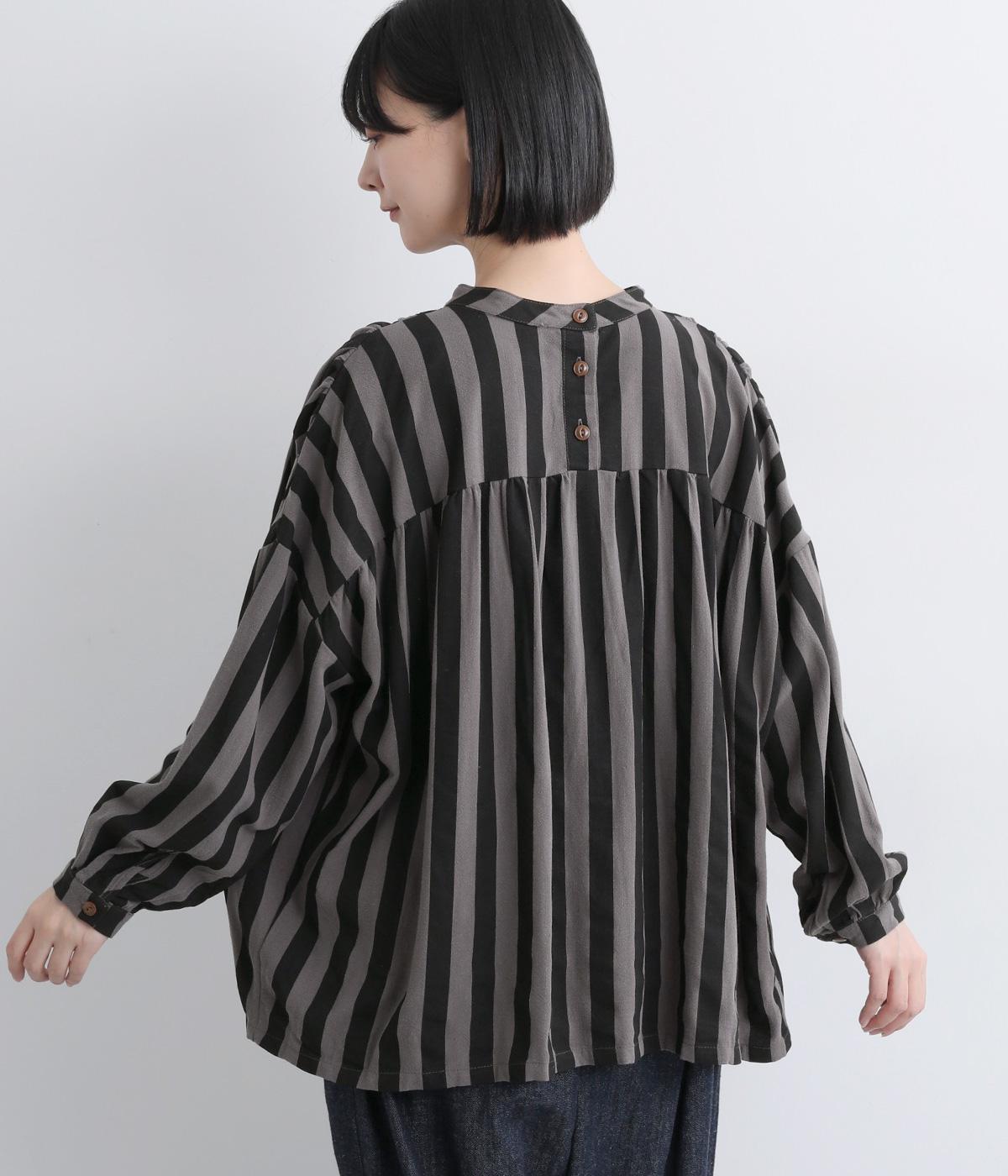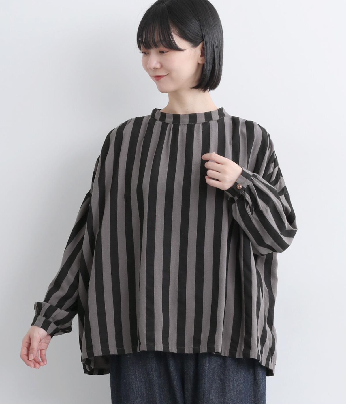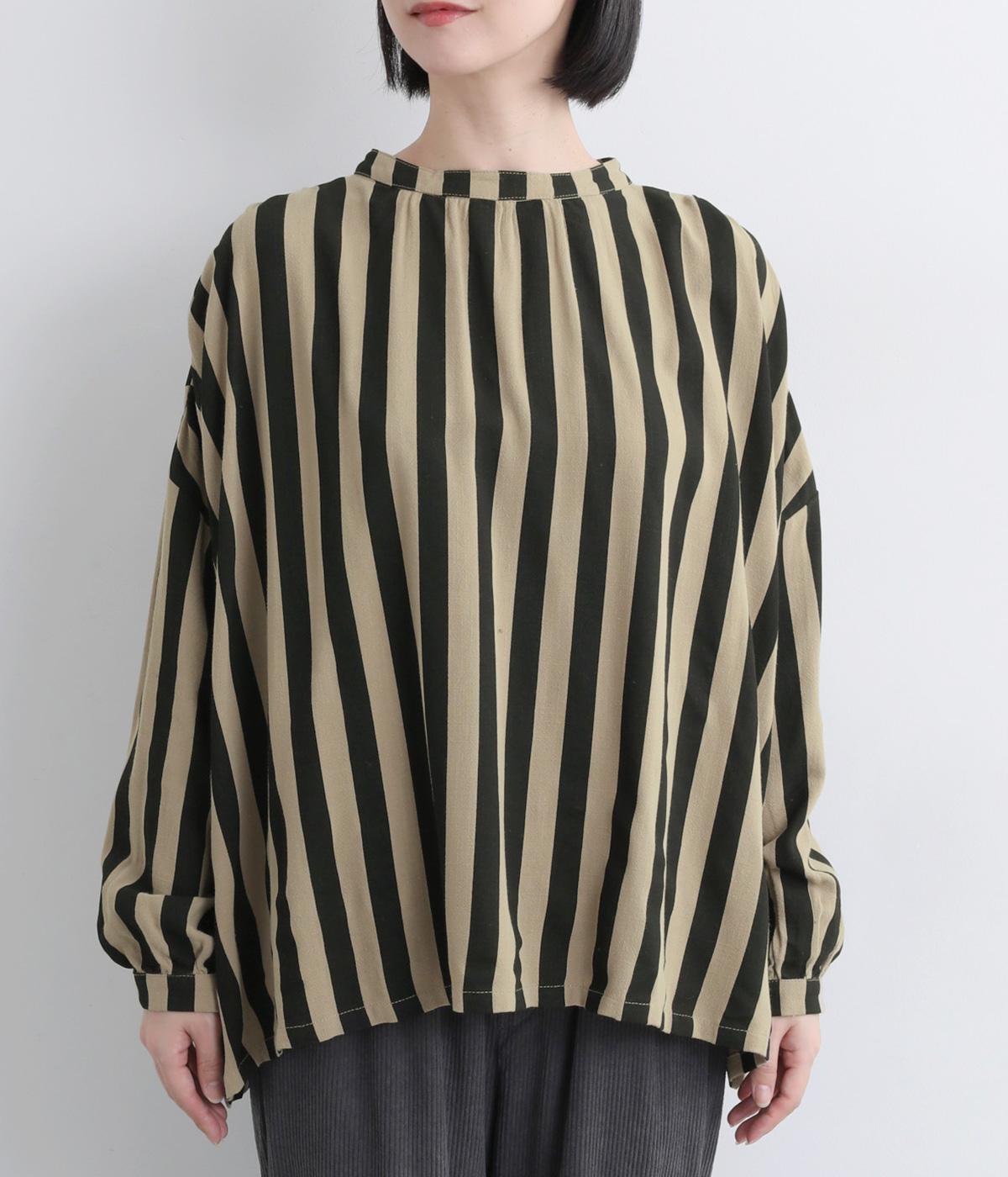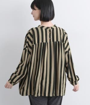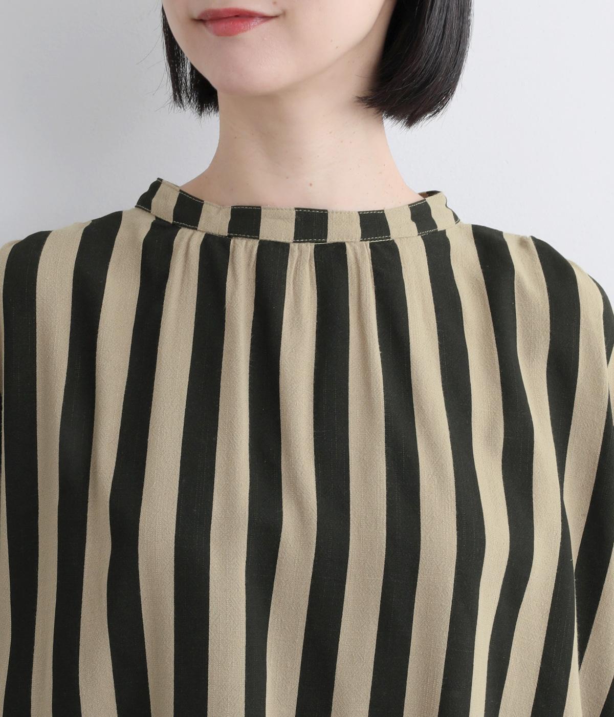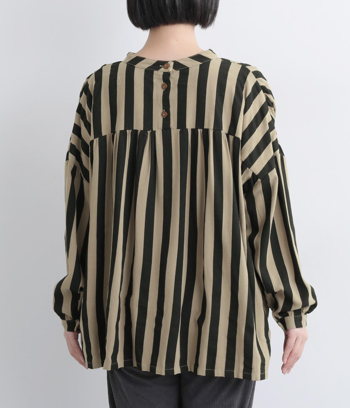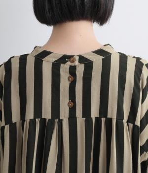 存在感のあるストライプ柄が、コーディネートに洗練されたアクセントを添える一枚。背中の切り替えに寄せたギャザーが、丸みのあるシルエットをつくり、女性らしさを引き立てます。後ろボタンのデザインが、クラシカルな印象をプラス。ゆったりとしたラインで体を包み、抜け感のあるスタイルをたのしめます。