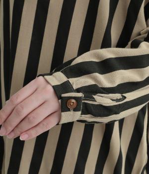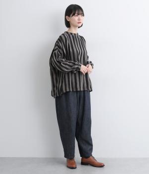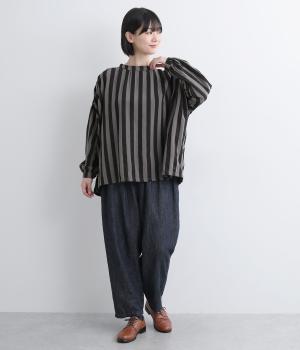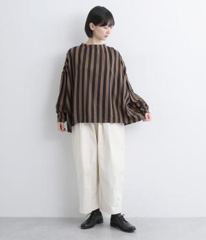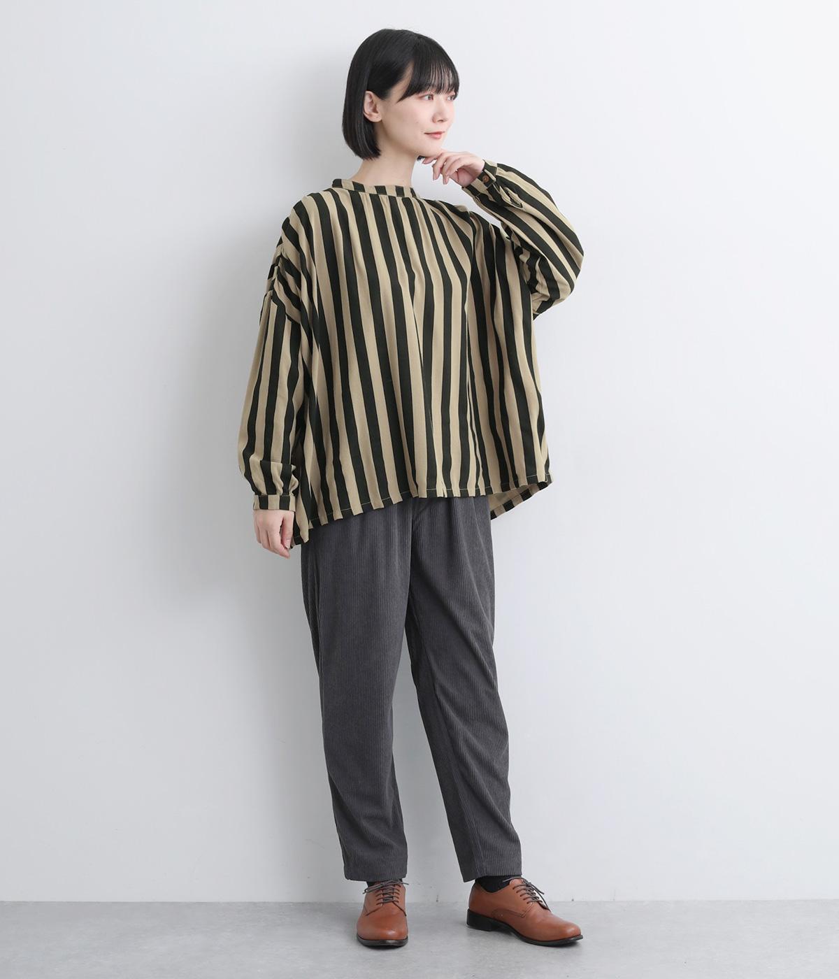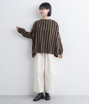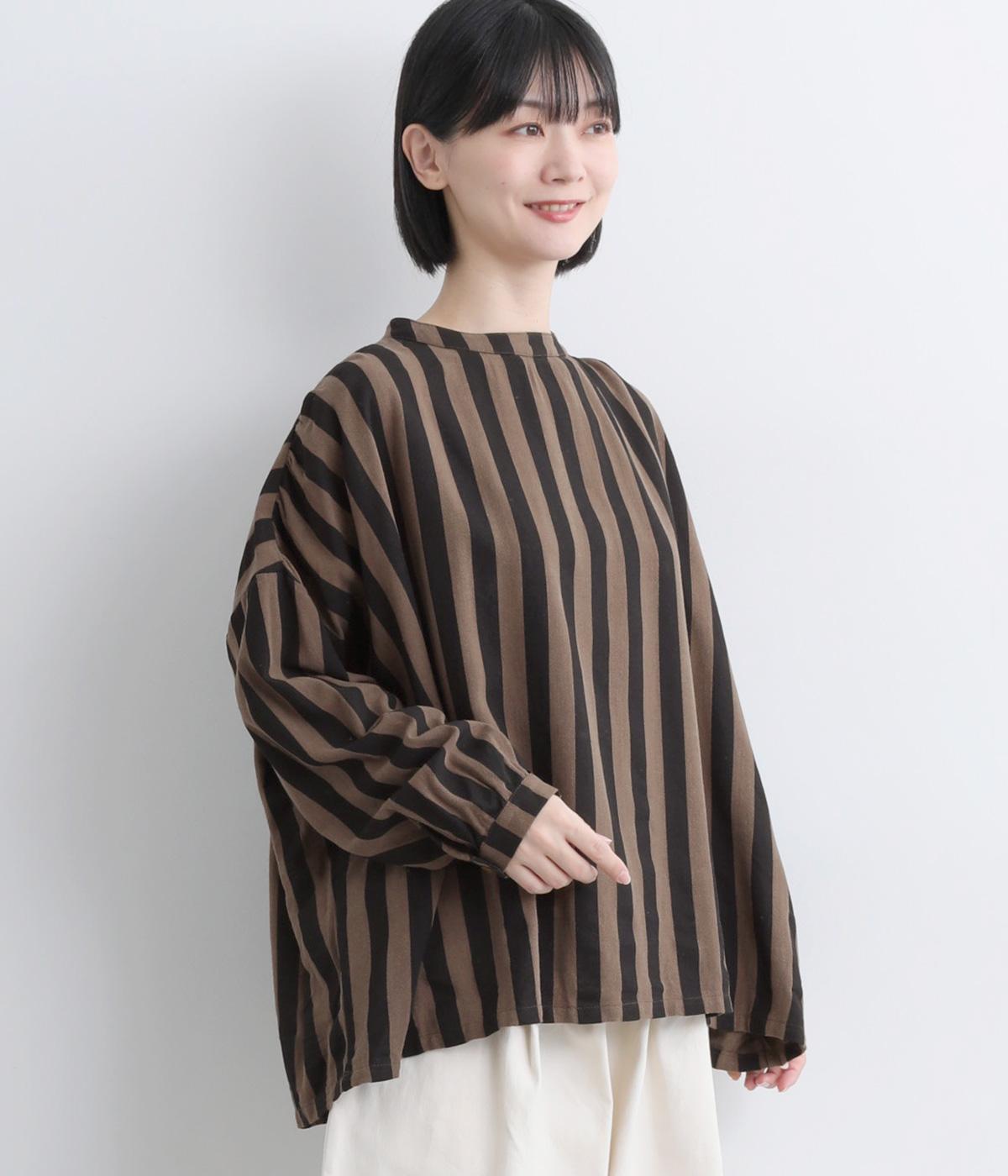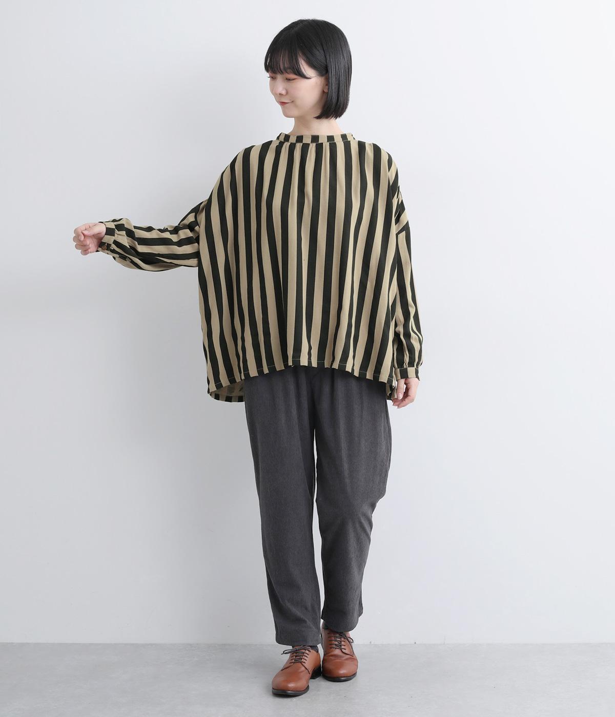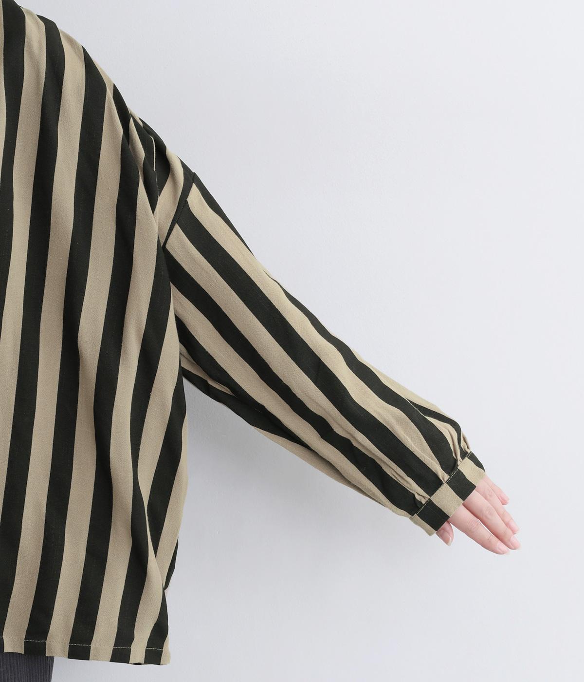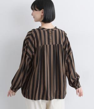 存在感のあるストライプ柄が、コーディネートに洗練されたアクセントを添える一枚。背中の切り替えに寄せたギャザーが、丸みのあるシルエットをつくり、女性らしさを引き立てます。後ろボタンのデザインが、クラシカルな印象をプラス。ゆったりとしたラインで体を包み、抜け感のあるスタイルをたのしめます。