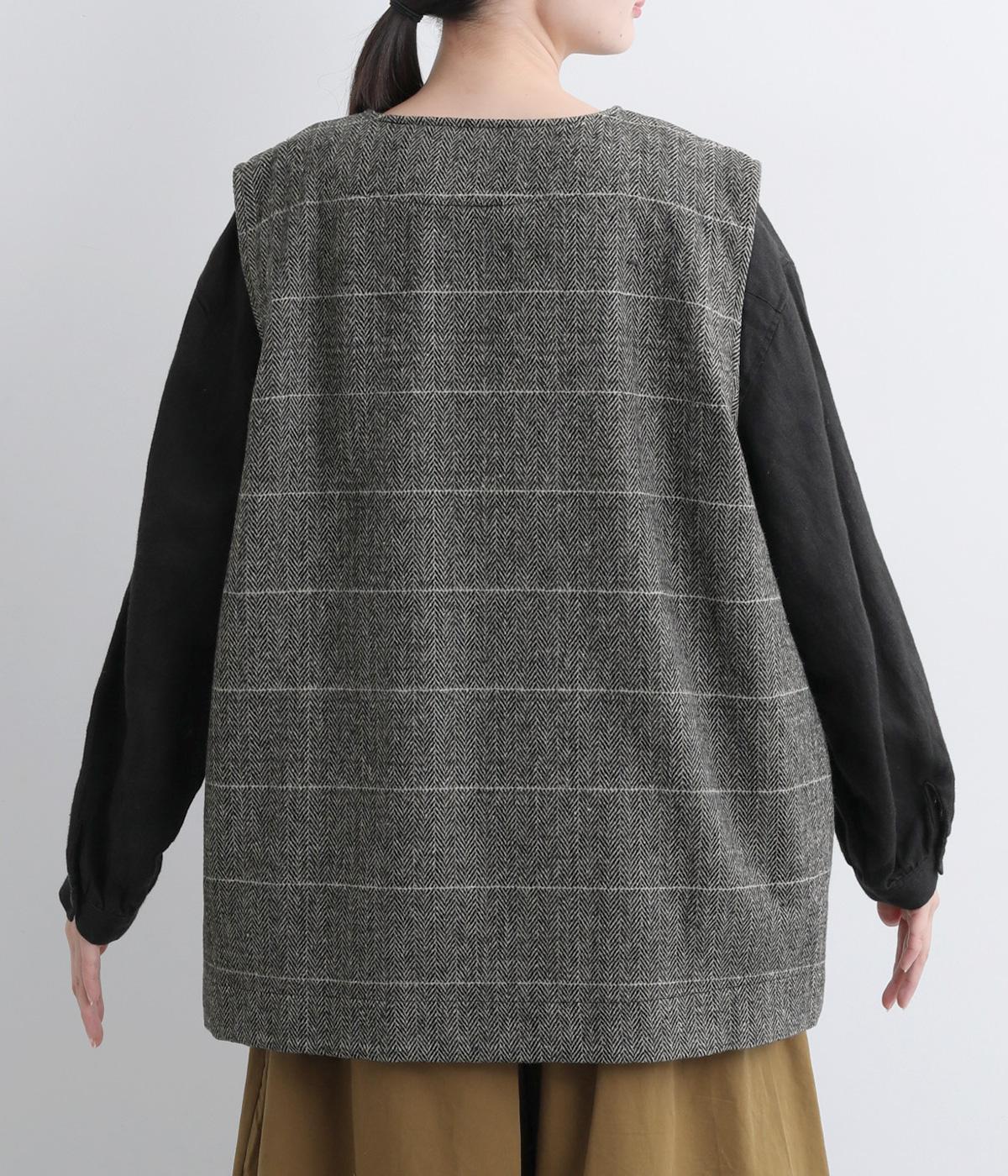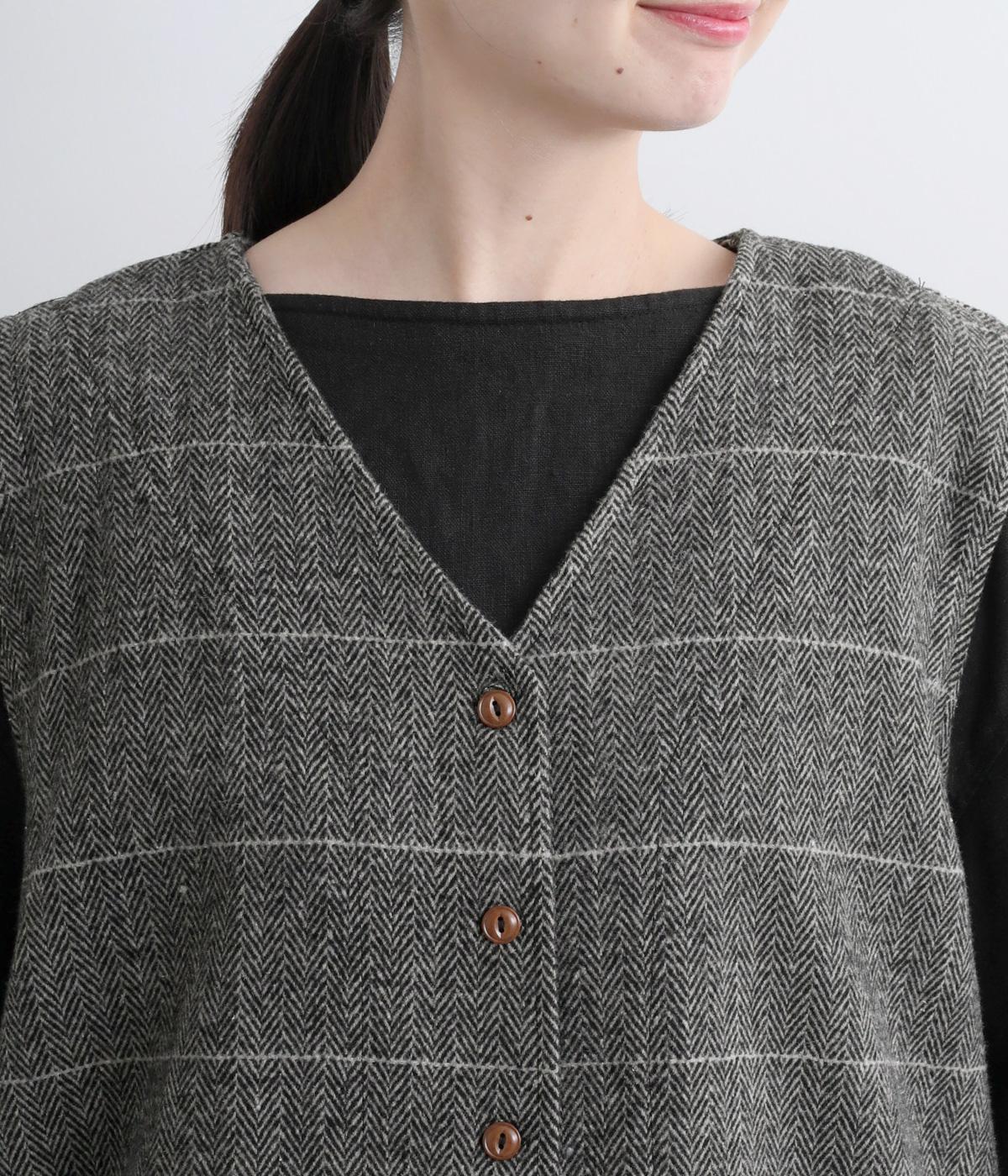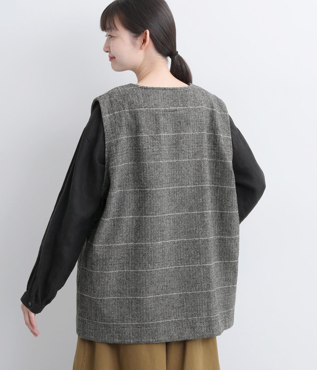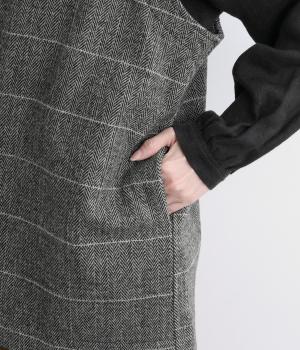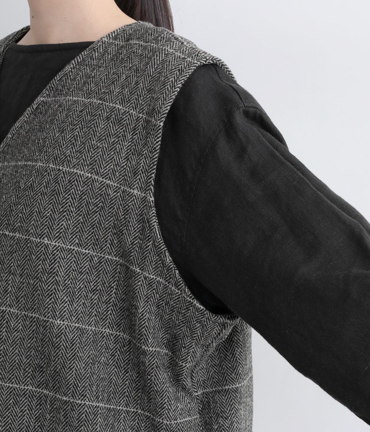 シックなヘリンボン柄と、直線的なシルエットが調和したミドル丈ベストです。少しだけ落とした肩のラインと、ほどよい深さのVネックが抜け感を生み、重ね着してもすっきりとした印象に。やや長めの丈感が気になる腰まわりをさりげなくカバーし、全体のバランスを整えます。