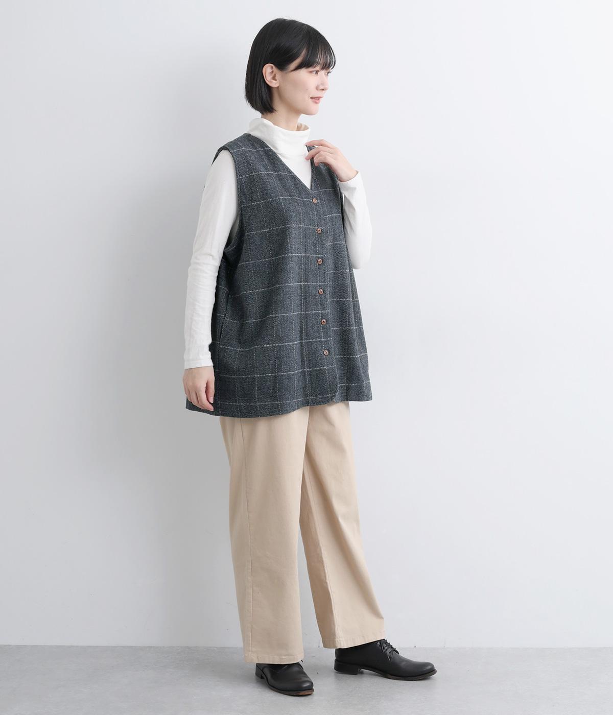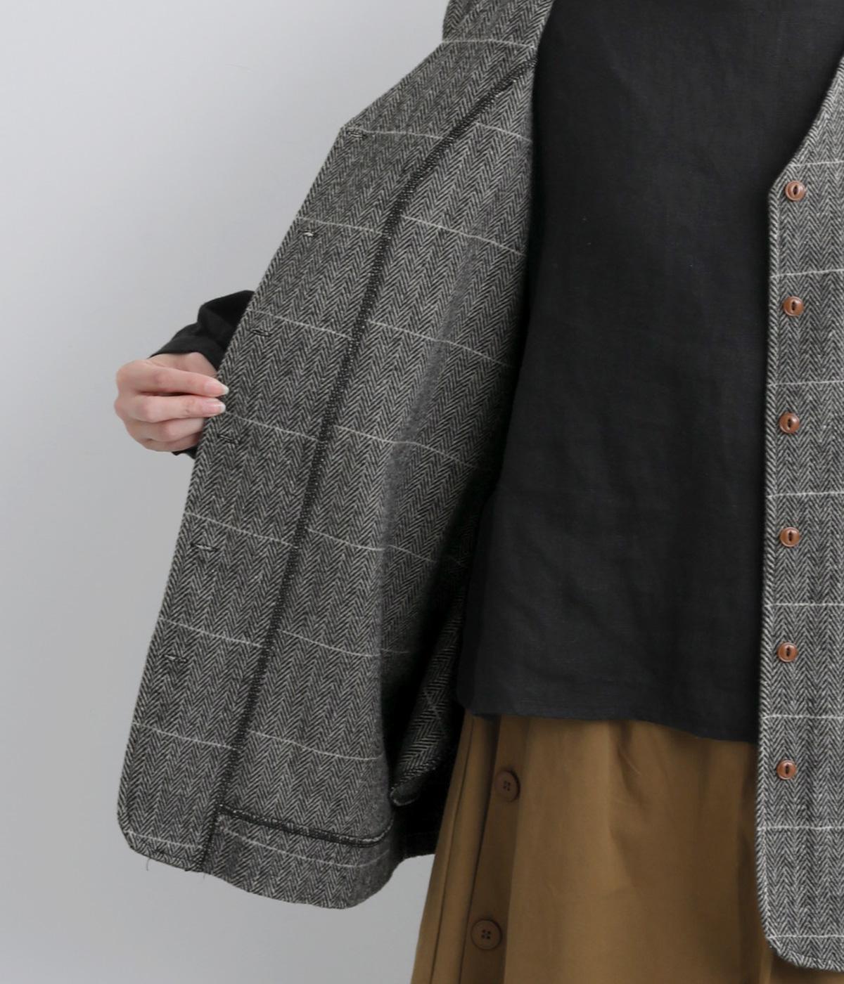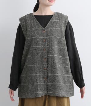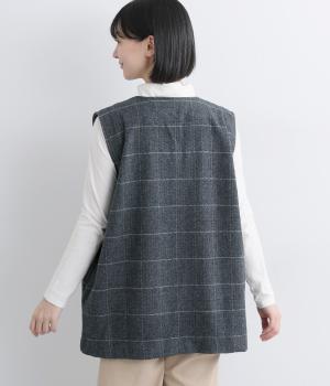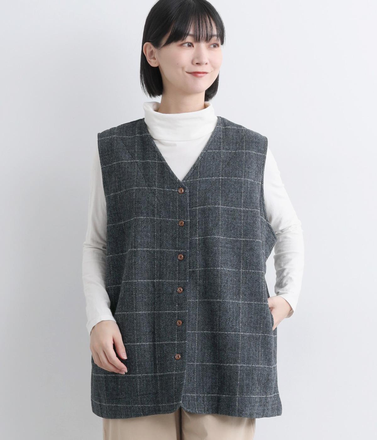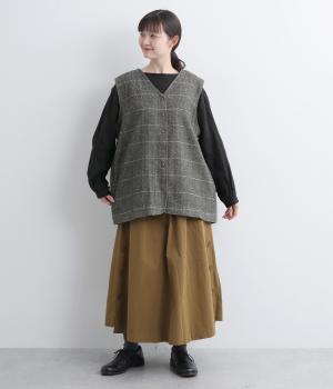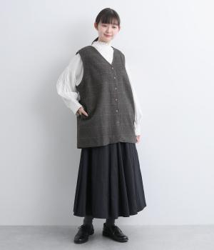シックなヘリンボン柄と、直線的なシルエットが調和したミドル丈ベストです。少しだけ落とした肩のラインと、ほどよい深さのVネックが抜け感を生み、重ね着してもすっきりとした印象に。やや長めの丈感が気になる腰まわりをさりげなくカバーし、全体のバランスを整えます。