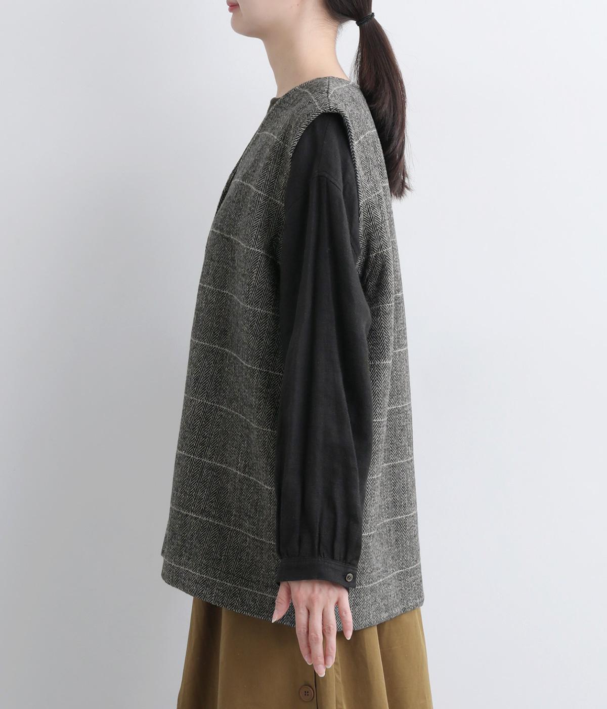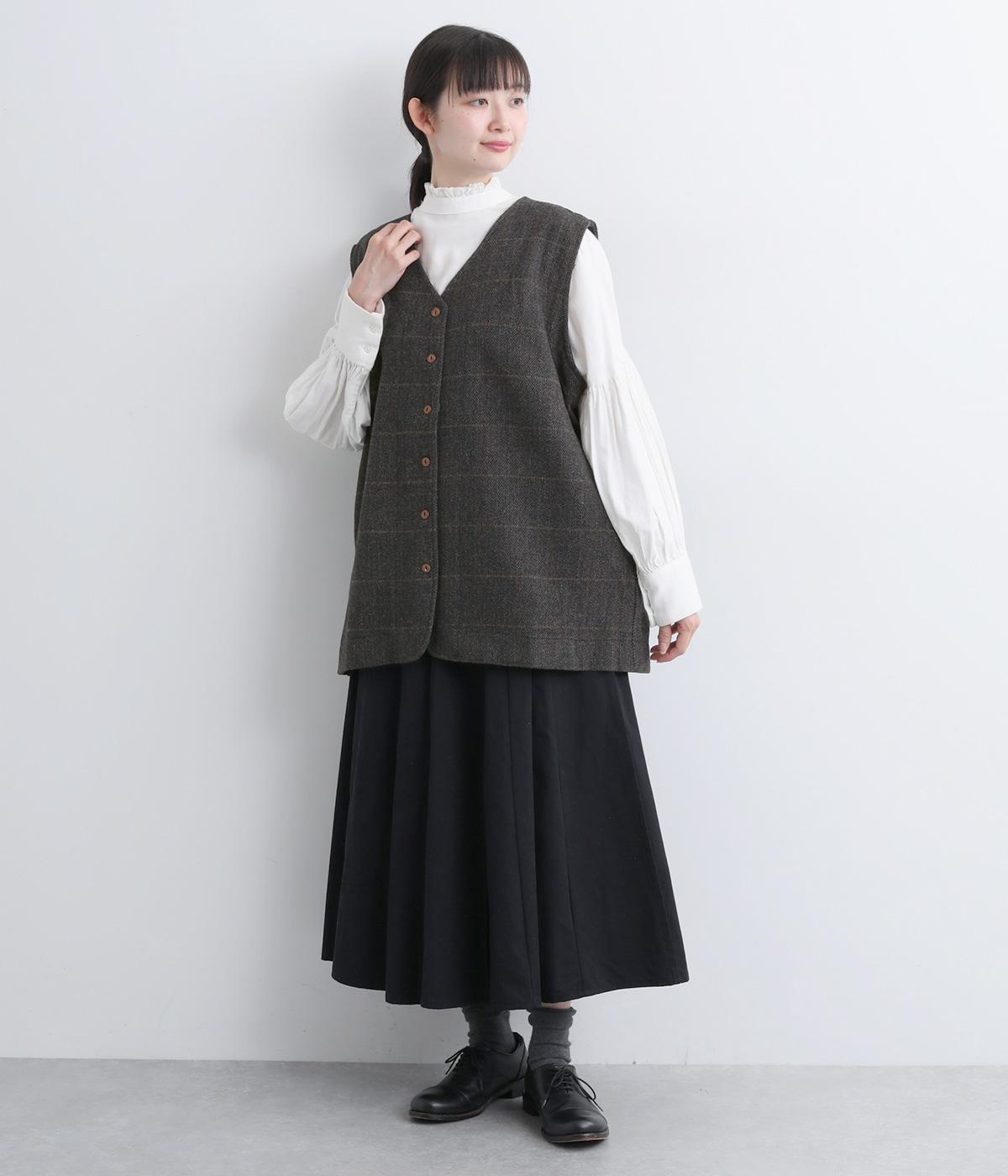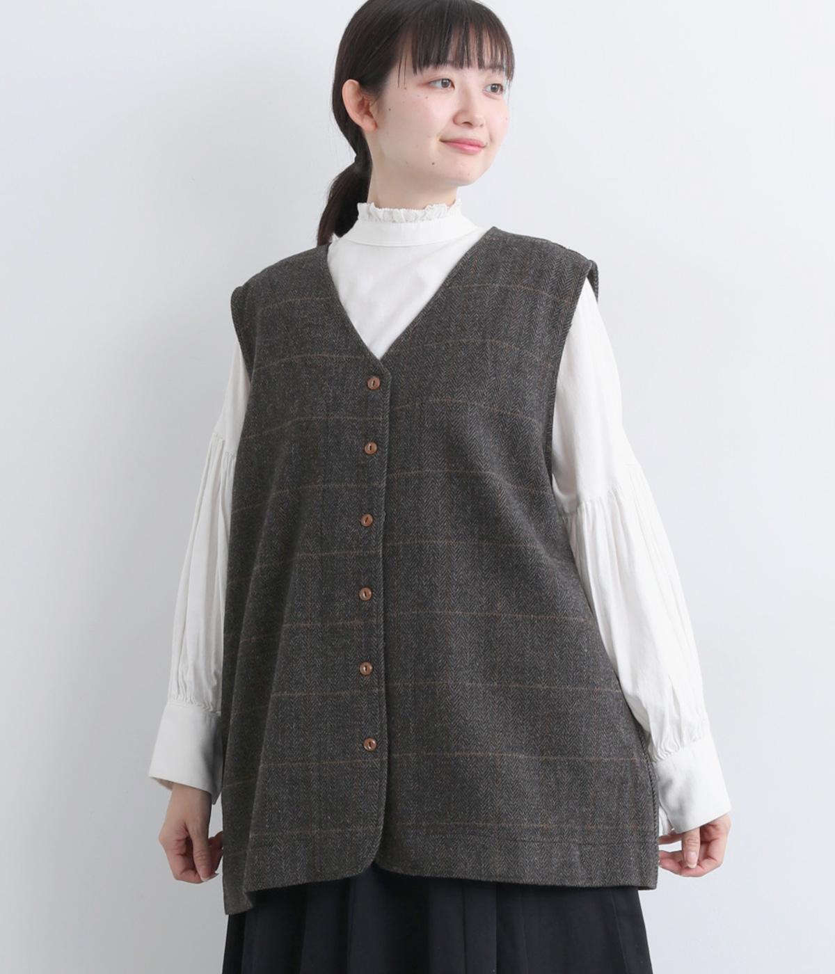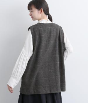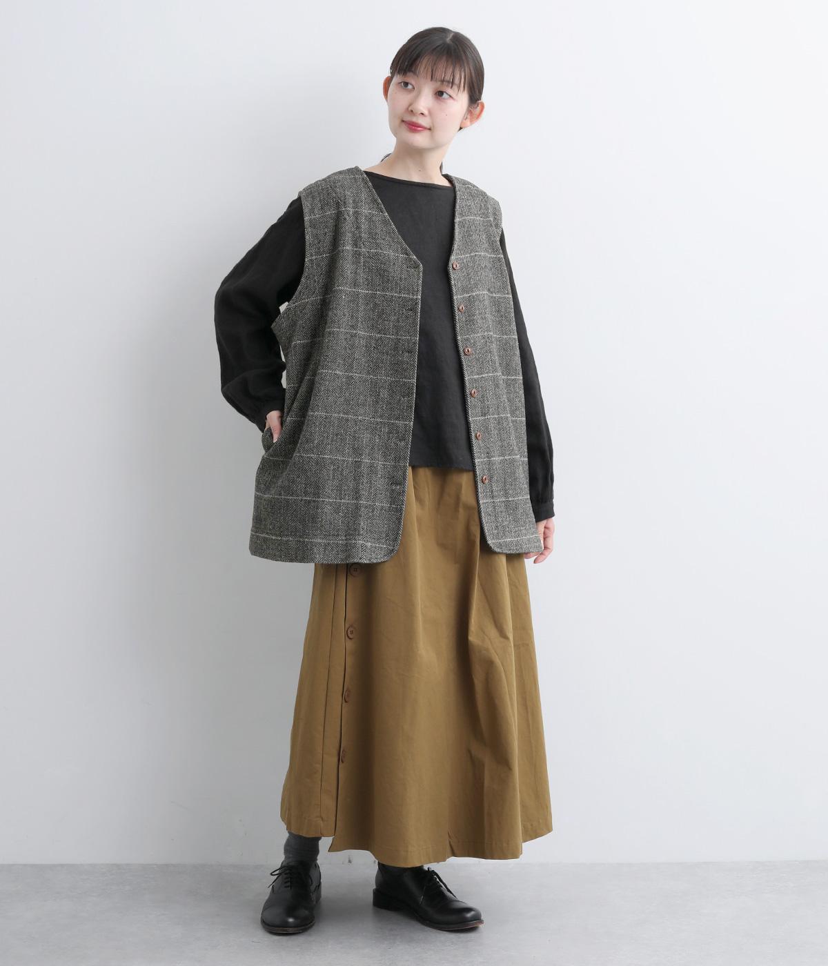 シックなヘリンボン柄と、直線的なシルエットが調和したミドル丈ベストです。少しだけ落とした肩のラインと、ほどよい深さのVネックが抜け感を生み、重ね着してもすっきりとした印象に。やや長めの丈感が気になる腰まわりをさりげなくカバーし、全体のバランスを整えます。